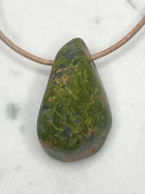 Ein von Hand geschliffener Anhänger mit polierter Oberfläche aus dem edlen Grün- und Rosa-Material – Unakit; auch “Epidot” genannt.