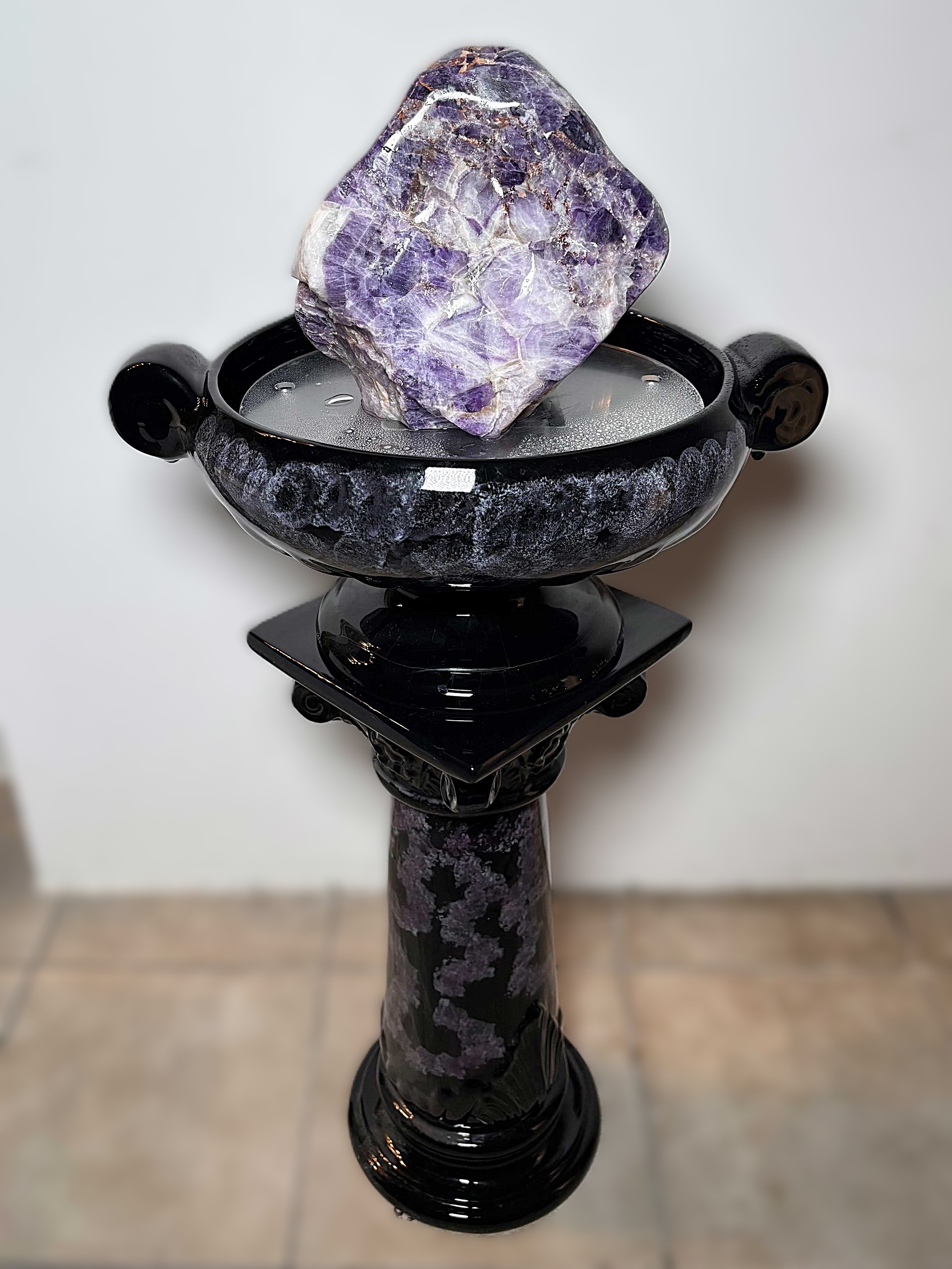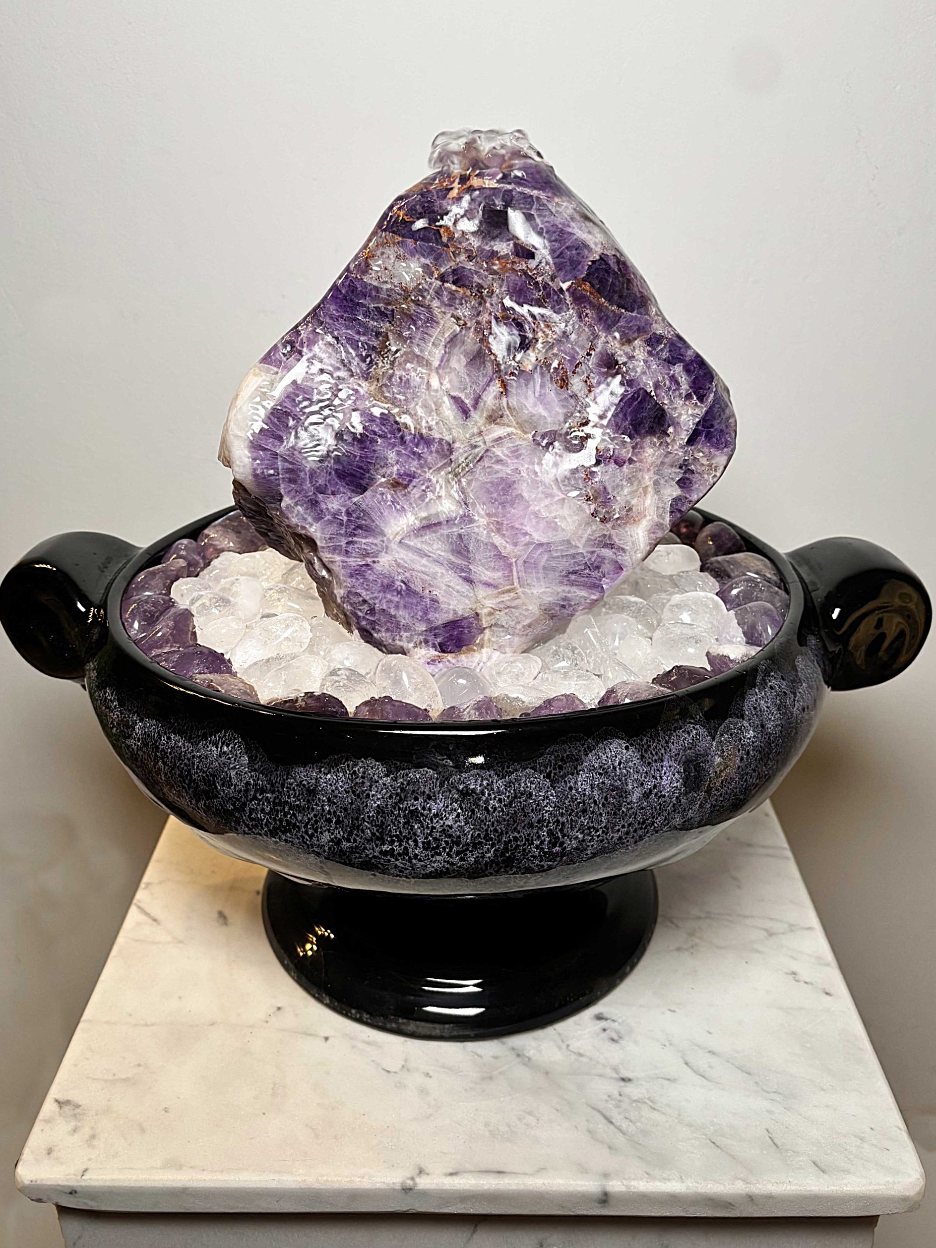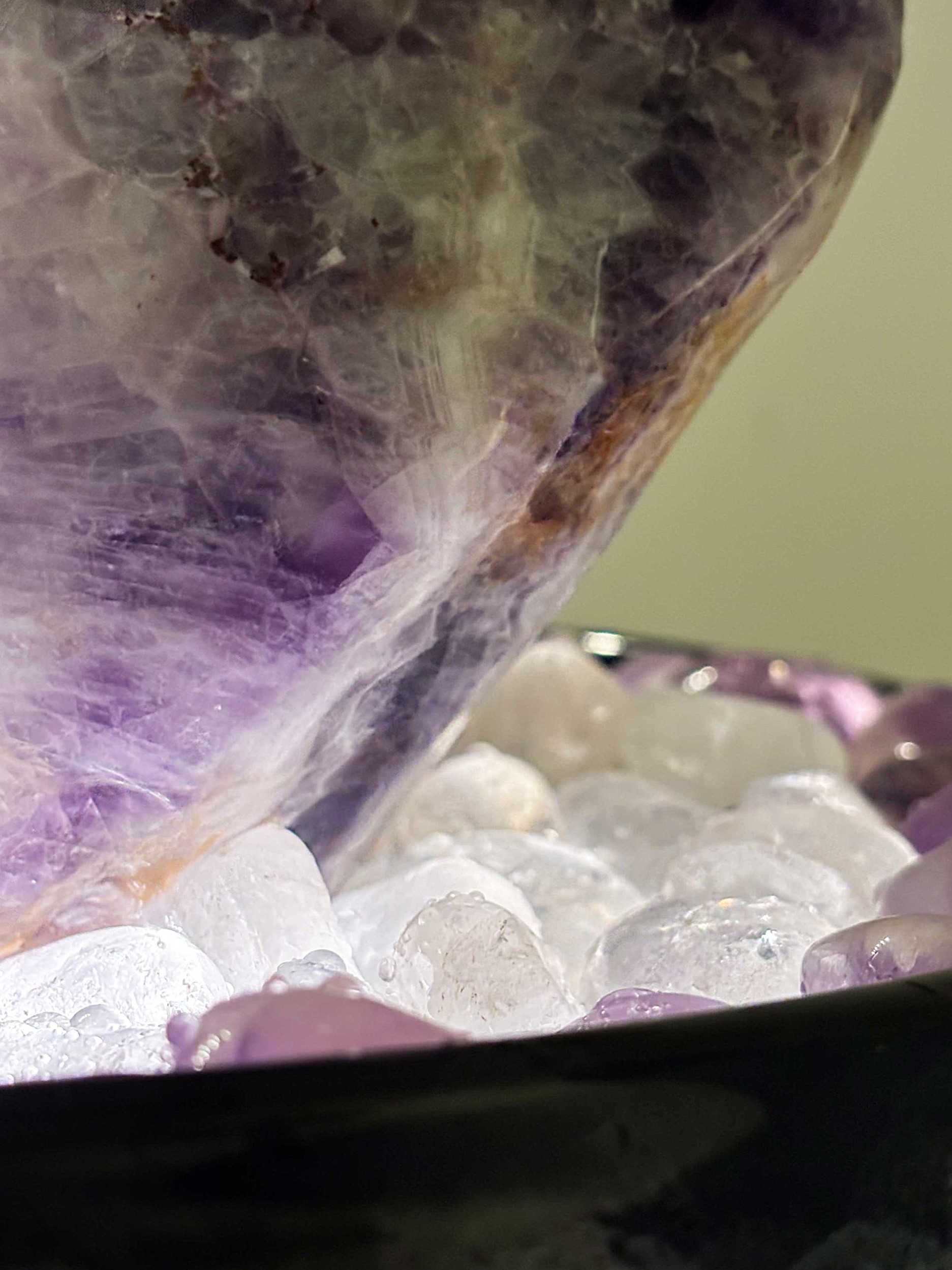 Der glatt geschliffene Quellstein ist aus dem edlen Material “Chevron Amethyst” wird auf einem Acrylglas-Basistisch gestellt. Die polierten und hochwertigen Trommelsteine aus Bergkristall und Amethyst, so wie die kunstvoll gestaltete Keramikschale runden dieses Kunstwerk der Natur geschmackvoll ab.