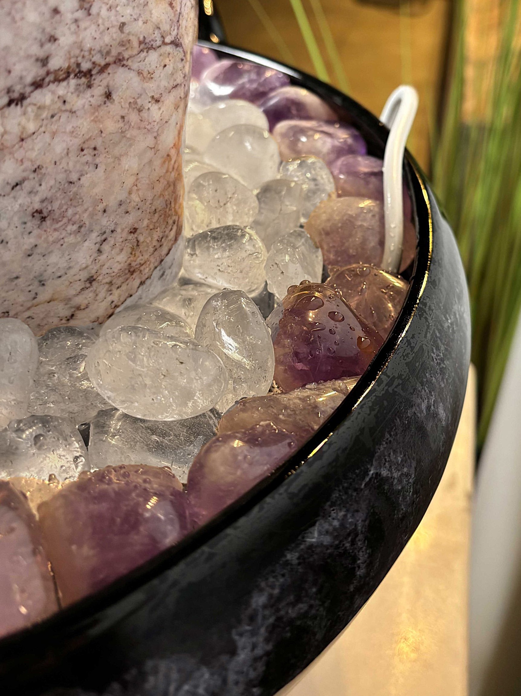 Der sanfte Wasserfluss sorgt für eine entspannende Atmosphäre und verstärkt die harmonisierende Wirkung des Amethysts, der für seine beruhigenden und klärenden Eigenschaften bekannt ist. Amethyst fördert auch das Wohlbefinden und die innere Ruhe.