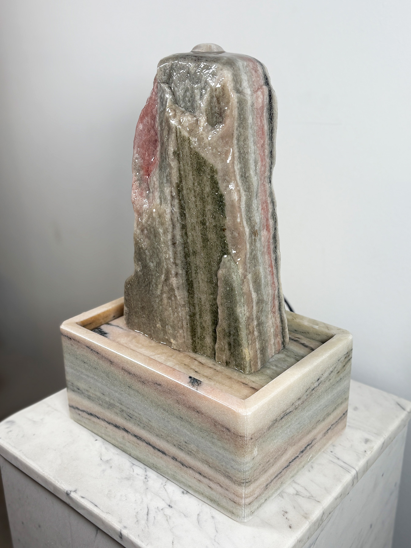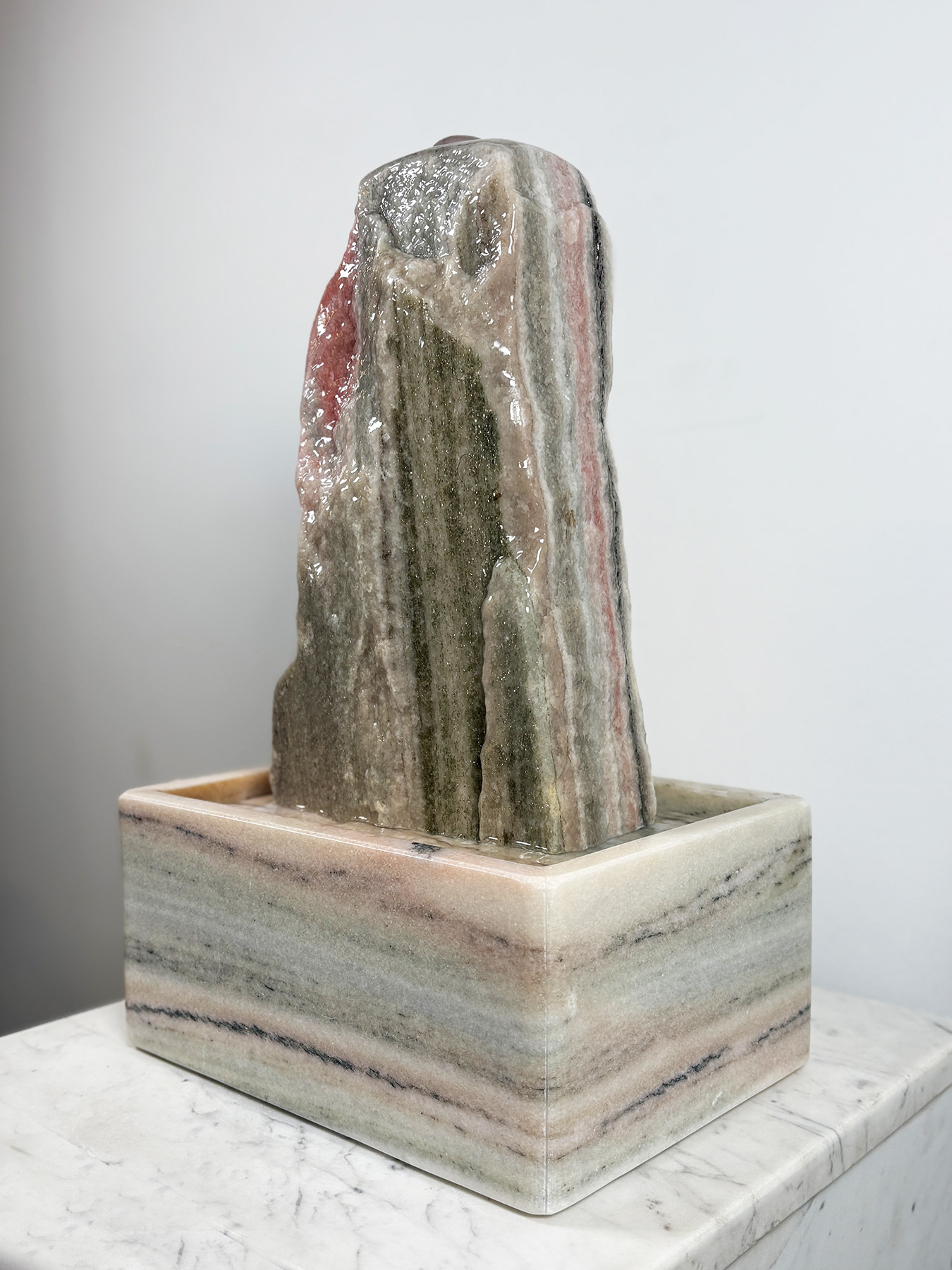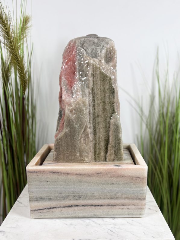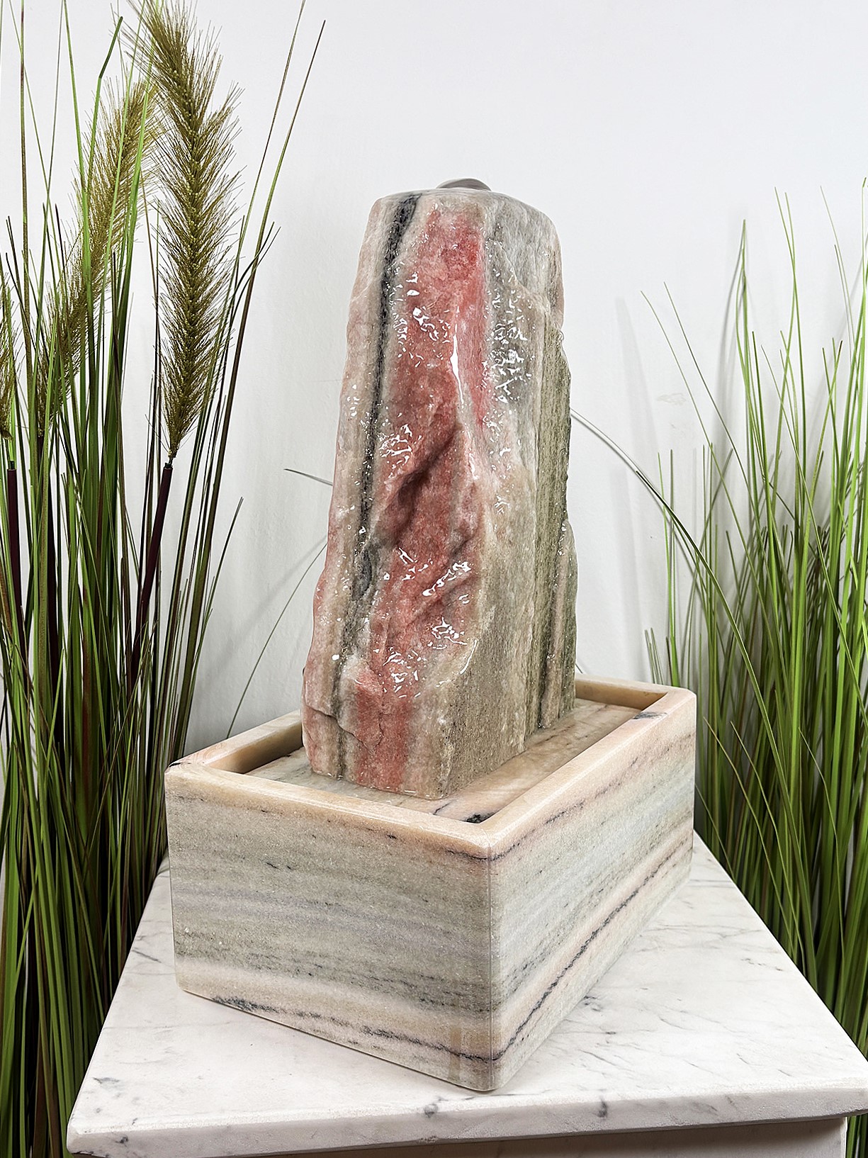 Bei diesem besonderen Unikat handelt es sich um einen naturbelassenen Findling aus dem eindrucksvoll gemusterten norwegischen Marmor “Fantasia”. Seine einzigartige Zeichnung macht jeden Brunnen zu einem unverwechselbaren Einzelstück.