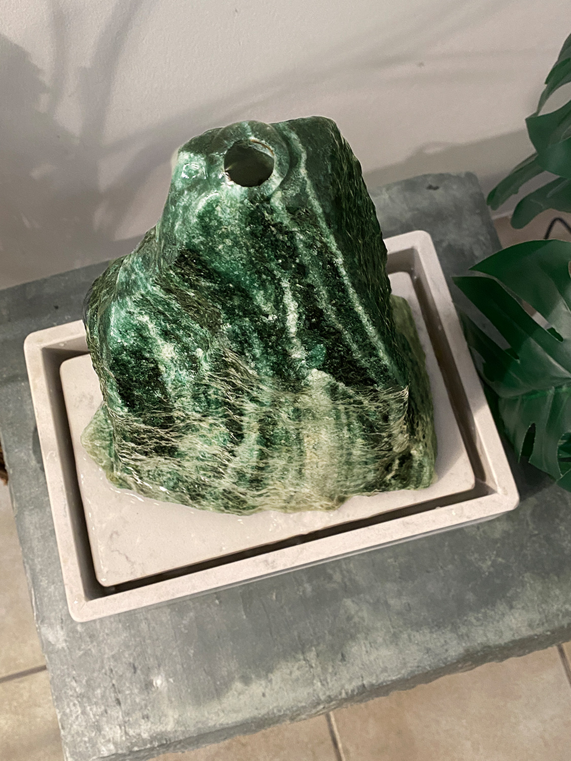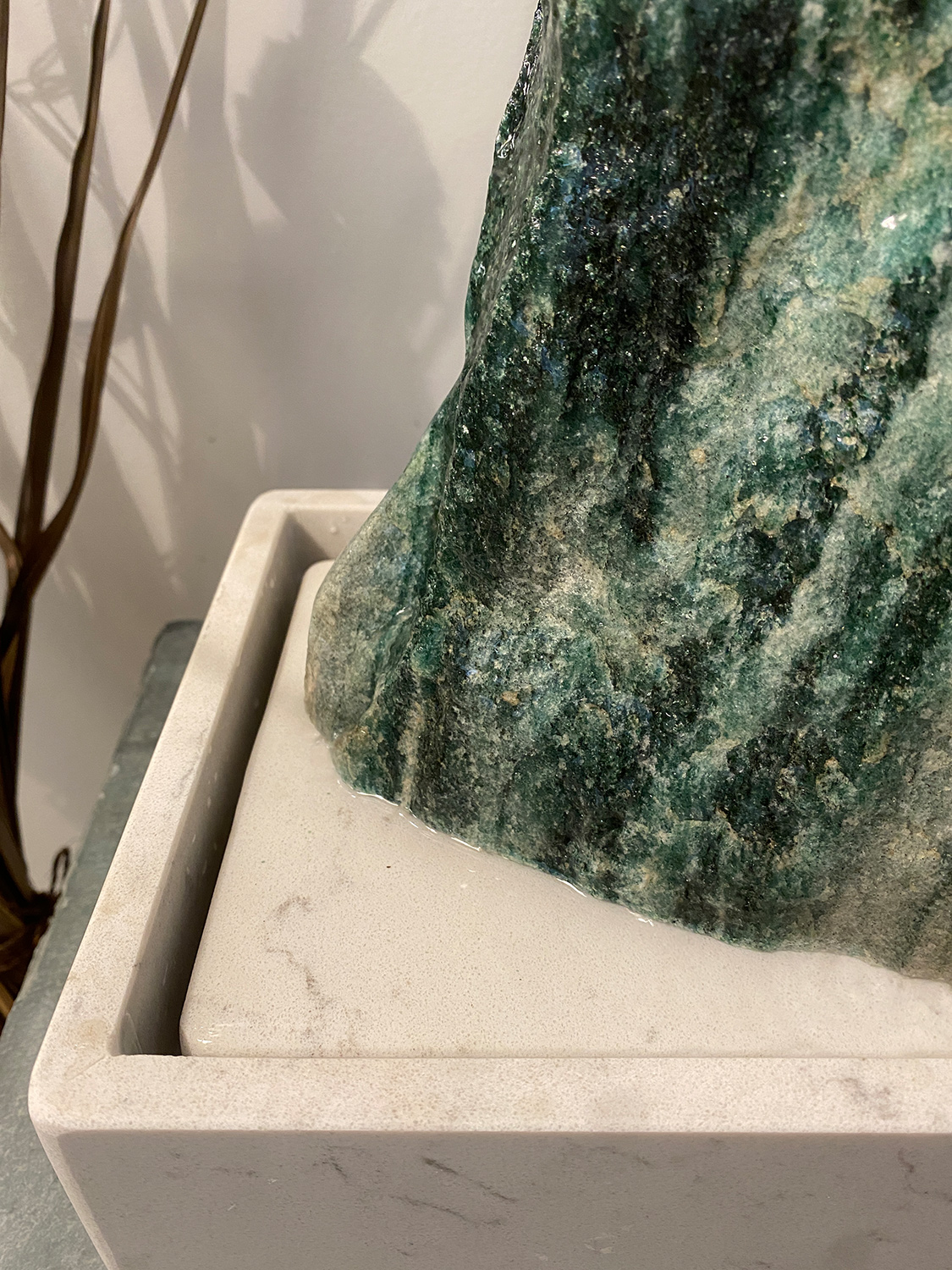 Der Brunnen “Myre” besteht aus mehreren Komponenten: Der Quellstein wird auf einem genau in die Wanne passenden Deckel positioniert. In der Wanne befindet sich die Pumpe, welche das Wasser immer wieder über den Stein befördert.