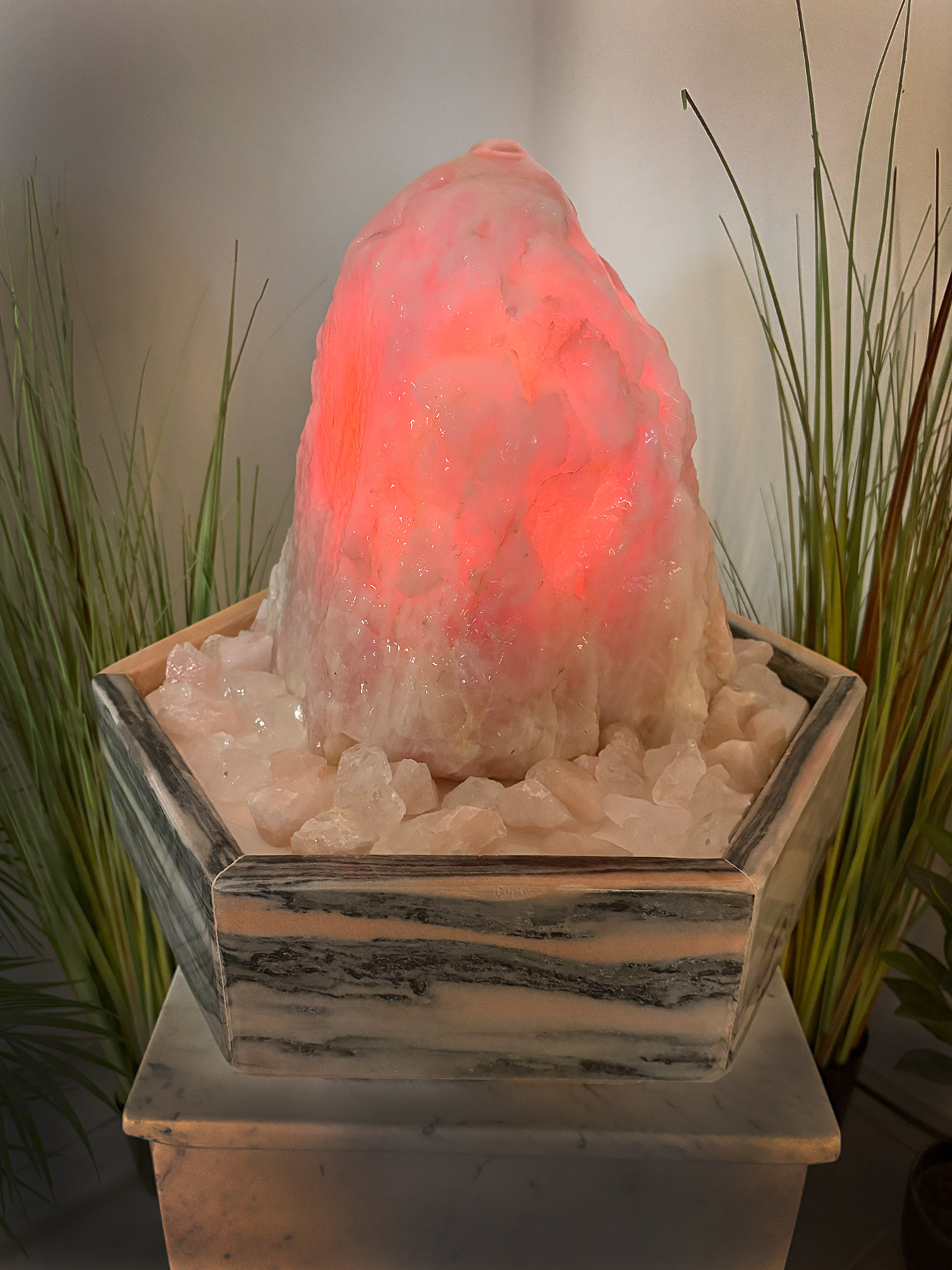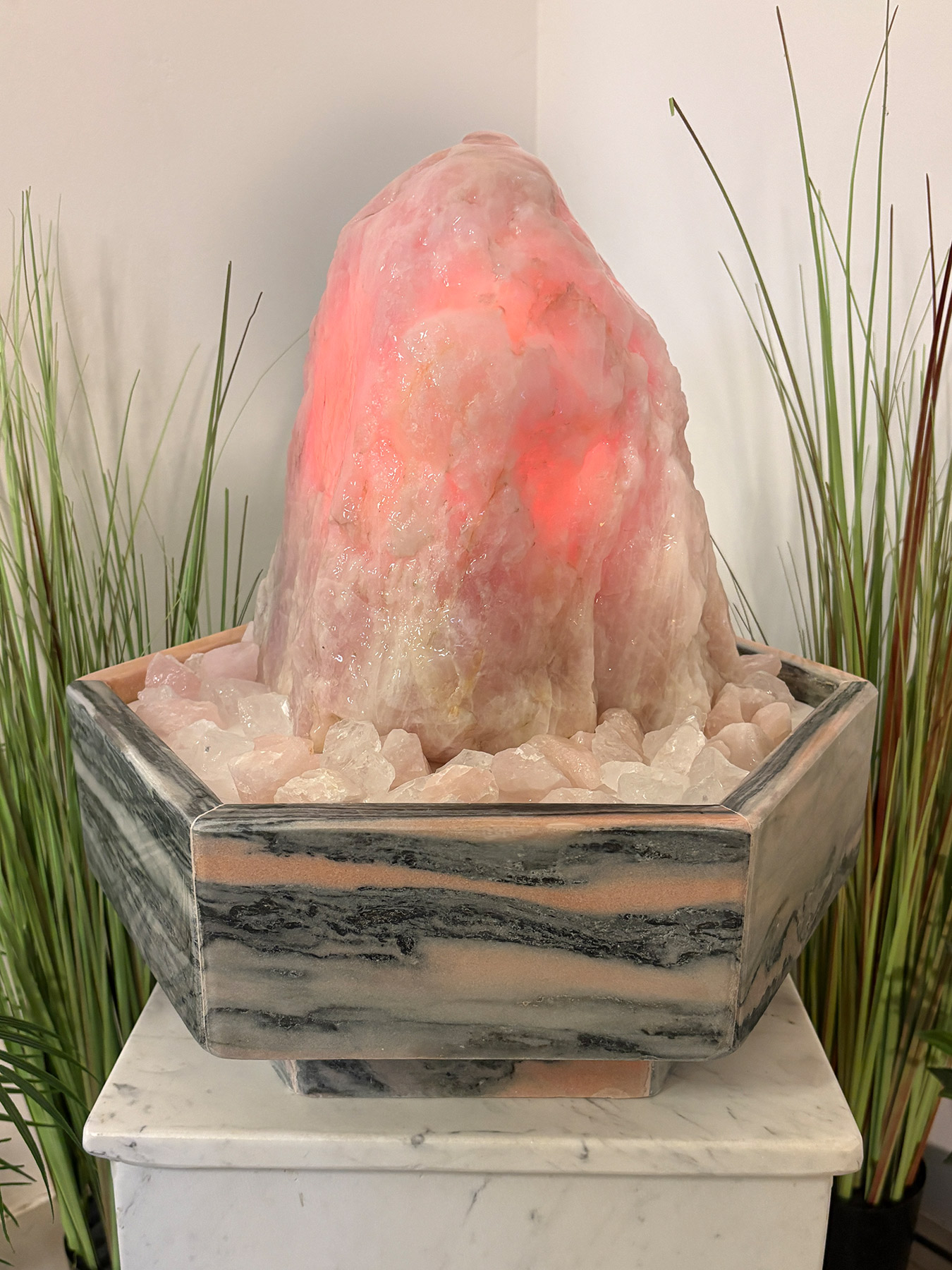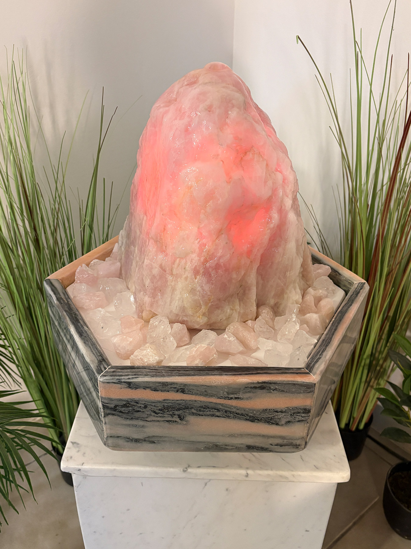 Der Zimmerbrunnen “Feliciana” aus edlem Rosenquarz verzaubert mit seiner sanften Ausstrahlung und seinem harmonischen Lichtspiel. Der rund 22kg schwere Quellstein erhebt sich in einer sechseckigen Marmorwanne, umgeben von hochwertigen Dekorationssteinen aus Bergkristall und Rosenquarz, die sein warmes Leuchten noch verstärken.