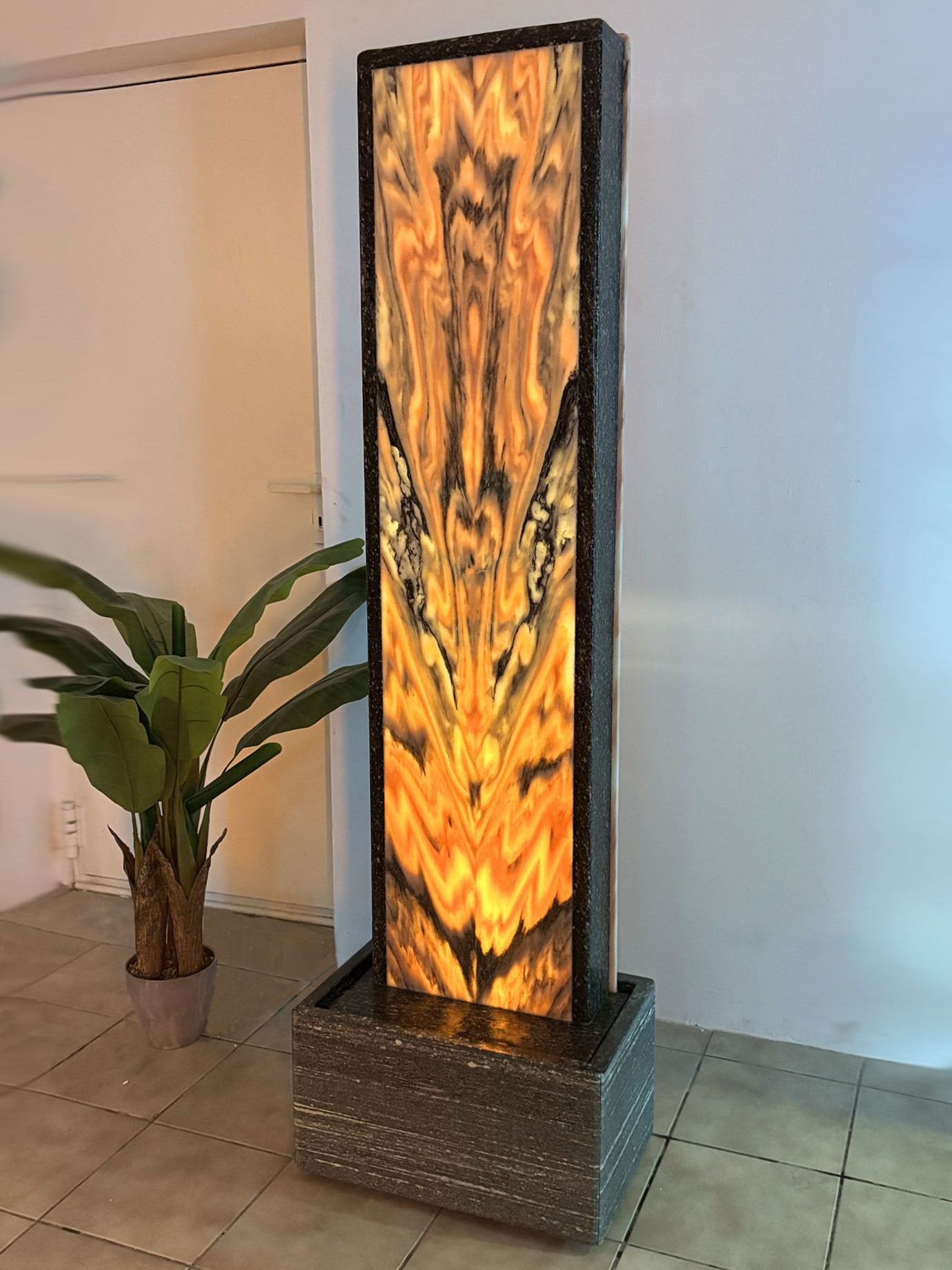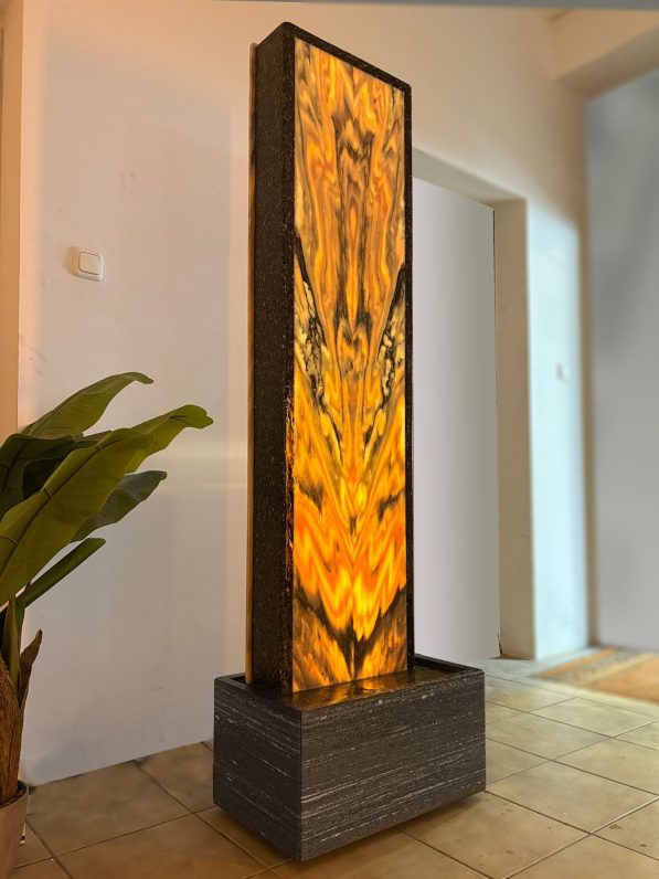 Der Designerbrunnen “Mystic Bird” ist mit seinen geometrischen Formen, der beleuchteten Naturstein-Einlegearbeit und den zwei Quellen ein stylischer Blickfang in jedem Raum.