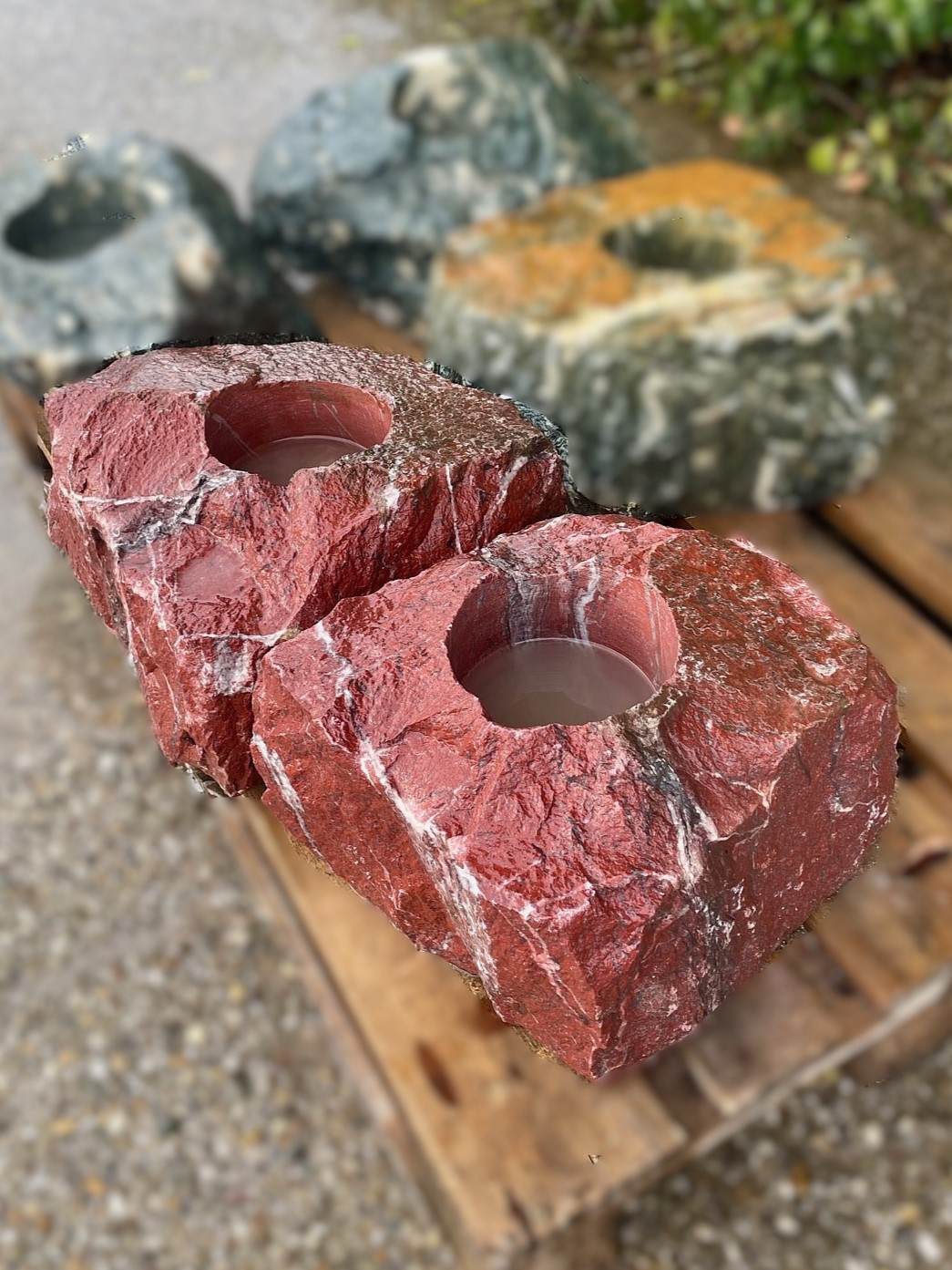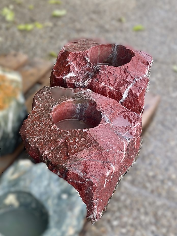 – Dekorationssteine “Rosso Laredo” & “Purple Wave” (wie abgebildet) bzw. wenn gewünscht mit “Sölker Marmor“