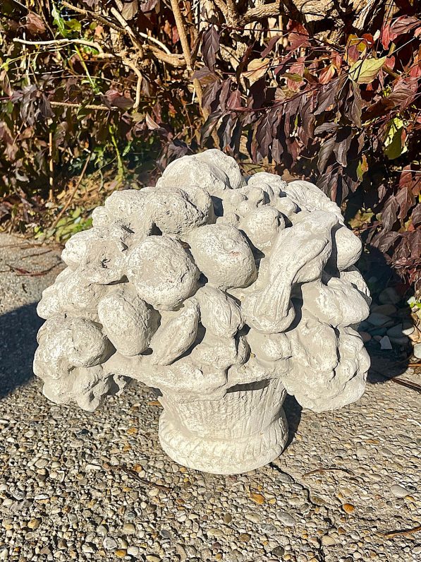 Diese kunstvoll gearbeitete Schale wirkt, als hätte sie bereits eine lange Geschichte hinter sich und doch trägt sie mühelos die reiche Fülle an verschiedenen Früchten.