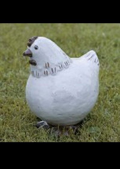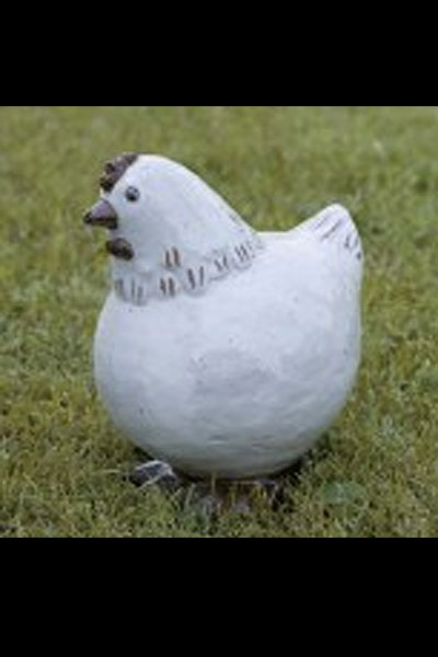 Diese Gartenfigur zeigt eine kugelrunde Henne mit gefälligem Körper aus weiß glasiertem Terracotta. Sie eignet sich ideal zur Dekoration im Garten.