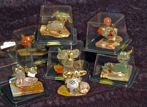 Diese Tierfiguren werden aus kleinen Mineralien in Handarbeit geklebt und bemalt. Die Augen sind beweglich und erhöhen so den Reiz, den diese Figuren ausüben.