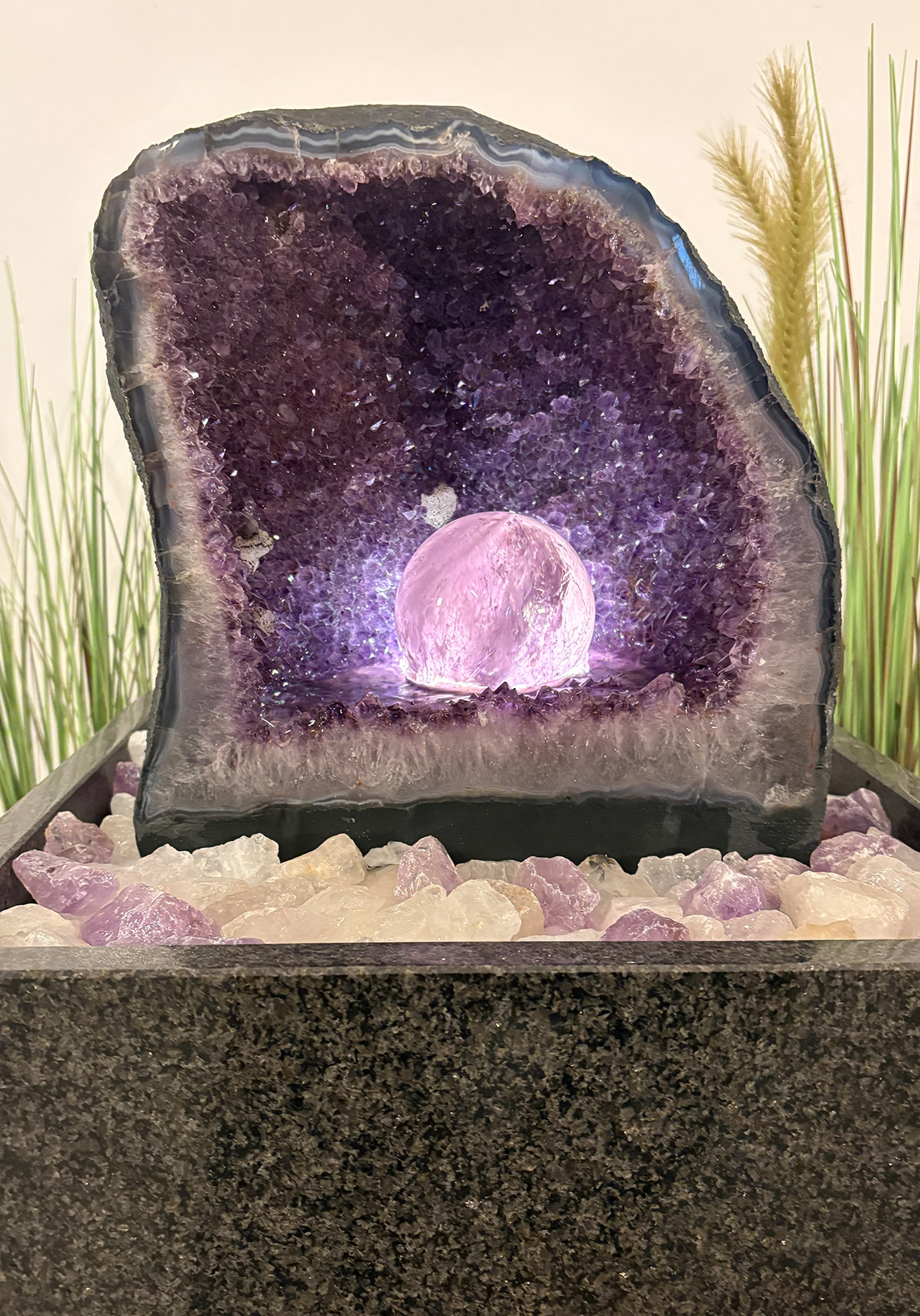 Dieser außergewöhnliche Zimmerbrunnen verbindet natürliche Schönheit mit meisterhafter Handwerkskunst. Im Mittelpunkt steht eine prachtvolle Amethyst-Geode aus Brasilien, in die eine sanft rotierende Amethyst-Kugel integriert ist. Eine separate LED-Beleuchtung setzt sowohl die Geode als auch die 8cm große Kugel wirkungsvoll in Szene und lässt sie in voller Farbintensität erstrahlen. Ein faszinierendes Zusammenspiel aus Licht, Bewegung und Energie.