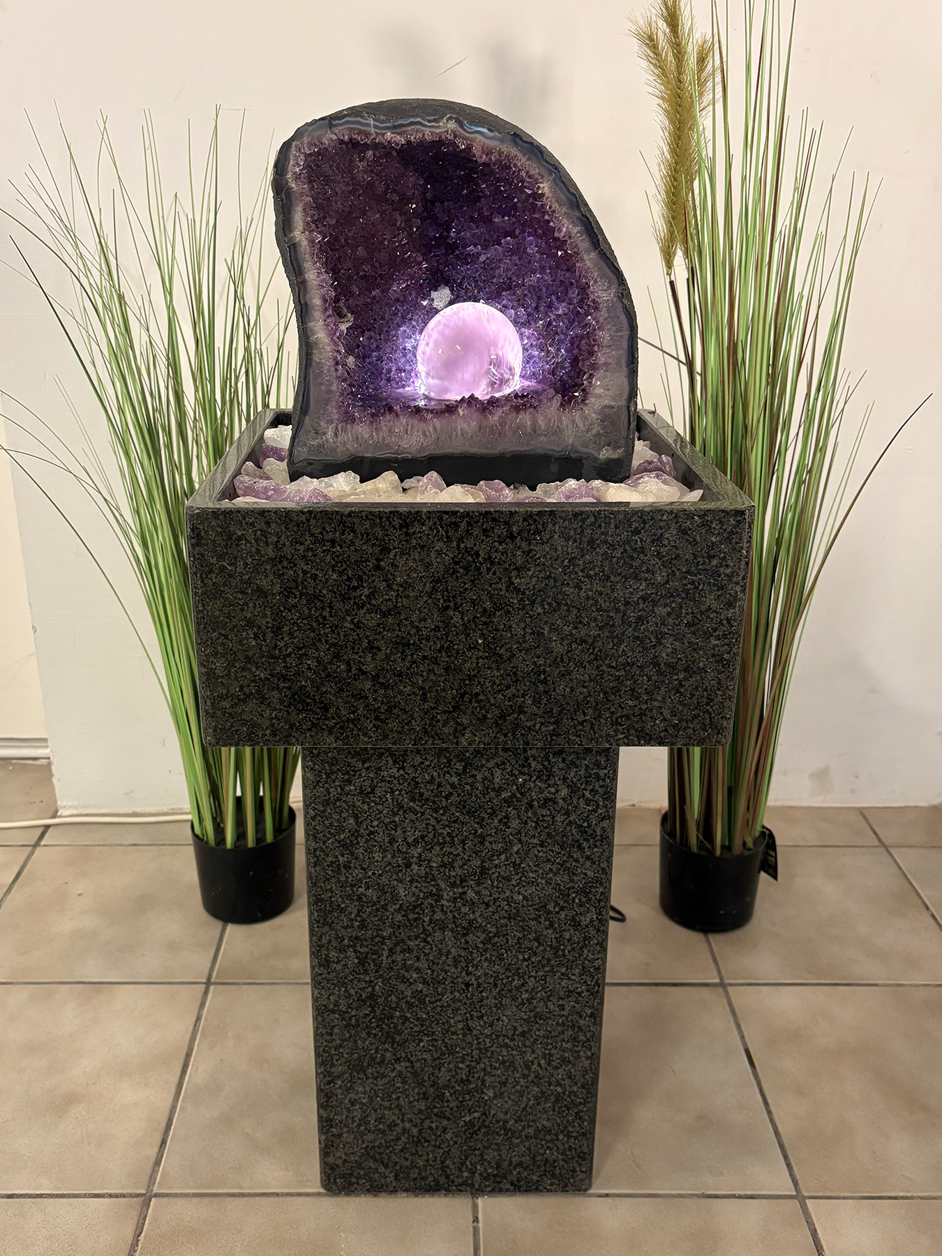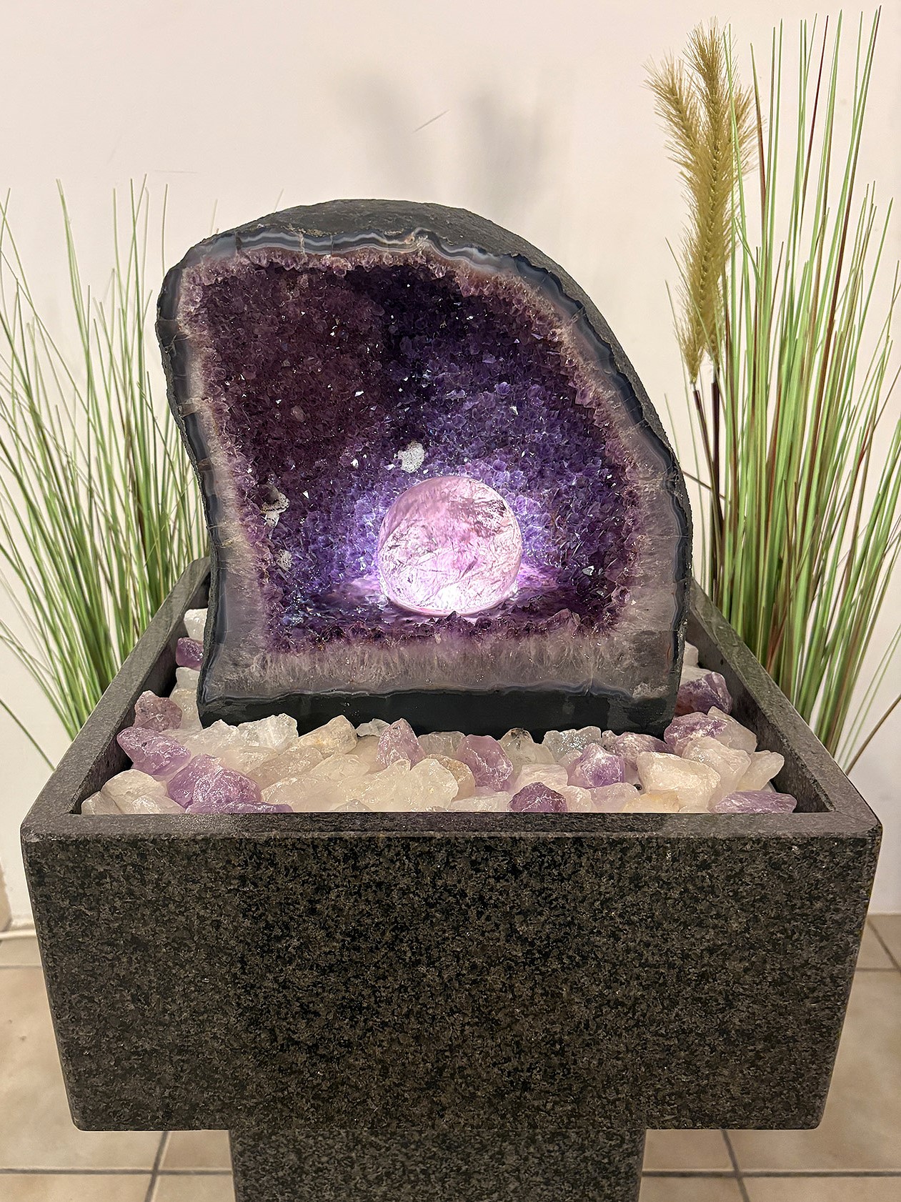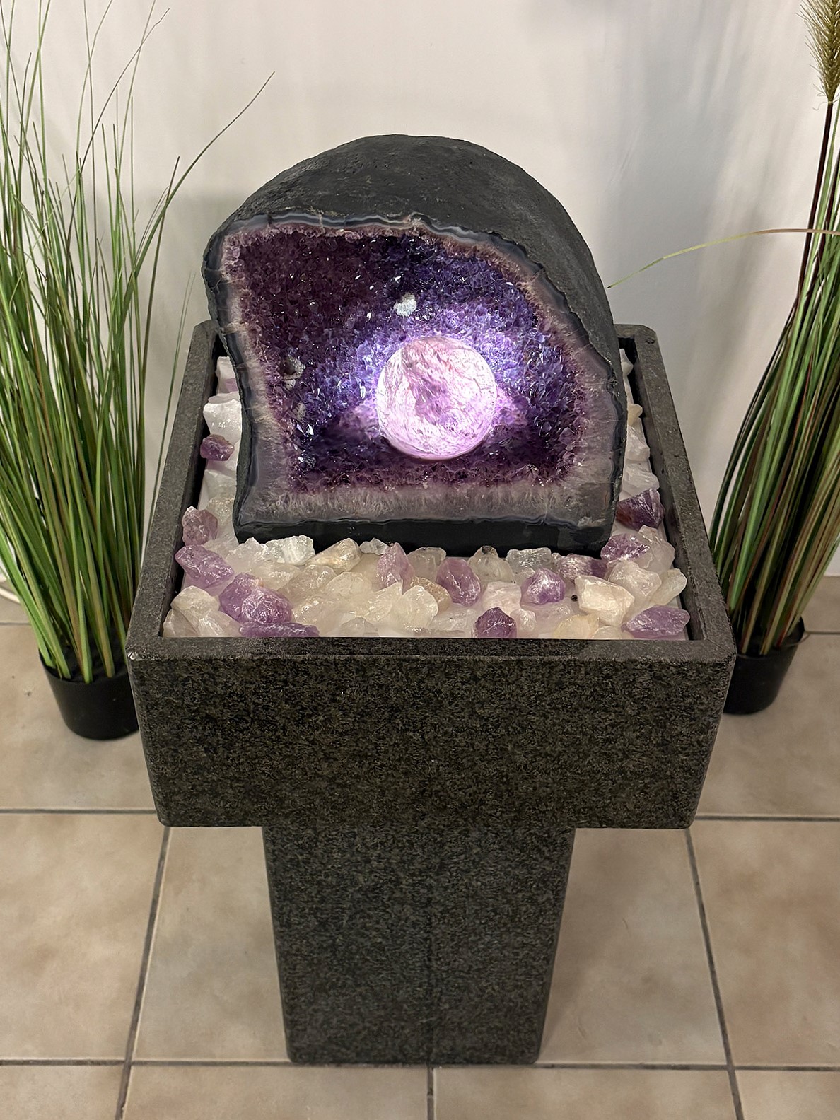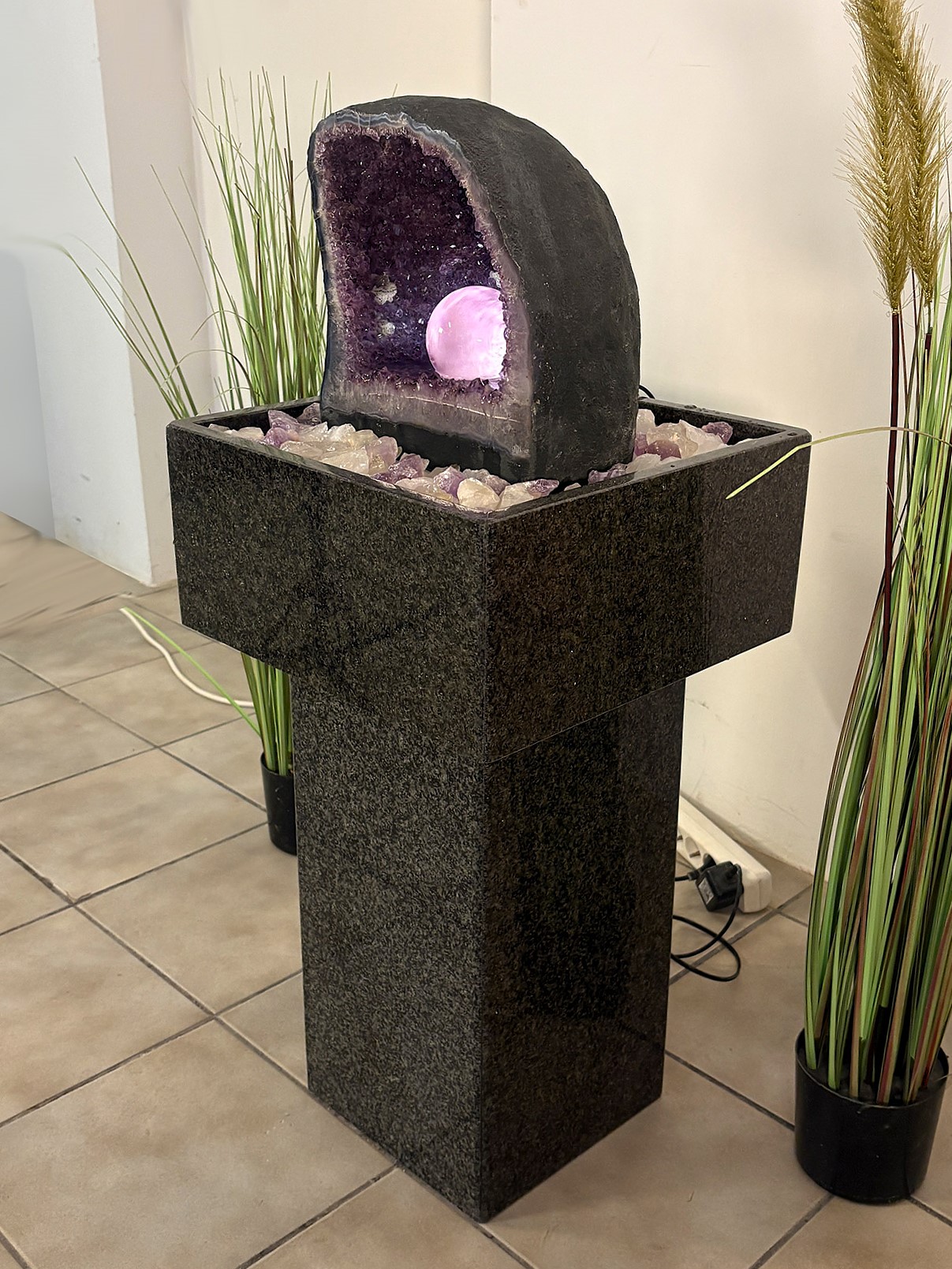 Der Brunnen besteht aus mehreren sorgfältig aufeinander abgestimmten Komponenten: Die Amethyst-Geode ruht auf einem exakt passenden Basistisch, welcher in der aus echtem Granit hergestellten Säulenschale platziert wird.