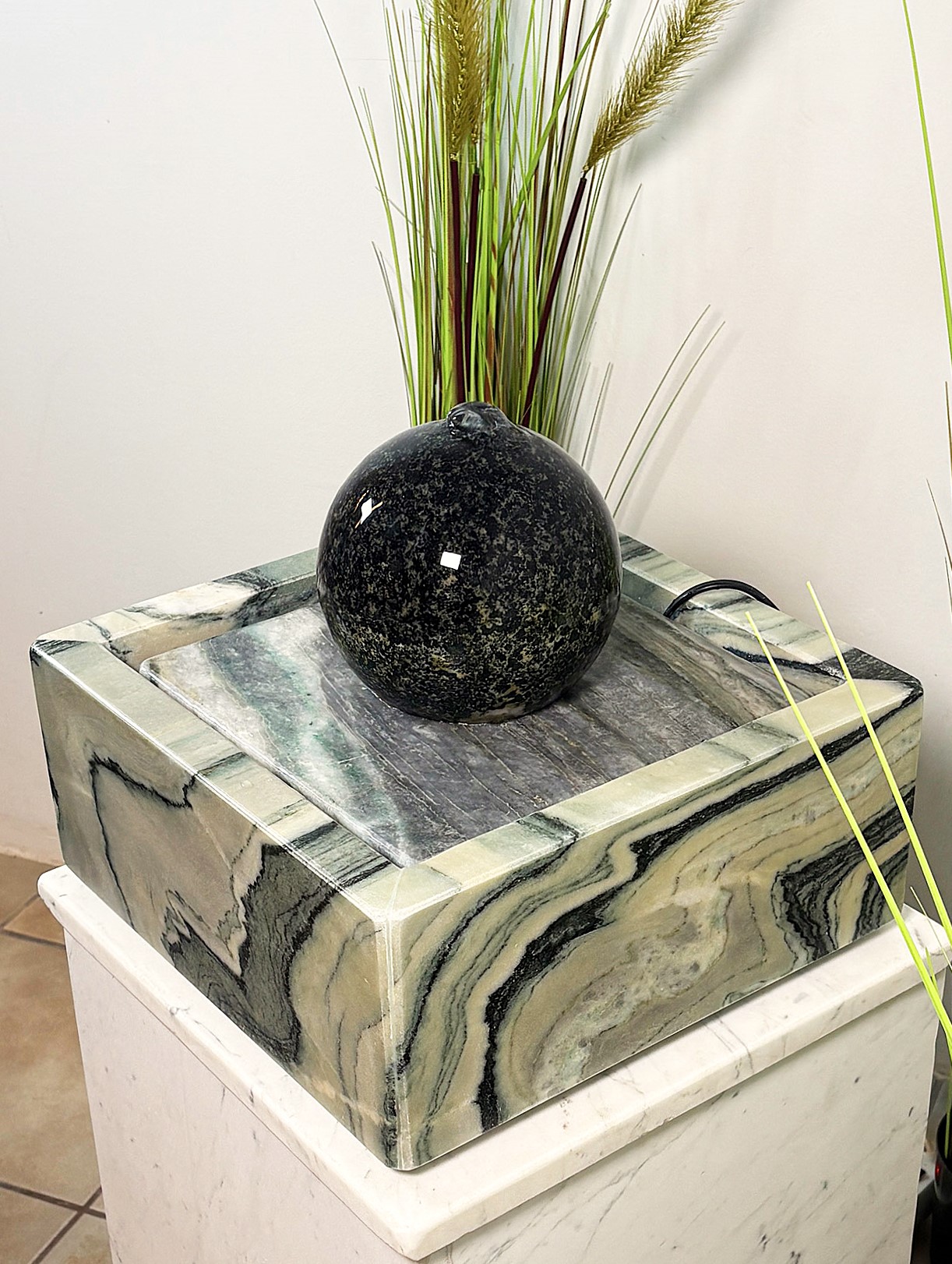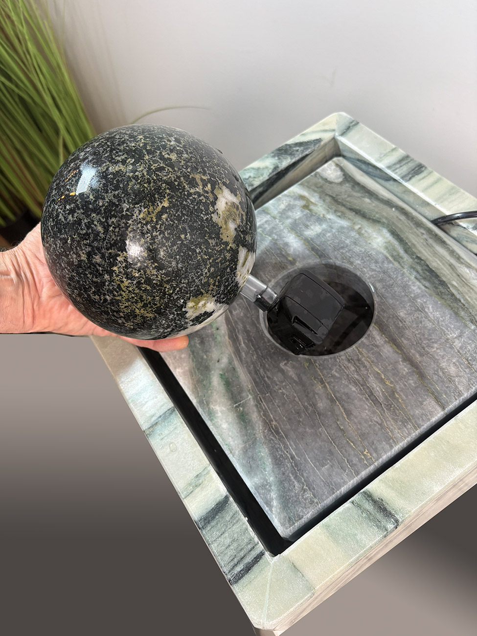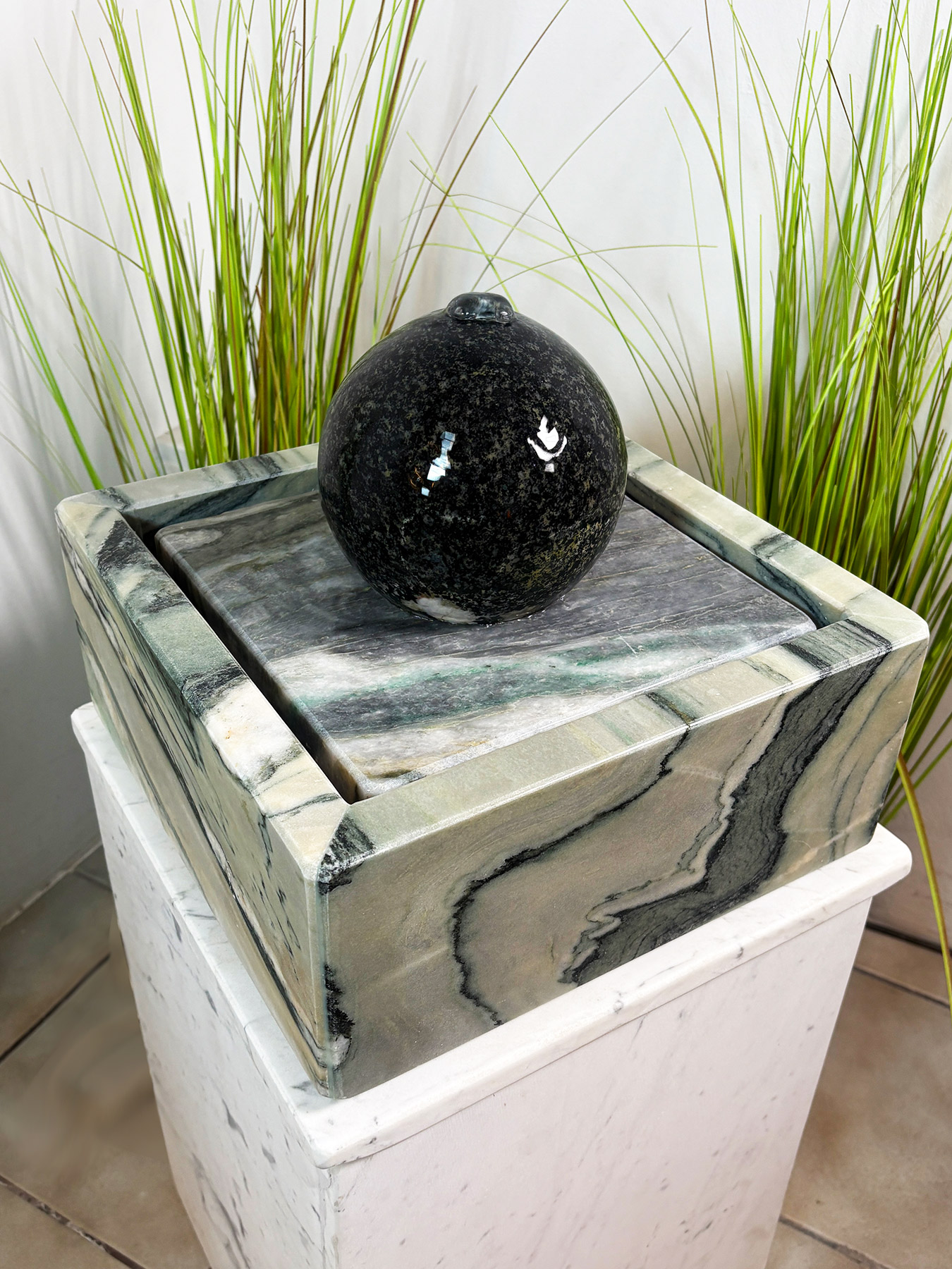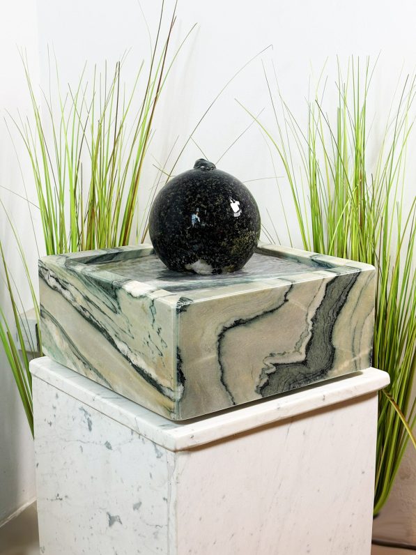 Das lebhafte Wasser, welches aus der Kugel entspringt, fließt in sanften Wellen über die fein gemaserte Marmorplatte zurück in die Wanne. So entsteht ein harmonisches Zusammenspiel aus geometrischen Formen, natürlichen Materialien, Bewegung und Klang. So macht dieses Schmuckstück aus Ihrem Wohnzimmer einen Ort der Ruhe und Harmonie.