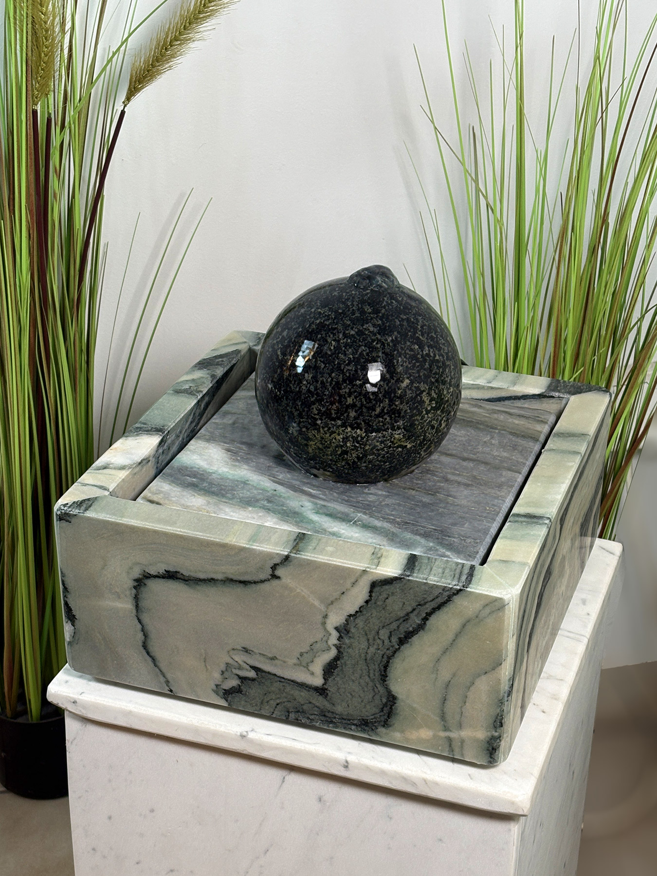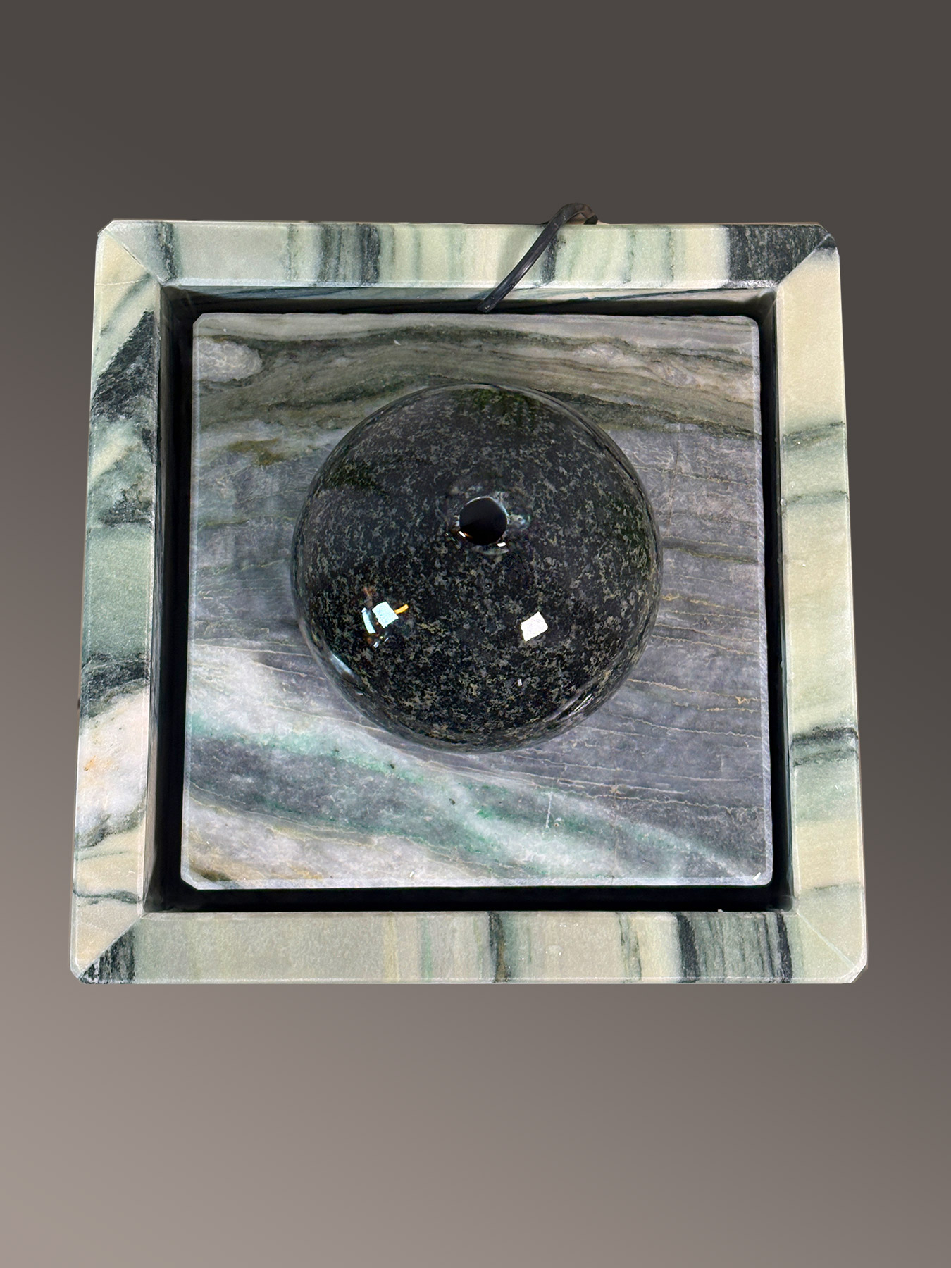 Die etwa 15cm große, dunkelgrüne Diabas-Kugel thront majestätisch in einer edlen Marmorwanne aus dem seltenen Material “Cipollino”.