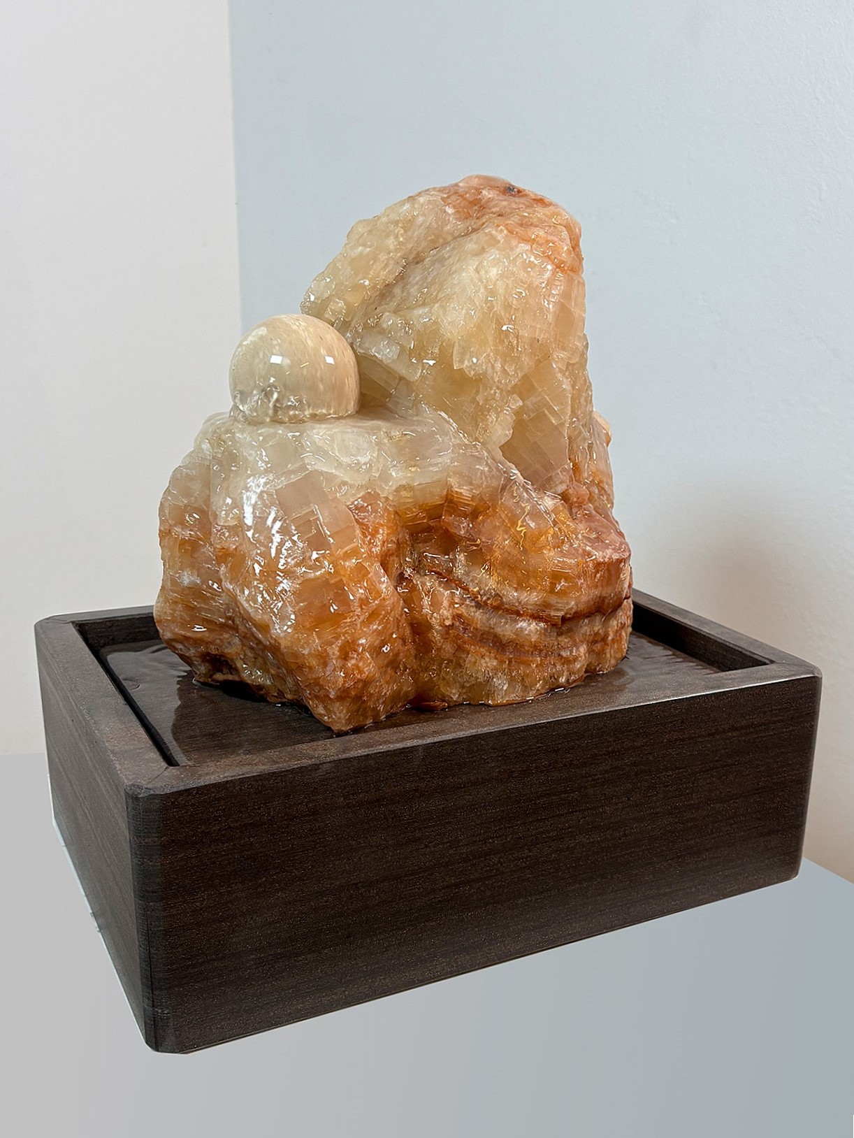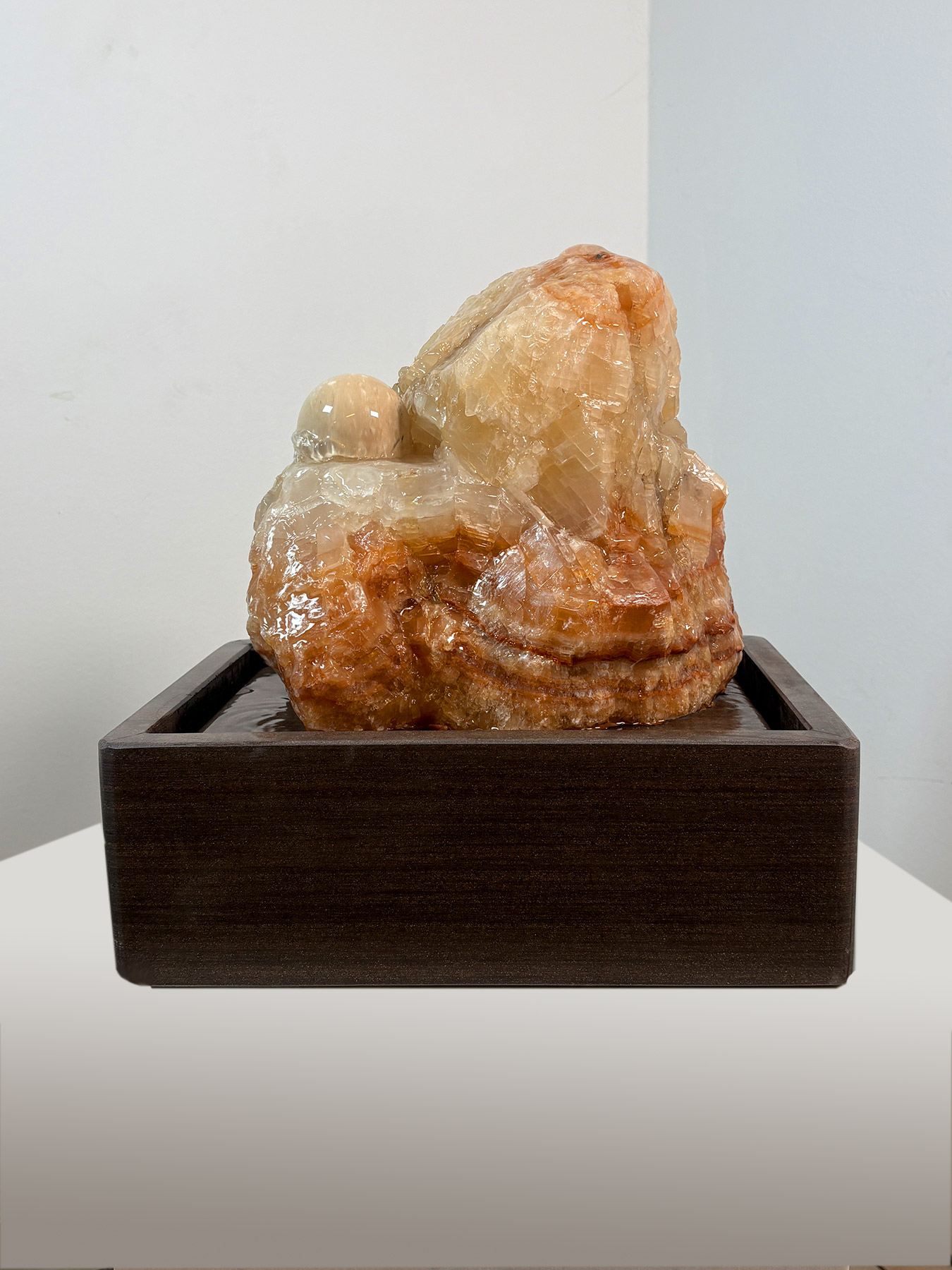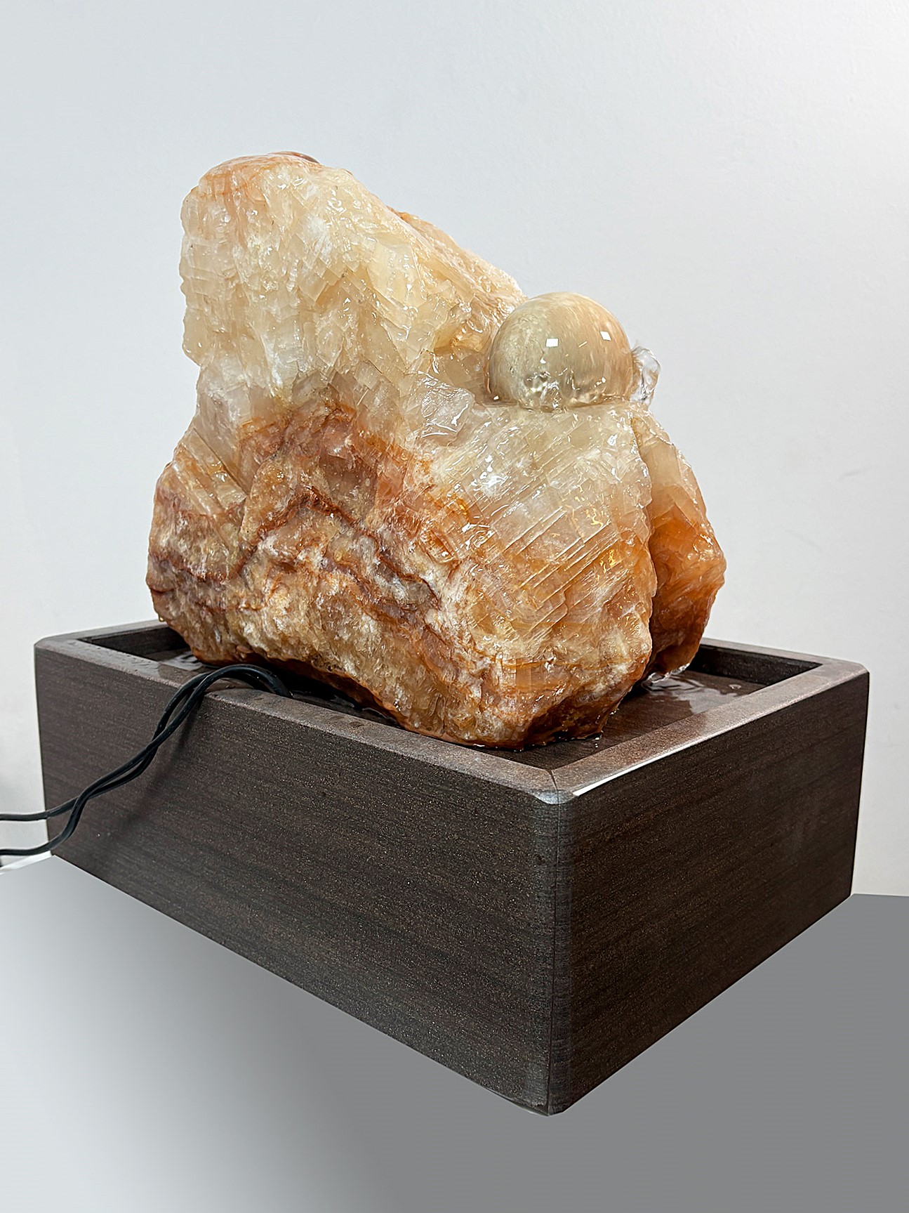 Dieser außergewöhnliche Zimmerbrunnen vereint natürliche Schönheit mit meisterhafter Handwerkskunst. Der Quellstein aus Kristall-Calcit fasziniert durch seine warme, goldene Farbgebung und seine würfelig-kristalline Oberfläche. Zwei sanft sprudelnde Quellen, angetrieben von zwei Qualitätspumpen, bringen das Wasser in Bewegung und erschaffen ein beruhigendes, lebendiges Spiel.