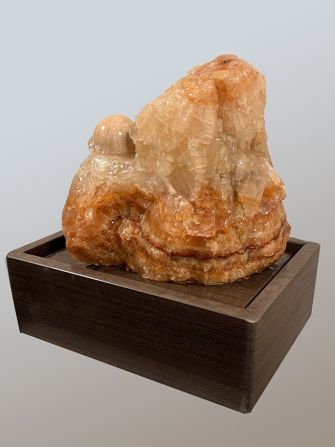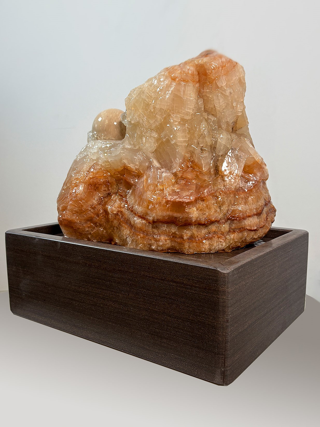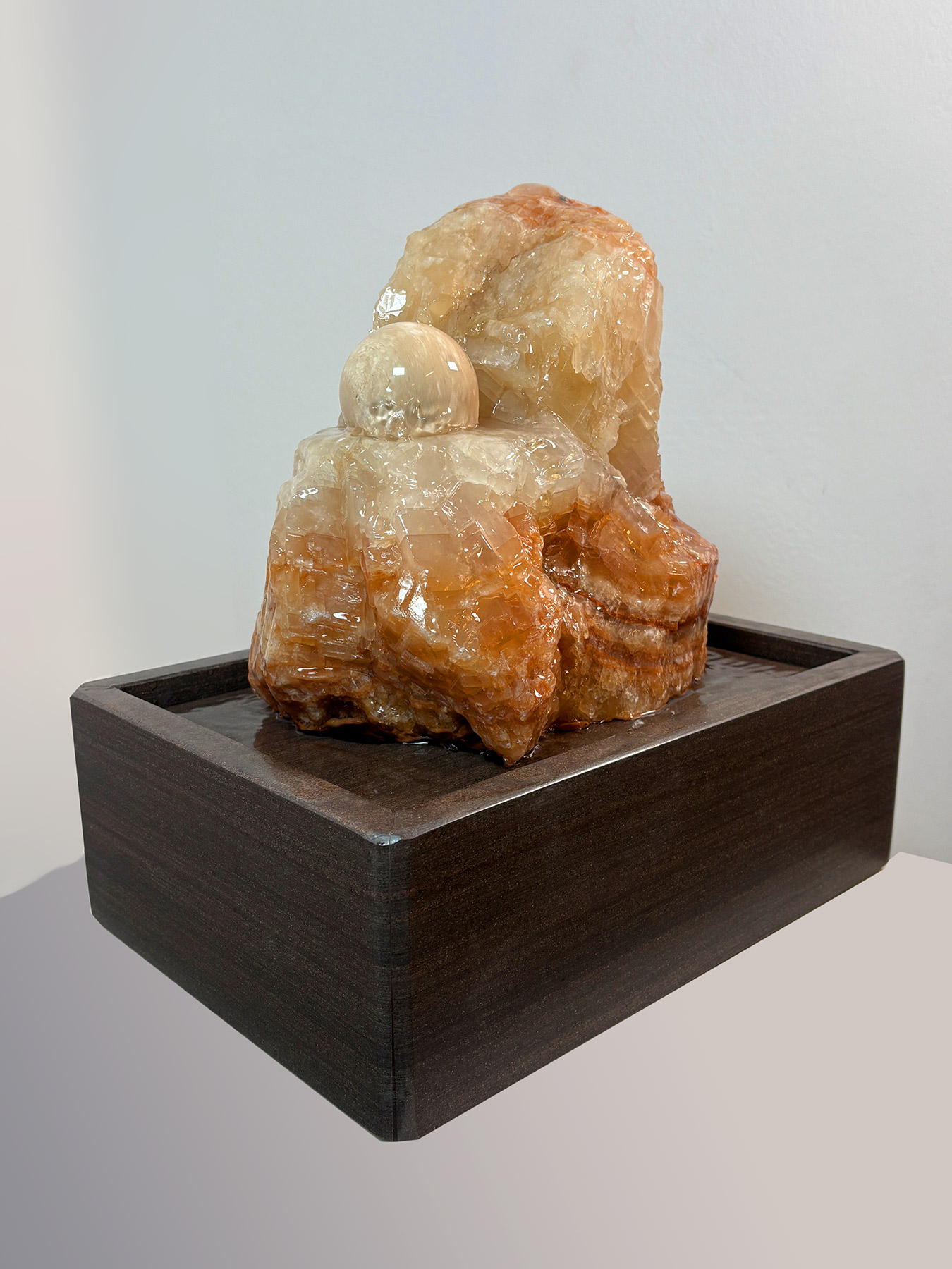 Dieser außergewöhnliche Zimmerbrunnen vereint natürliche Schönheit mit meisterhafter Handwerkskunst. Der Quellstein aus Kristall-Calcit fasziniert durch seine warme, goldene Farbgebung und seine würfelig-kristalline Oberfläche. Zwei sanft sprudelnde Quellen, angetrieben von zwei Qualitätspumpen, bringen das Wasser in Bewegung und erschaffen ein beruhigendes, lebendiges Spiel.