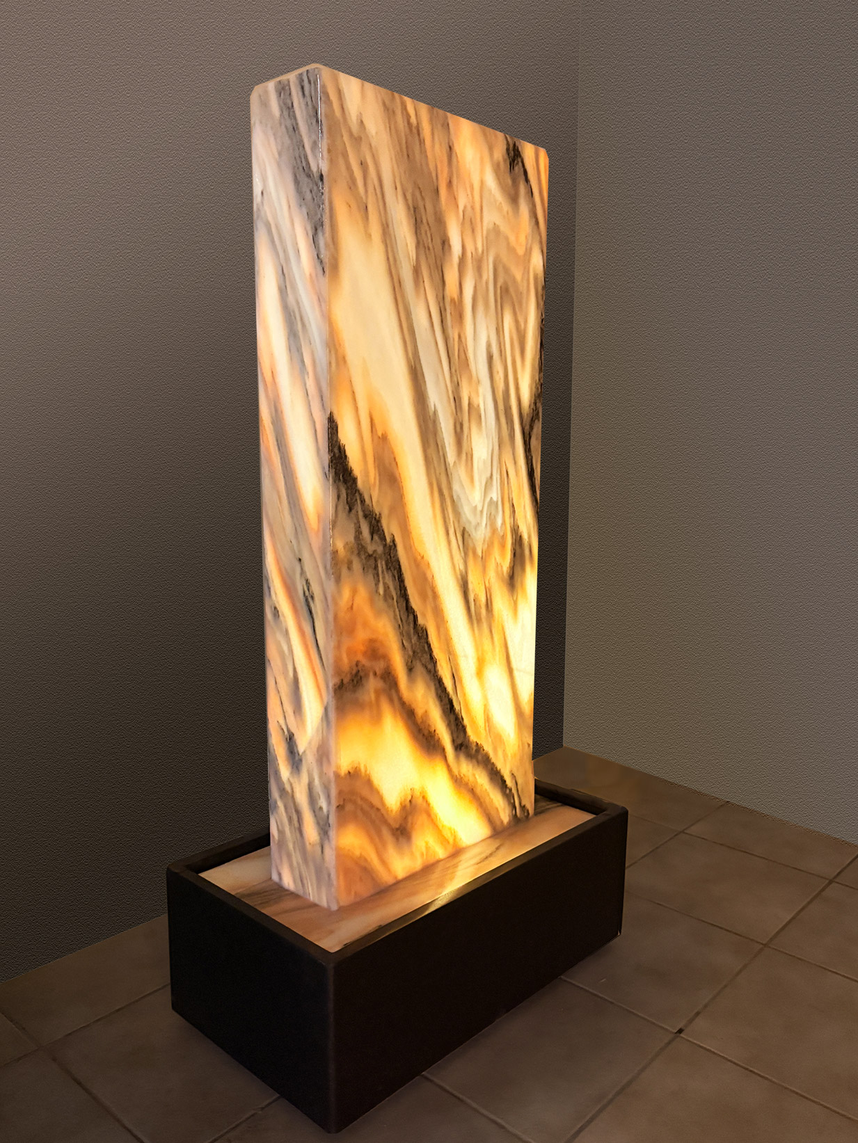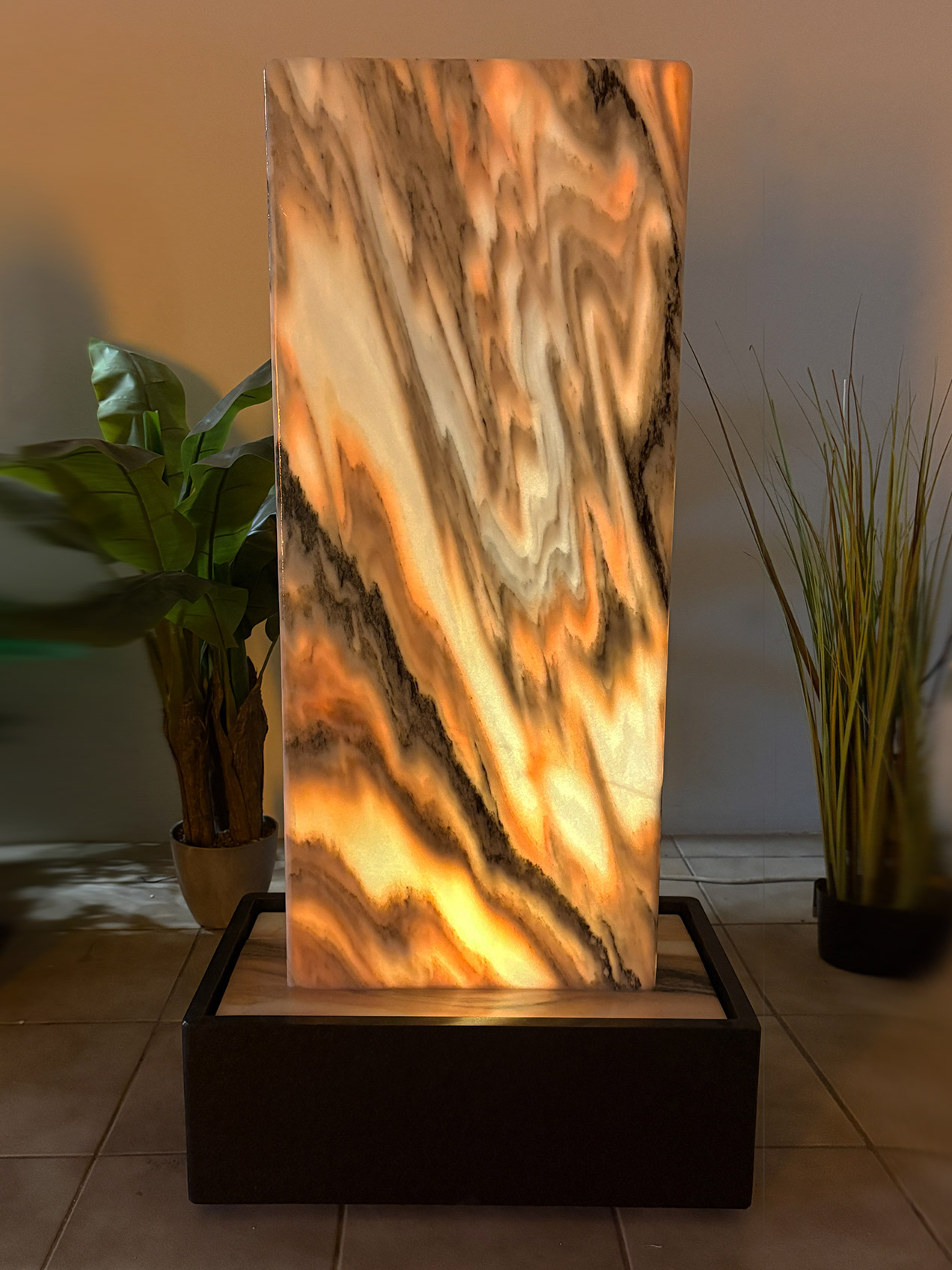 Dieser österreichische Marmor mit seinen warmen Farbtönen verbreitet eine angenehme Stimmung in Ihrem Wohnraum. Der ausgeleuchtete Hohlkörper wird durch zwei Steigleitungen gleichmäßig mit Wasser überflutet.