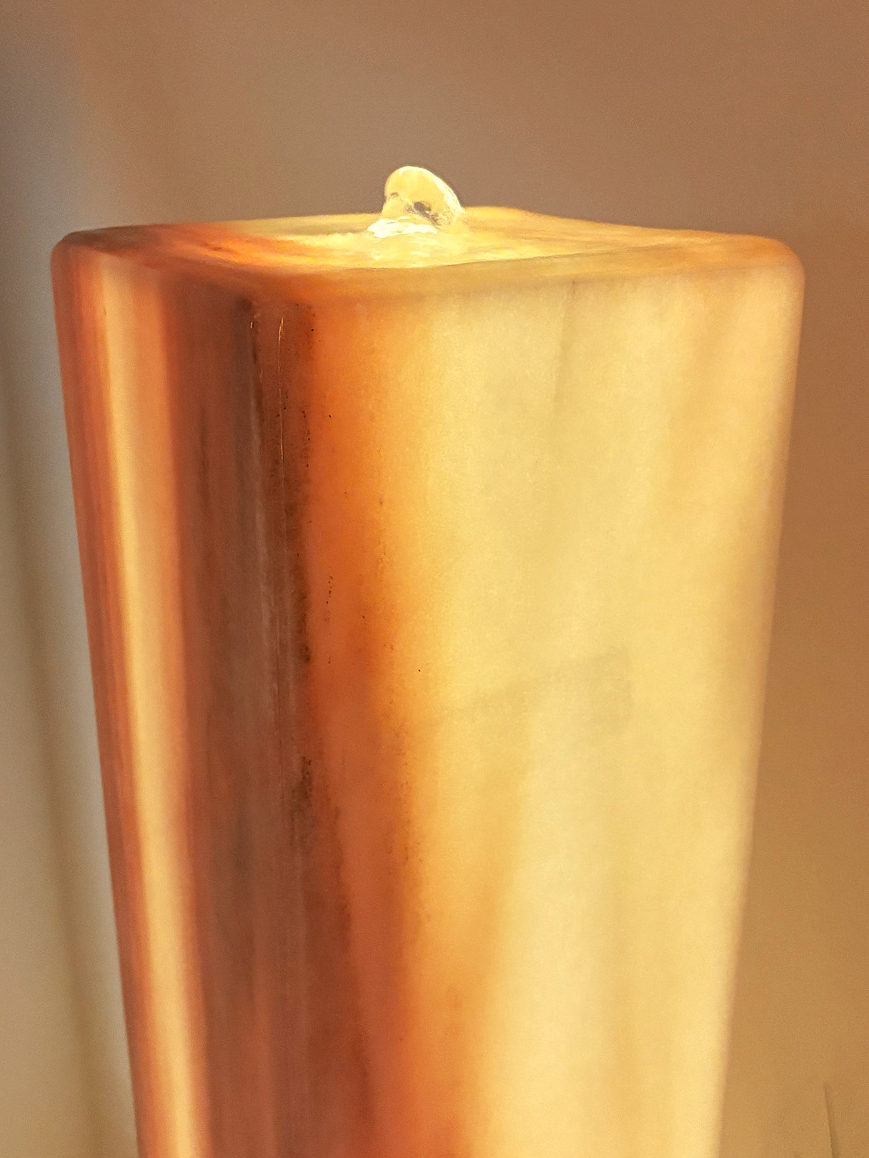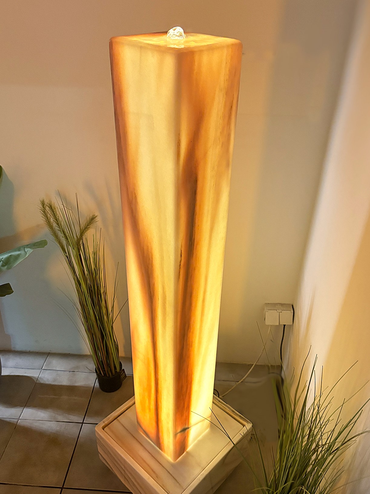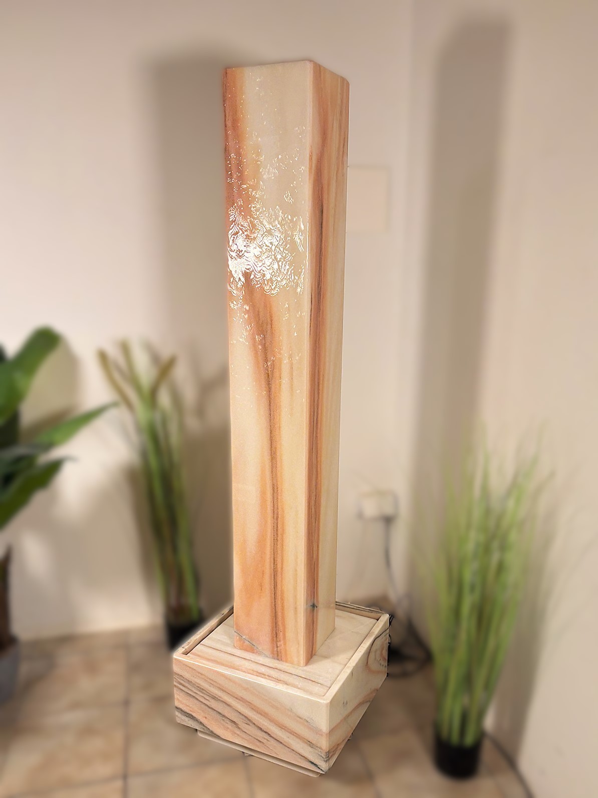 Die elegante Brunnenstele aus edlem Sölker Marmor ist als Hohlkörper gefertigt und wird im Inneren von einem LED-Scheinwerfer sanft zum Leuchten gebracht. Durch ihre stattliche Größe entfaltet diese außergewöhnliche Licht- und Wasserstele nicht nur eine beeindruckende optische Wirkung, sondern dient zugleich als effektiver Luftbefeuchter.
