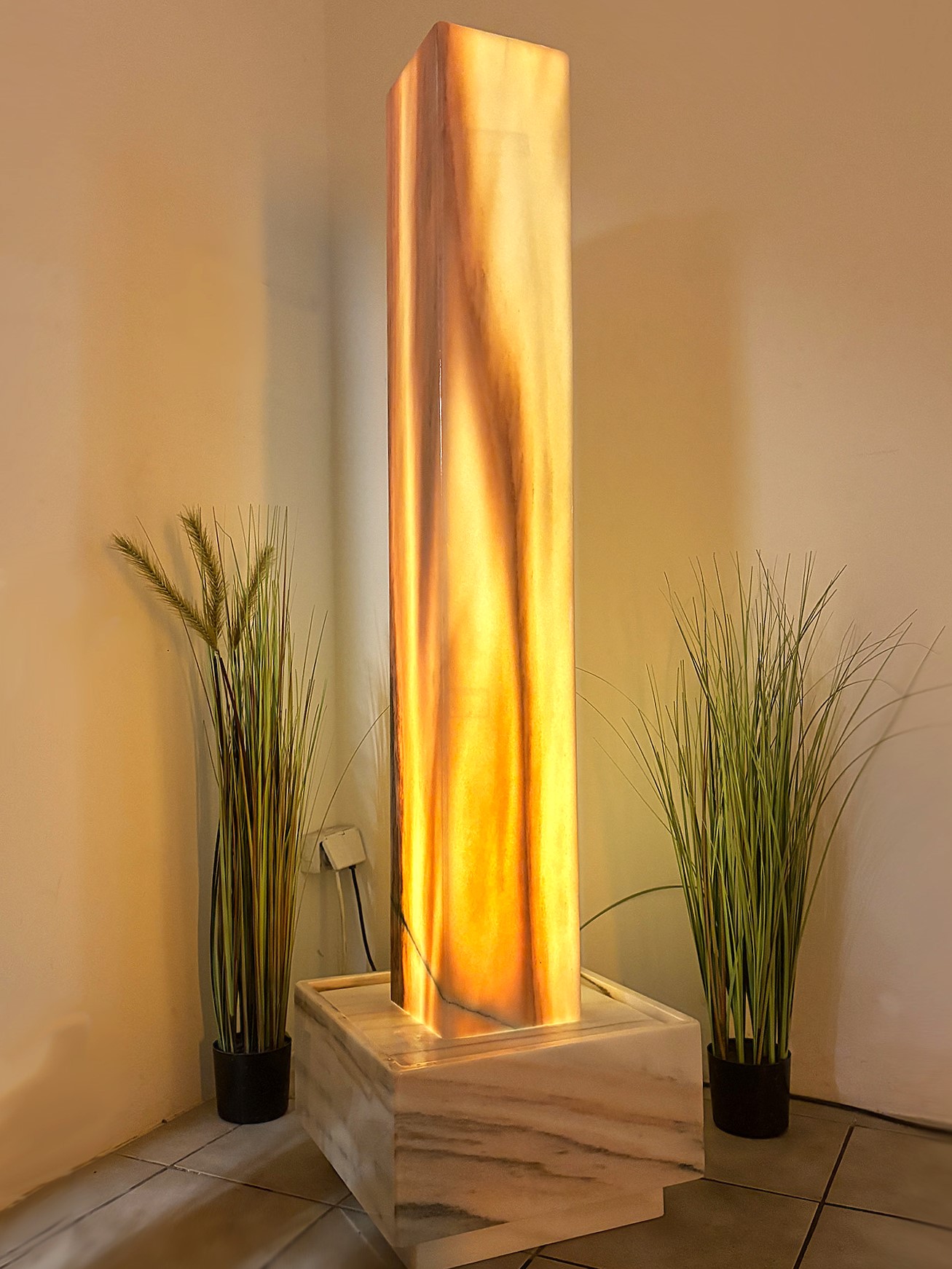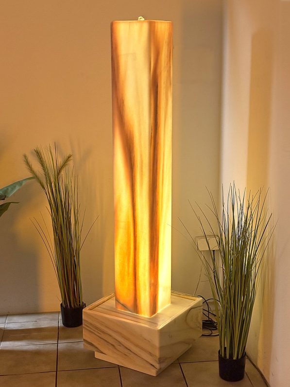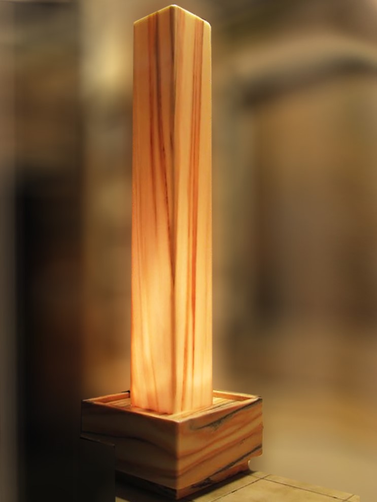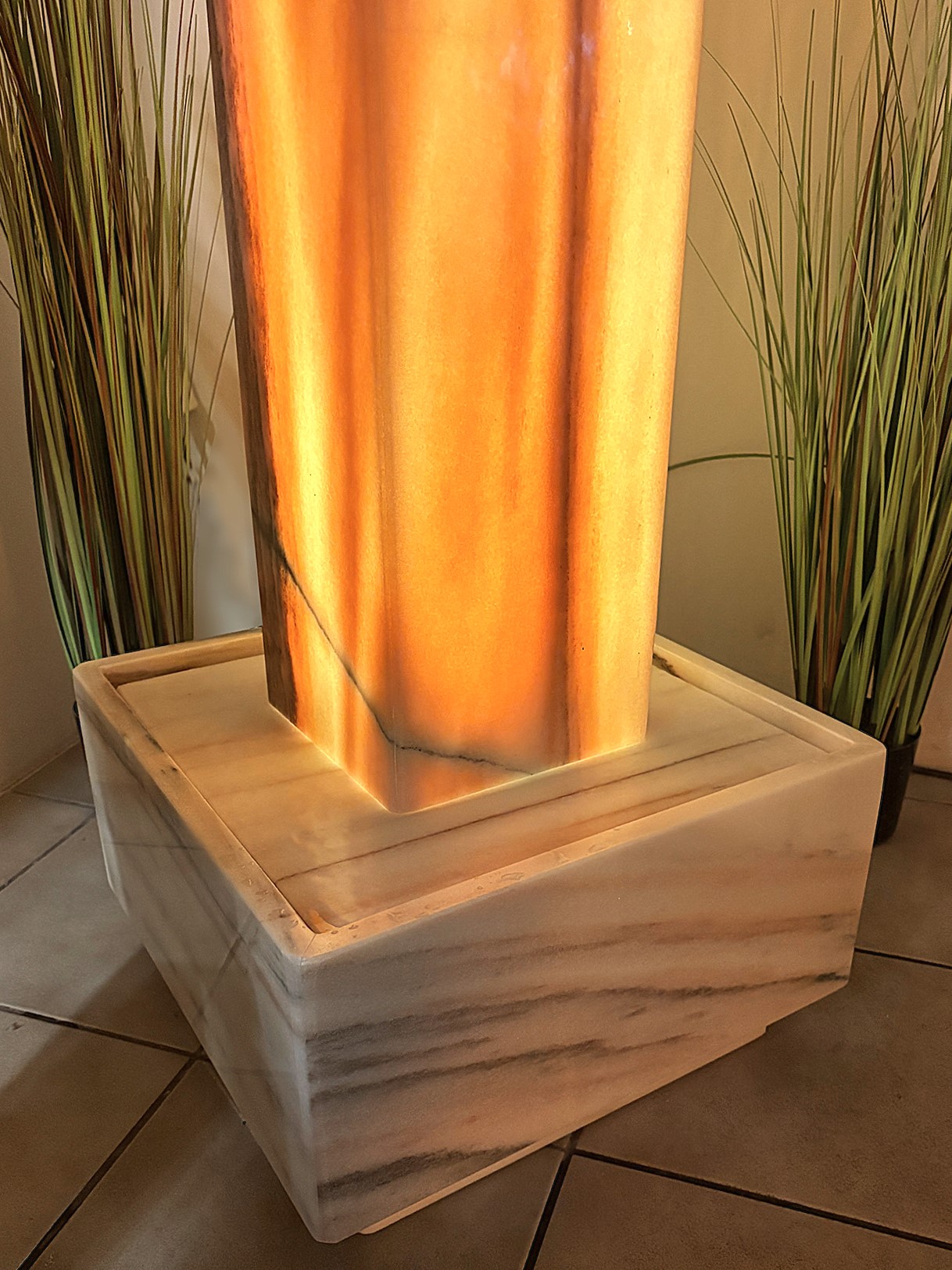 Die elegante Brunnenstele aus edlem Sölker Marmor ist als Hohlkörper gefertigt und wird im Inneren von einem LED-Scheinwerfer sanft zum Leuchten gebracht. Durch ihre stattliche Größe entfaltet diese außergewöhnliche Licht- und Wasserstele nicht nur eine beeindruckende optische Wirkung, sondern dient zugleich als effektiver Luftbefeuchter.