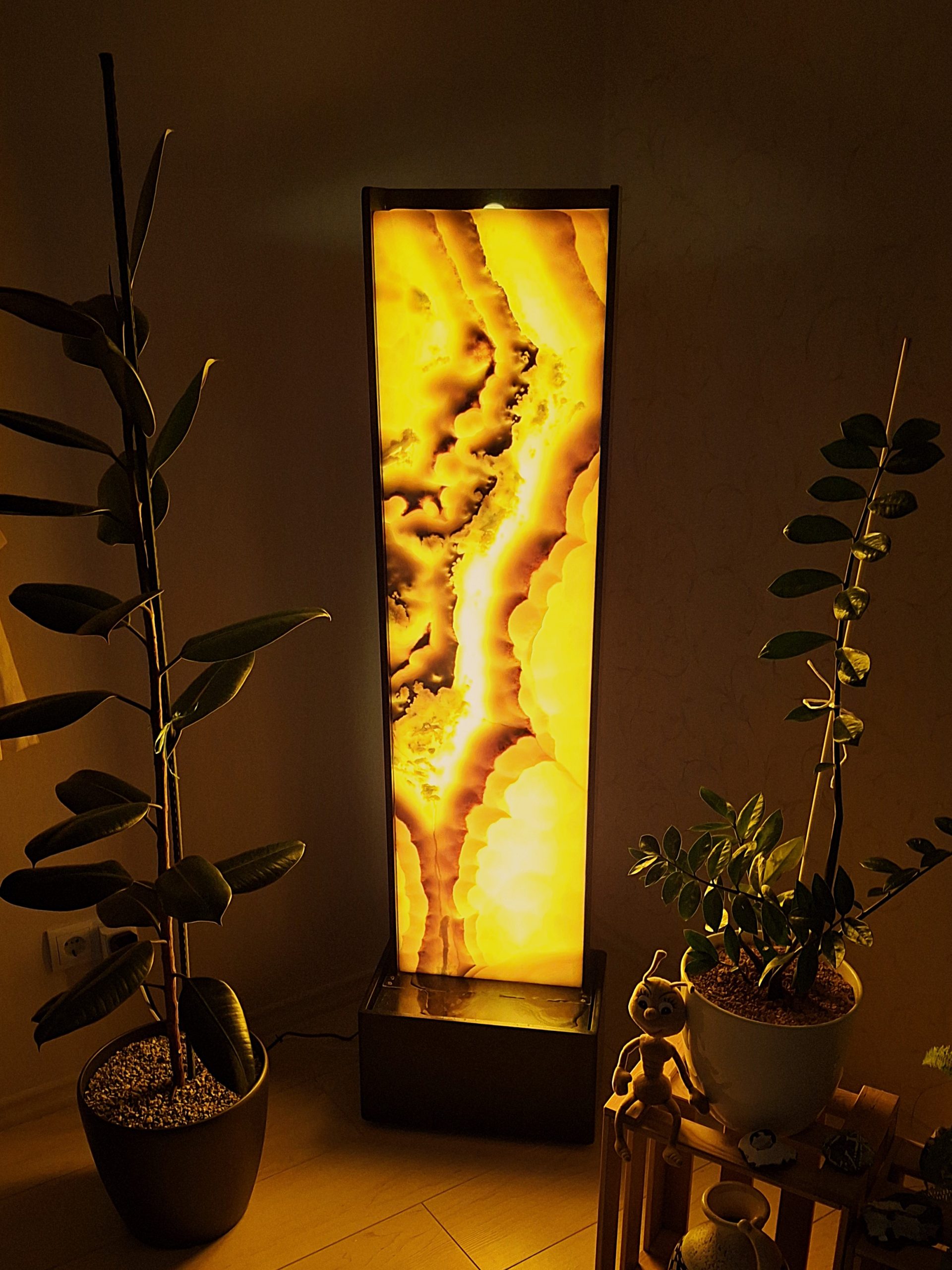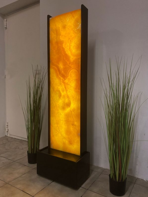 Dieses Brunnenmodell begeistert durch seine sehr starke Leuchtkraft. Die 2cm starke edle Onyx-Platte, über die das Wasser sanft herunterfließt, ist eingefasst in einem schwarzen Kunststein-Rahmen. Dieses Material ist extrem robust und verleiht dem Brunnen die notwendige Stabilität. Trotz seiner stattlichen Größe ist dieser Brunnen nicht allzu schwer und gut zu handhaben.