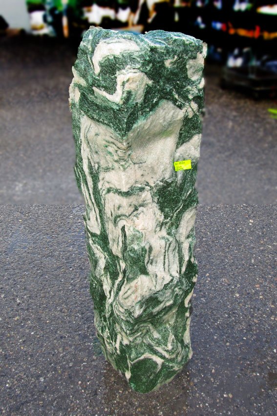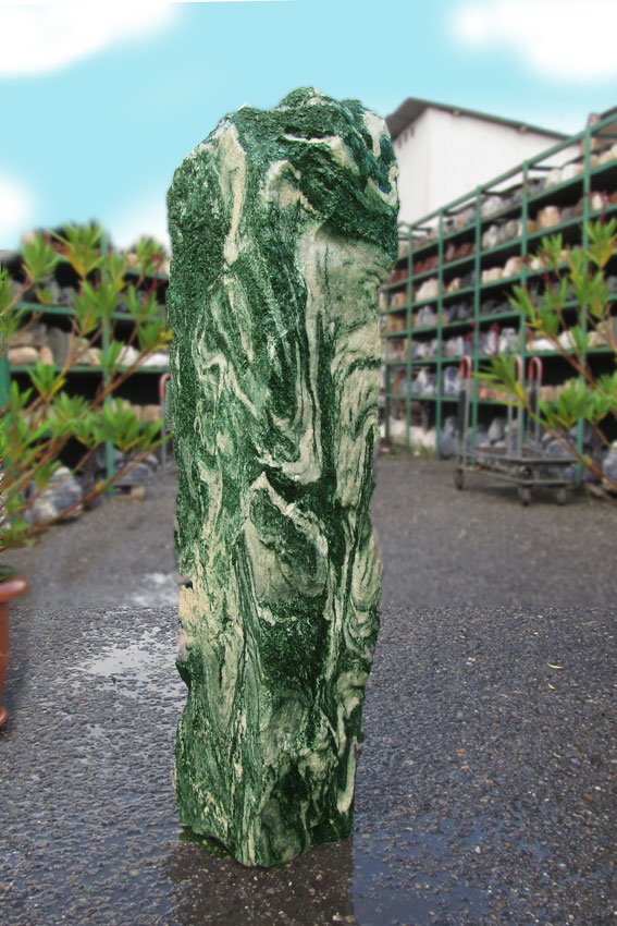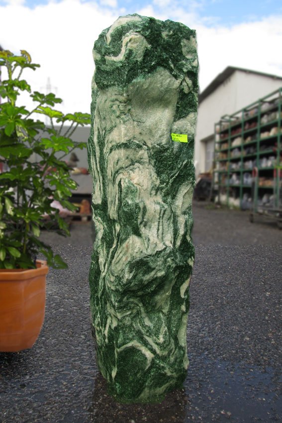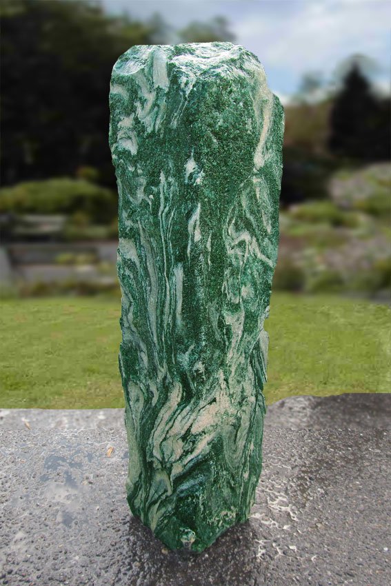 Herrlich gefärbter und geaderter Quarzit mit hohem Fuchsit-Anteil aus dem hohen Norden. (Herkunft Norwegen – Oberhalb des Polarkreises !) Das satte tiefe Grün dieses Materials sucht seinesgleichen. Das Material ist 100% frostsicher!