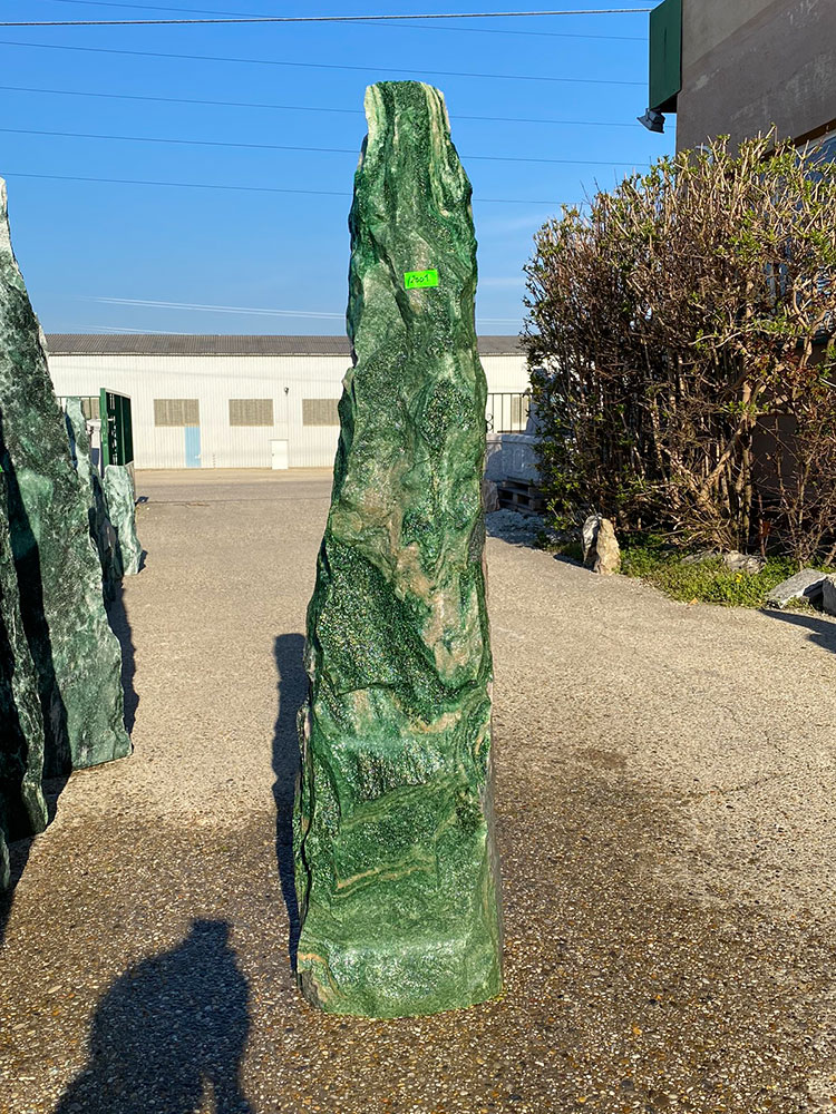 Herrlich gefärbter und geaderter Quarzit mit hohem Fuchsit-Anteil aus dem hohen Norden (Herkunft: Norwegen – Oberhalb des Polarkreises!). Das satte tiefe Grün dieses Materials sucht seinesgleichen. Das Material ist 100% frostsicher!