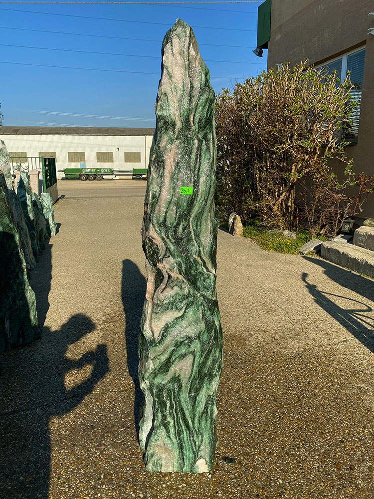 Herrlich gefärbter und geaderter Quarzit mit hohem Fuchsit-Anteil aus dem hohen Norden (Herkunft: Norwegen – Oberhalb des Polarkreises!). Das satte tiefe Grün dieses Materials sucht seinesgleichen. Das Material ist 100% frostsicher!