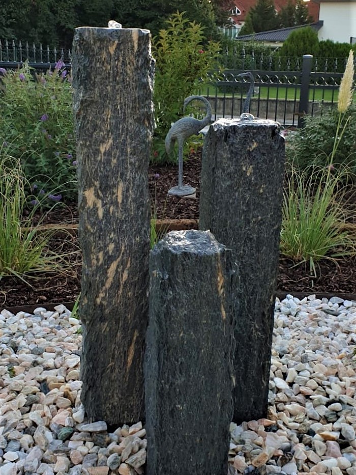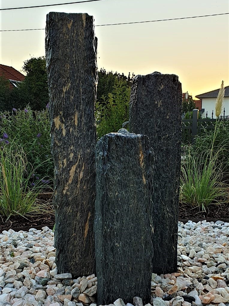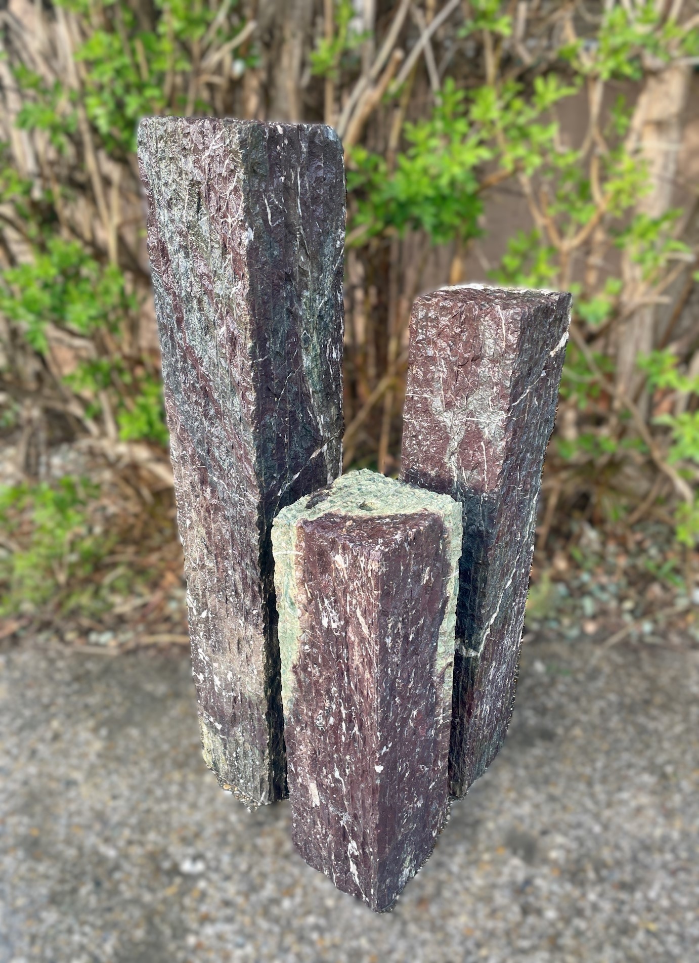 Die drei abgestuften rustikalen Natursteinstelen aus dem Marmor “Cloudy Levante” bilden eine schöne Gruppe die Ruhe und Stärke ausstrahlt. Die felsigen Stelen vereinen modernes Design mit rustikalem Stil.