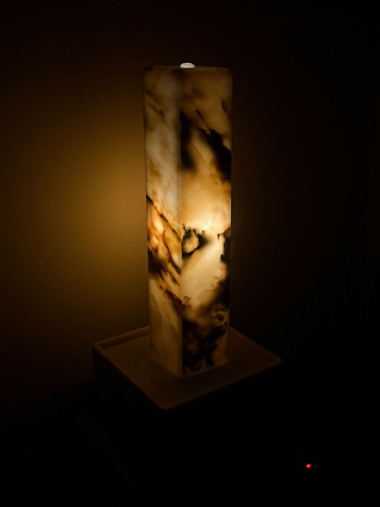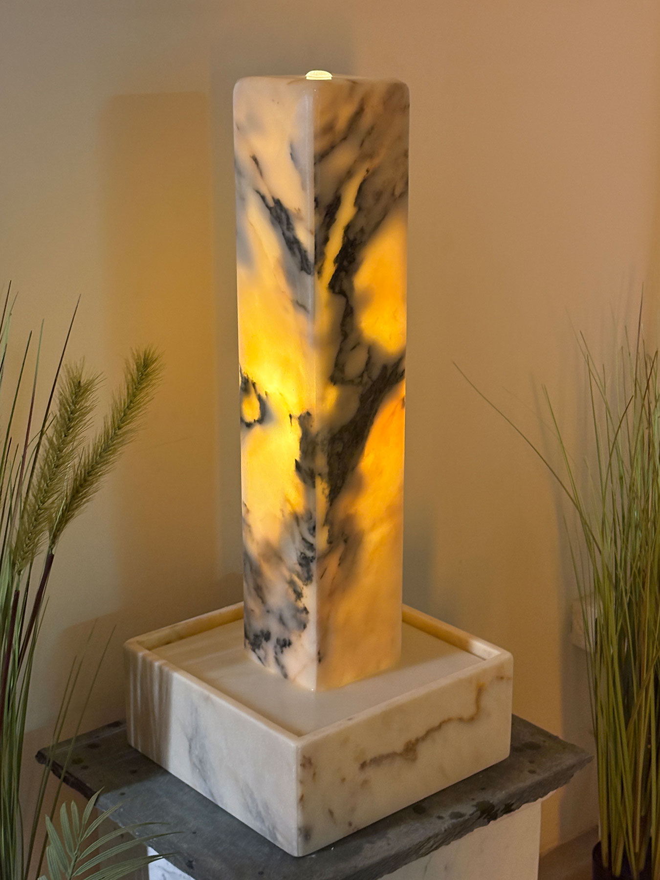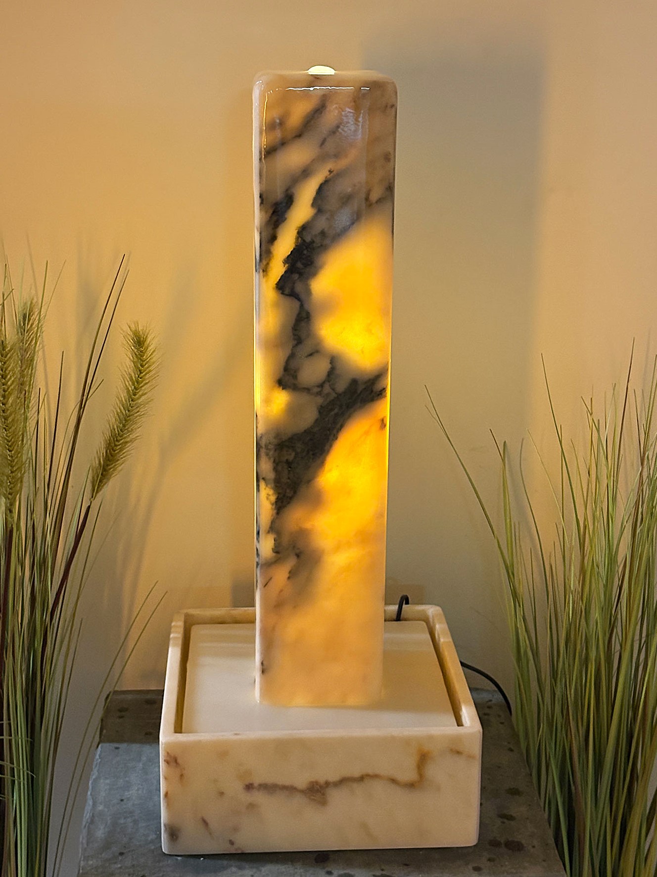 Der kompakte und zugleich außergewöhnliche Lichtbrunnen begeistert durch seine warmen Farbtöne und die feine, natürliche Marmorzeichnung. Das sanfte Licht, das durch den Stein schimmert, schafft eine angenehme, ruhige Atmosphäre und verleiht jedem Raum eine besondere Ausstrahlung.