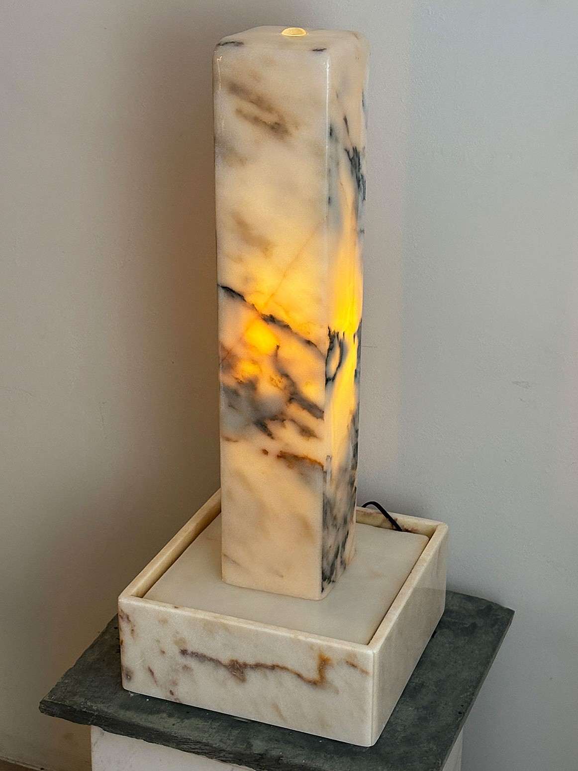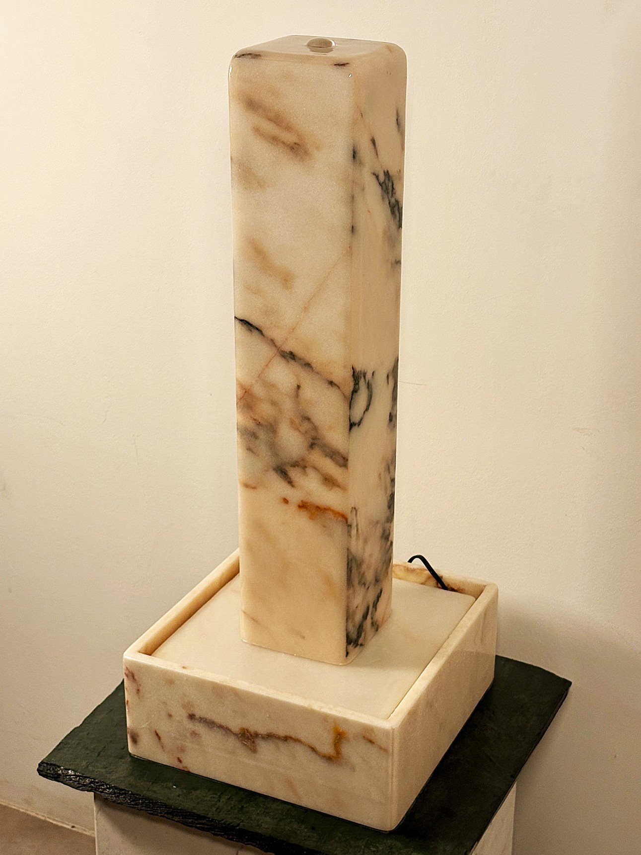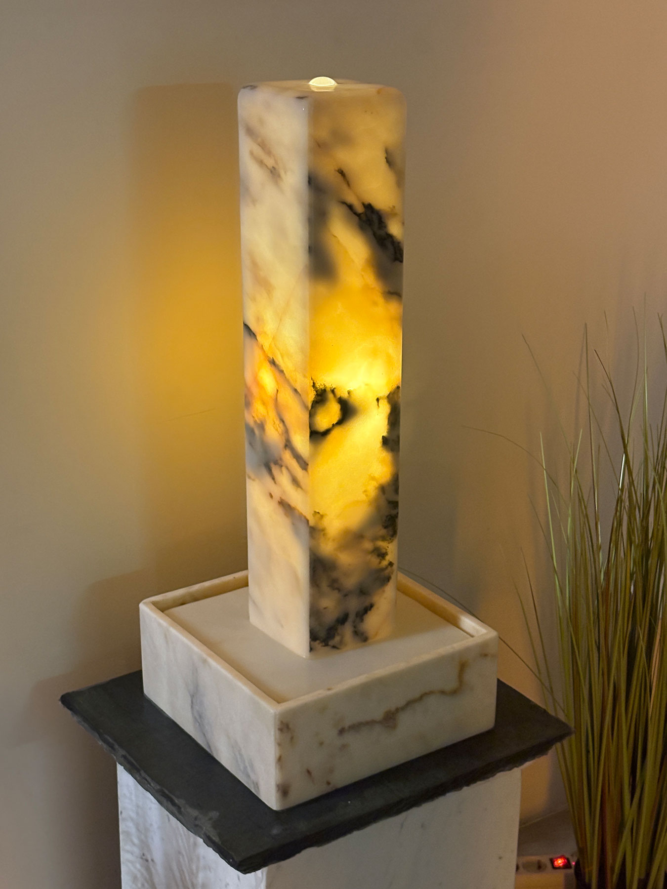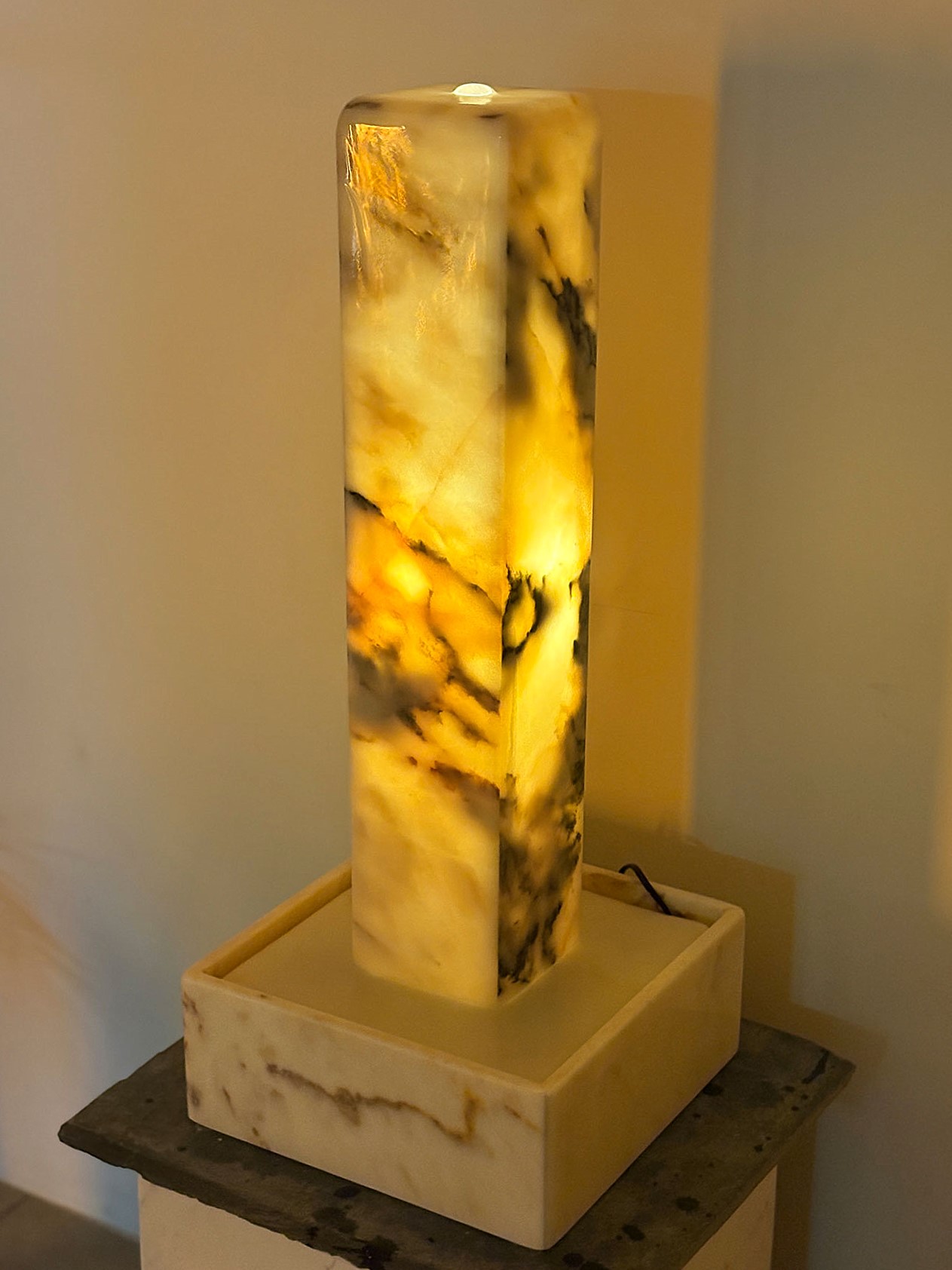 Der kompakte und zugleich außergewöhnliche Lichtbrunnen begeistert durch seine warmen Farbtöne und die feine, natürliche Marmorzeichnung. Das sanfte Licht, das durch den Stein schimmert, schafft eine angenehme, ruhige Atmosphäre und verleiht jedem Raum eine besondere Ausstrahlung.