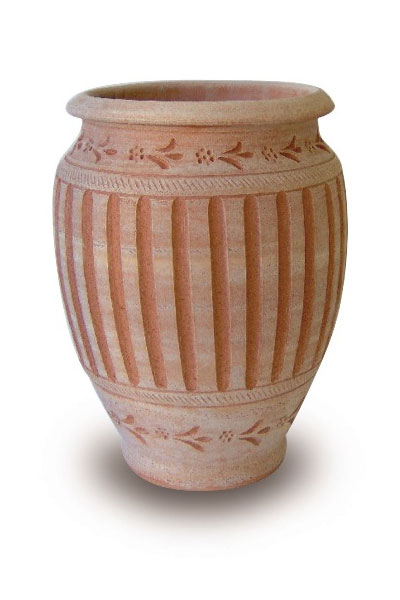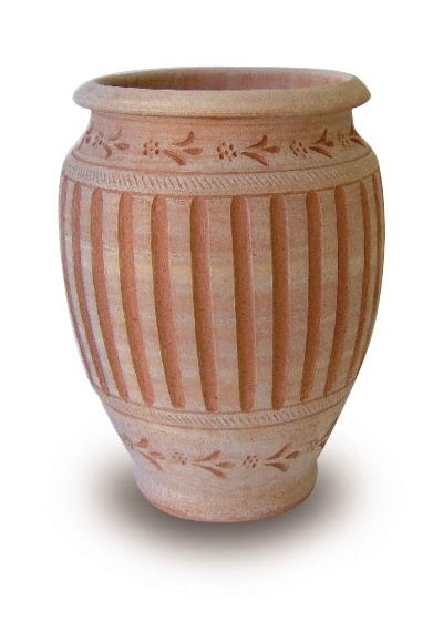Dieses Pflanzengefäß ist im antiken Stil gefertigt und könnte aus einer Tempelanlage stammen. Es ist reich verzieht und eignet sich zum Bepflanzen oder als Dekoration. Das Material besteht aus Terracotta.
