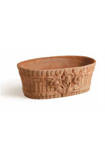 Dieses wunderschöne Pflanzengefäß hat die Form eines ovalen Holzschaffels. Es ist mit Sonnenblumen verziert und eignet sich zum Bepflanzen mit Ihren Lieblingspflanzen.