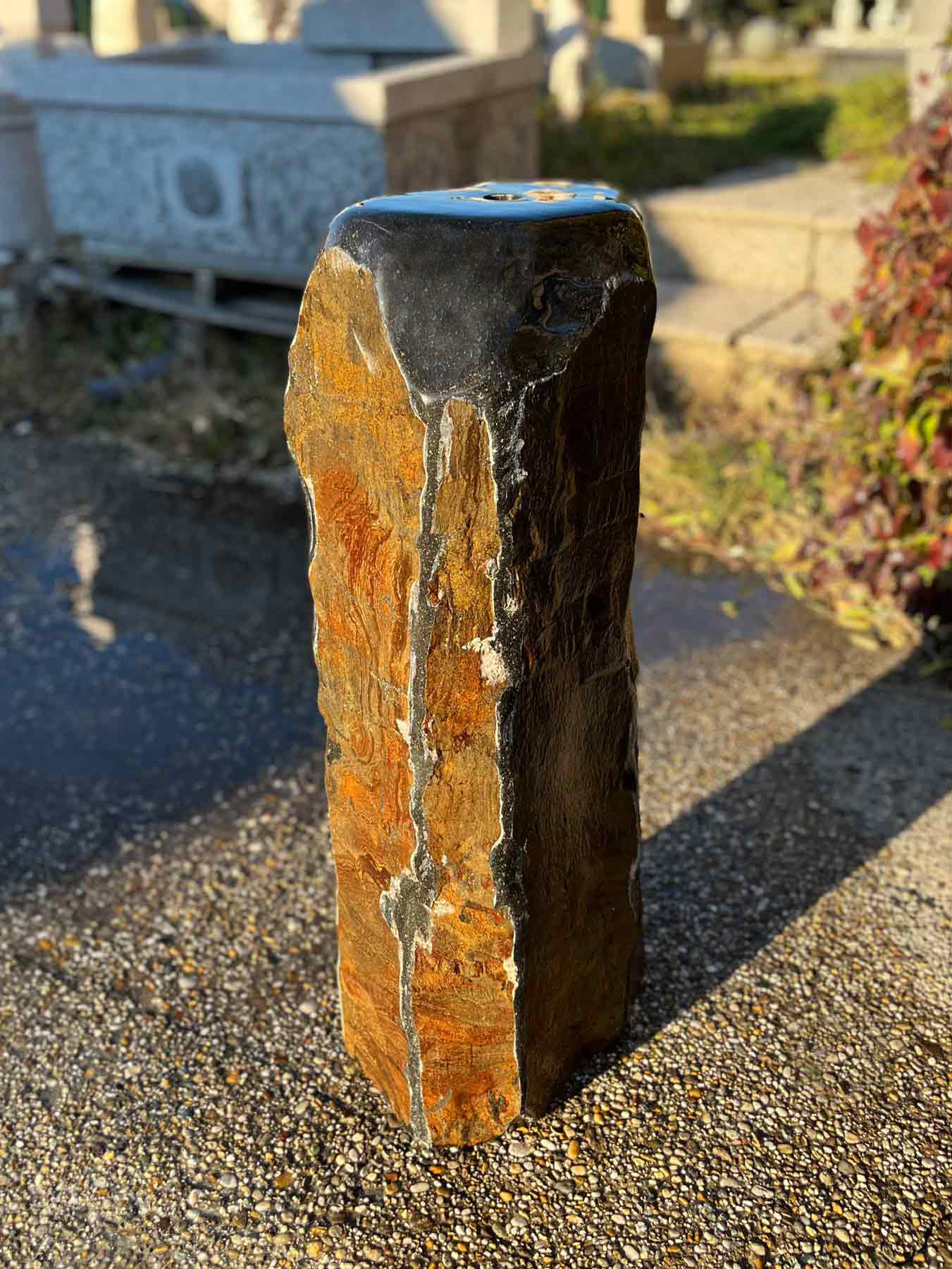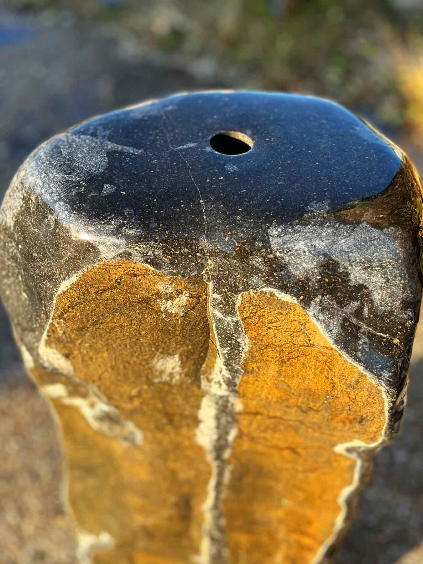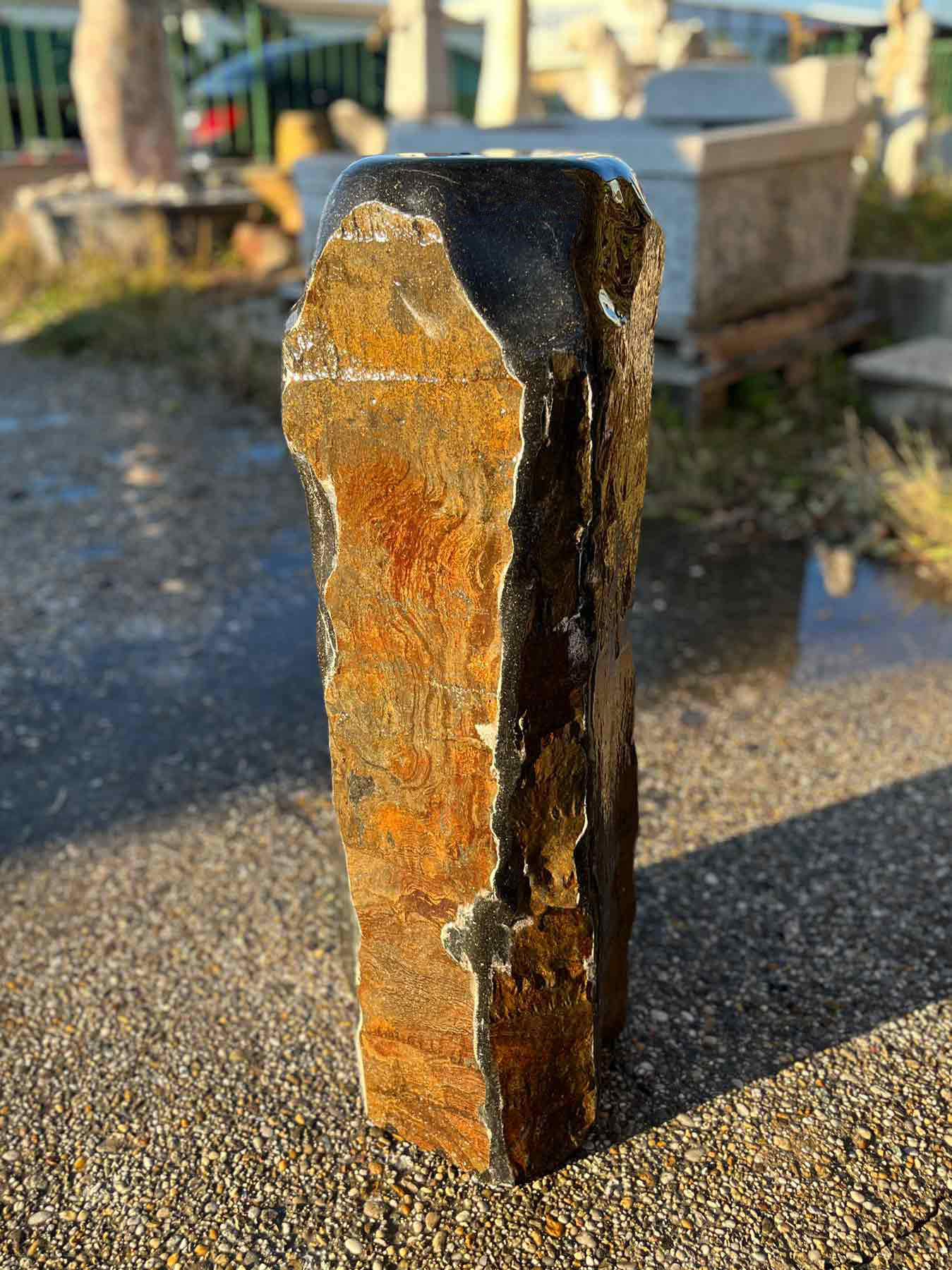 Dieser schwarze Basalt mit teilweise naturbelassen bräunlichen Flächen ist ein echter Blickfang und fügt sich perfekt in jedes Ambiente ein.
