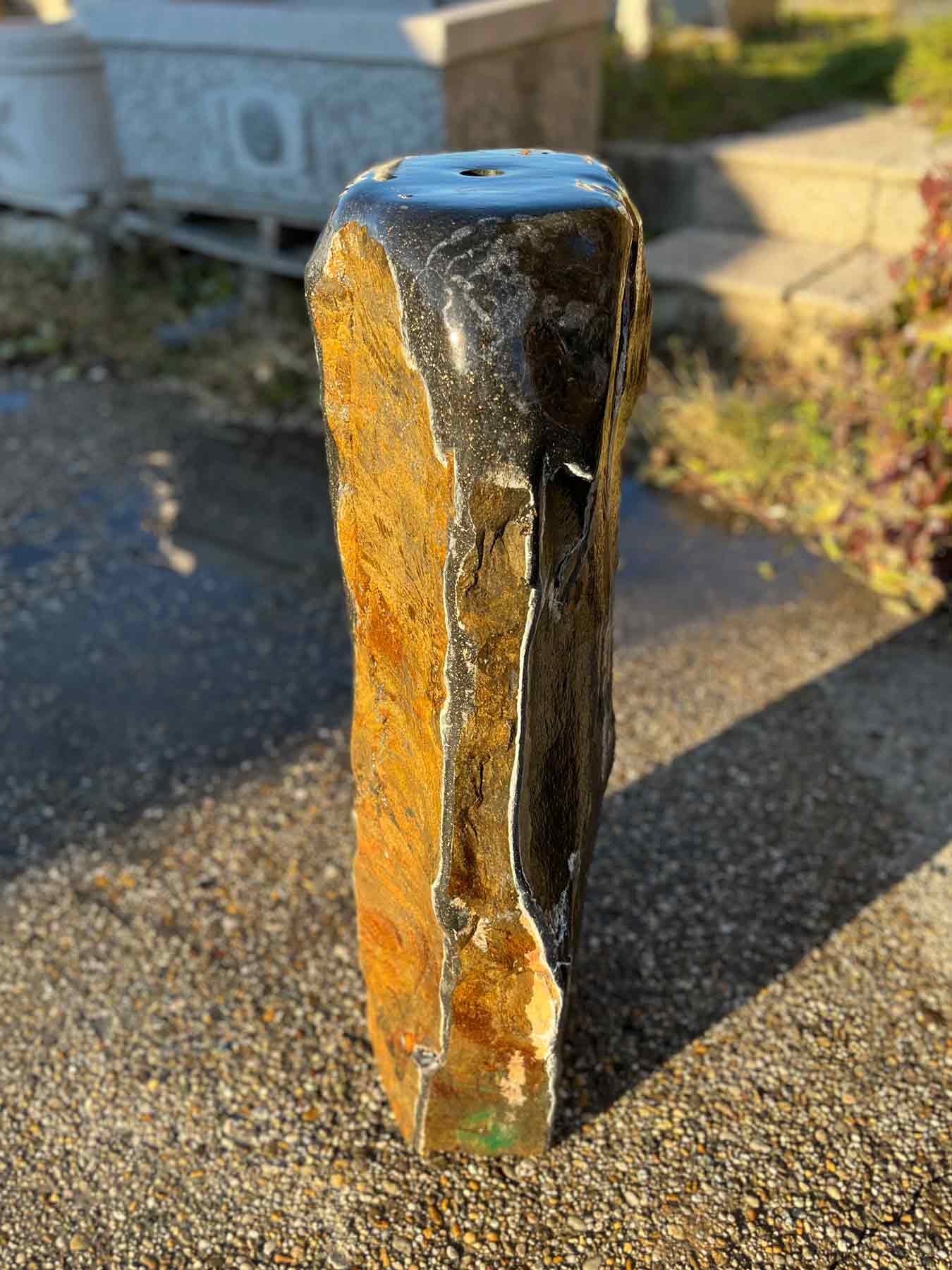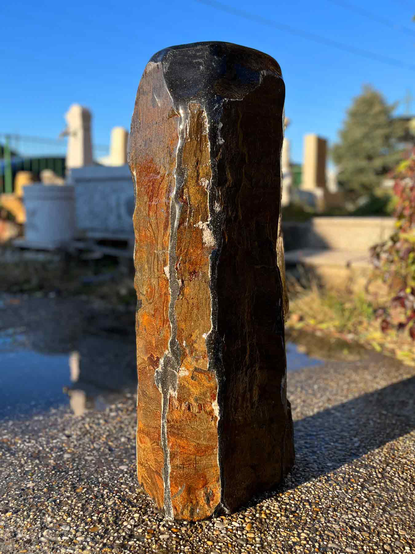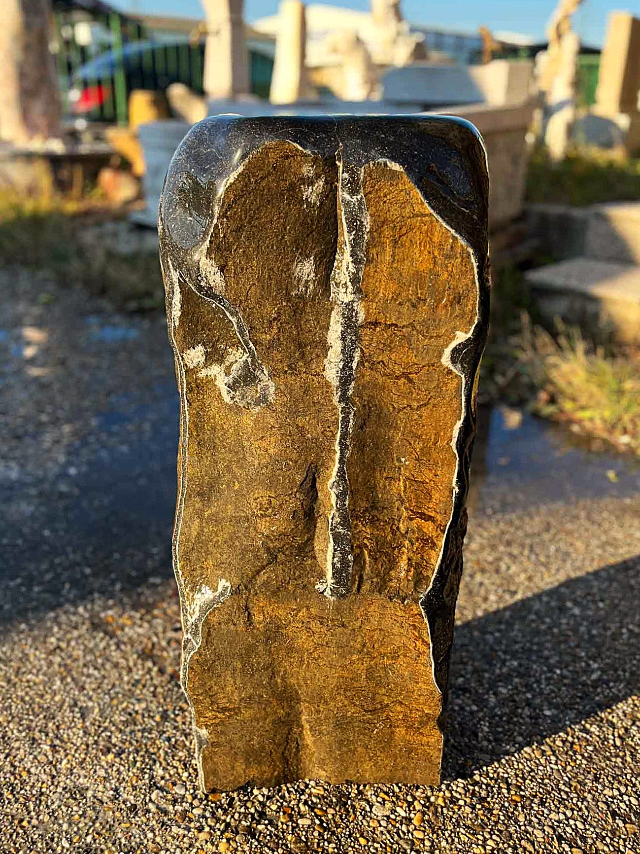 Dieser schwarze Basalt mit teilweise naturbelassen bräunlichen Flächen ist ein echter Blickfang und fügt sich perfekt in jedes Ambiente ein.
