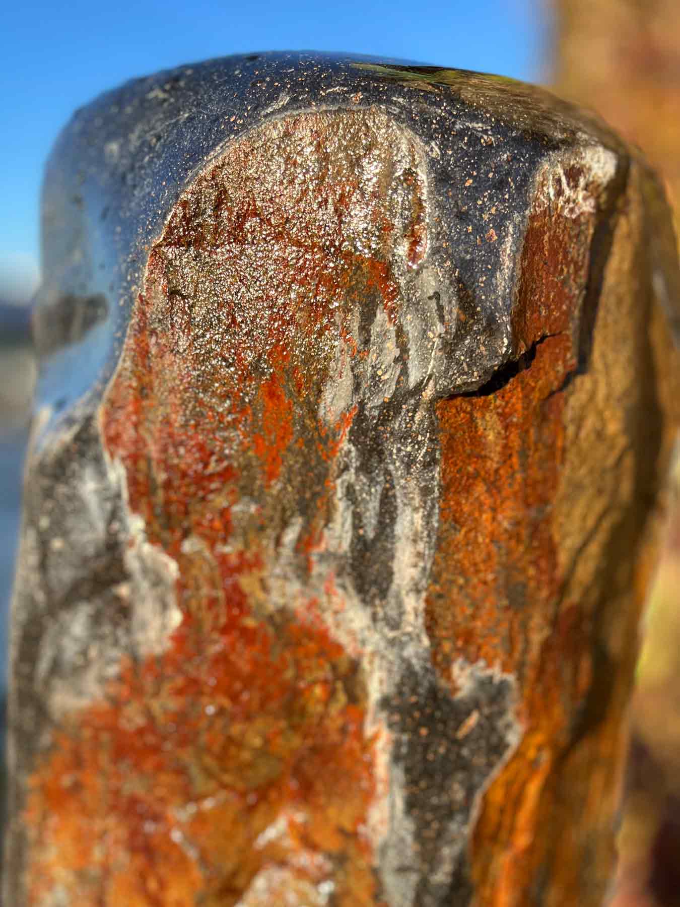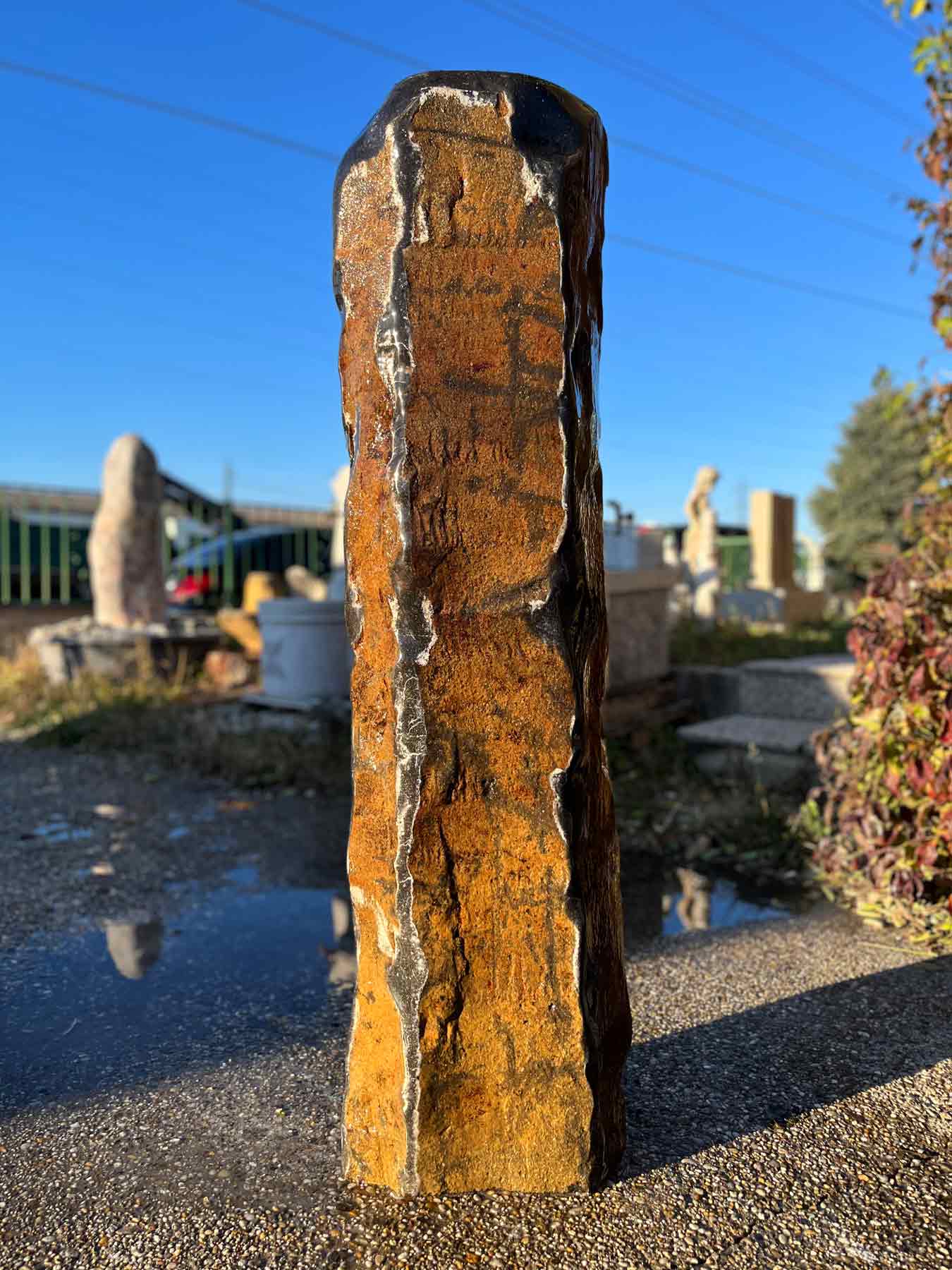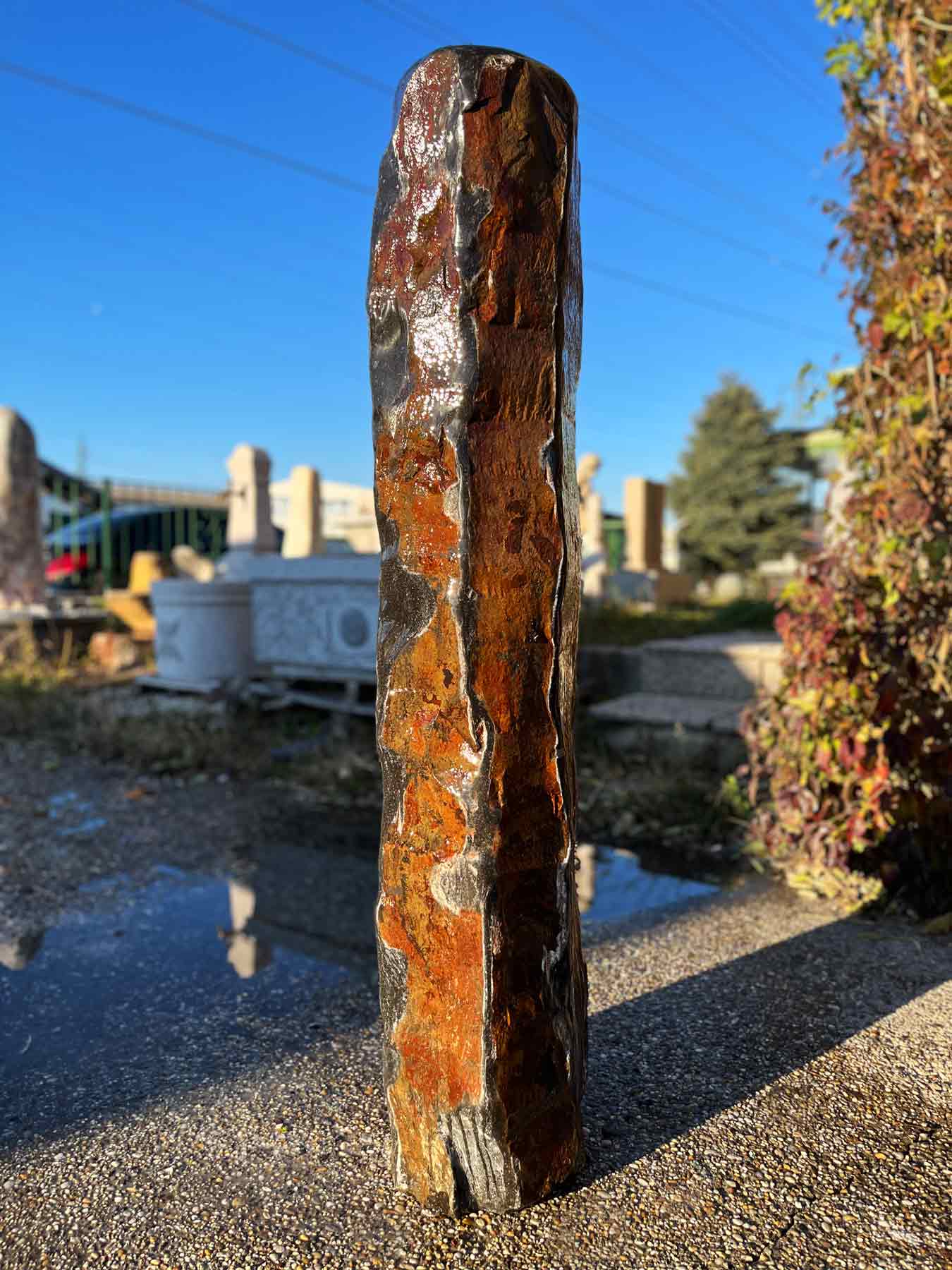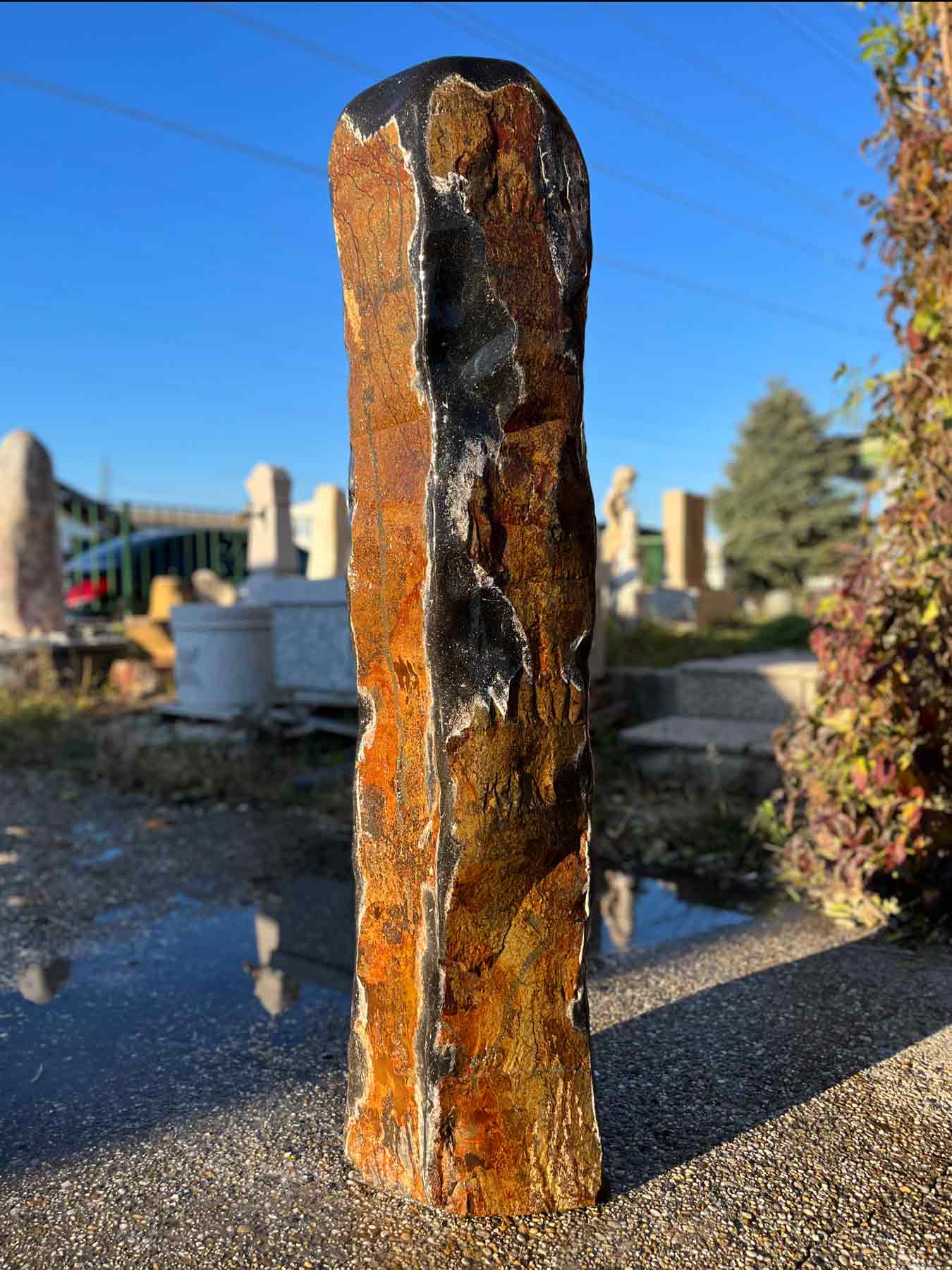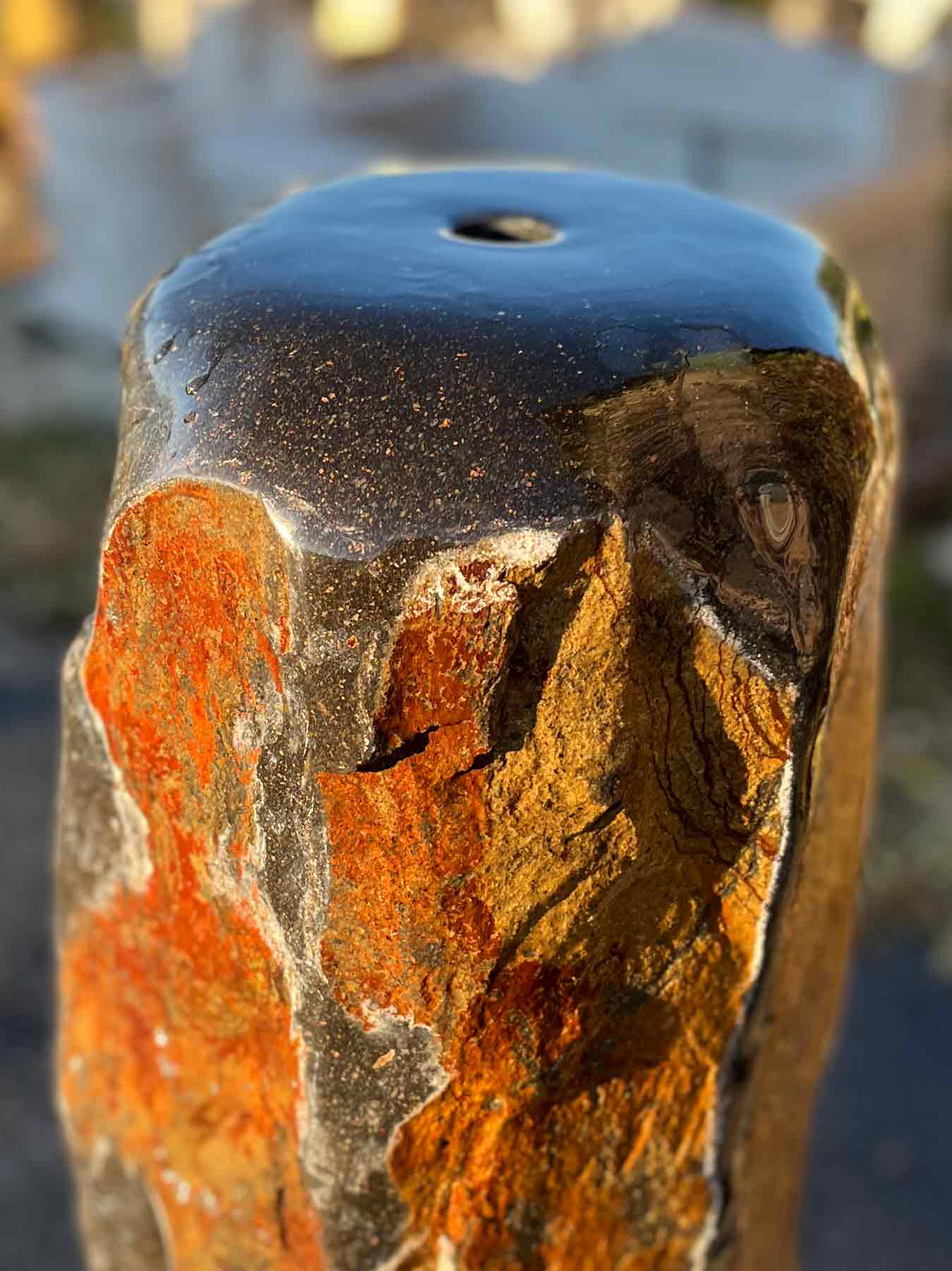 Dieser schwarze Basalt mit teilweise naturbelassen bräunlichen Flächen ist ein echter Blickfang und fügt sich perfekt in jedes Ambiente ein.