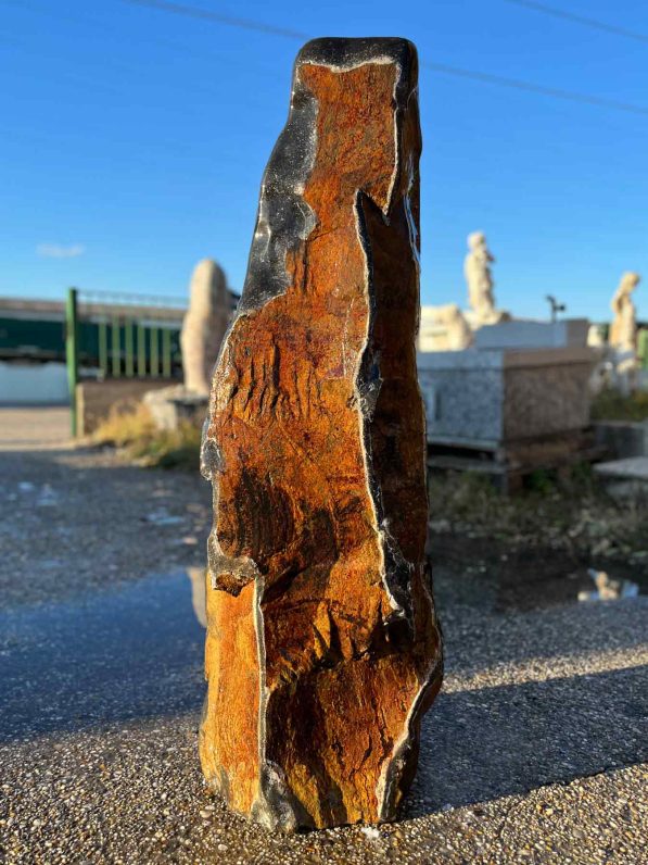 Dieser schwarze Basalt mit teilweise naturbelassen bräunlichen Flächen ist ein echter Blickfang und fügt sich perfekt in jedes Ambiente ein.
