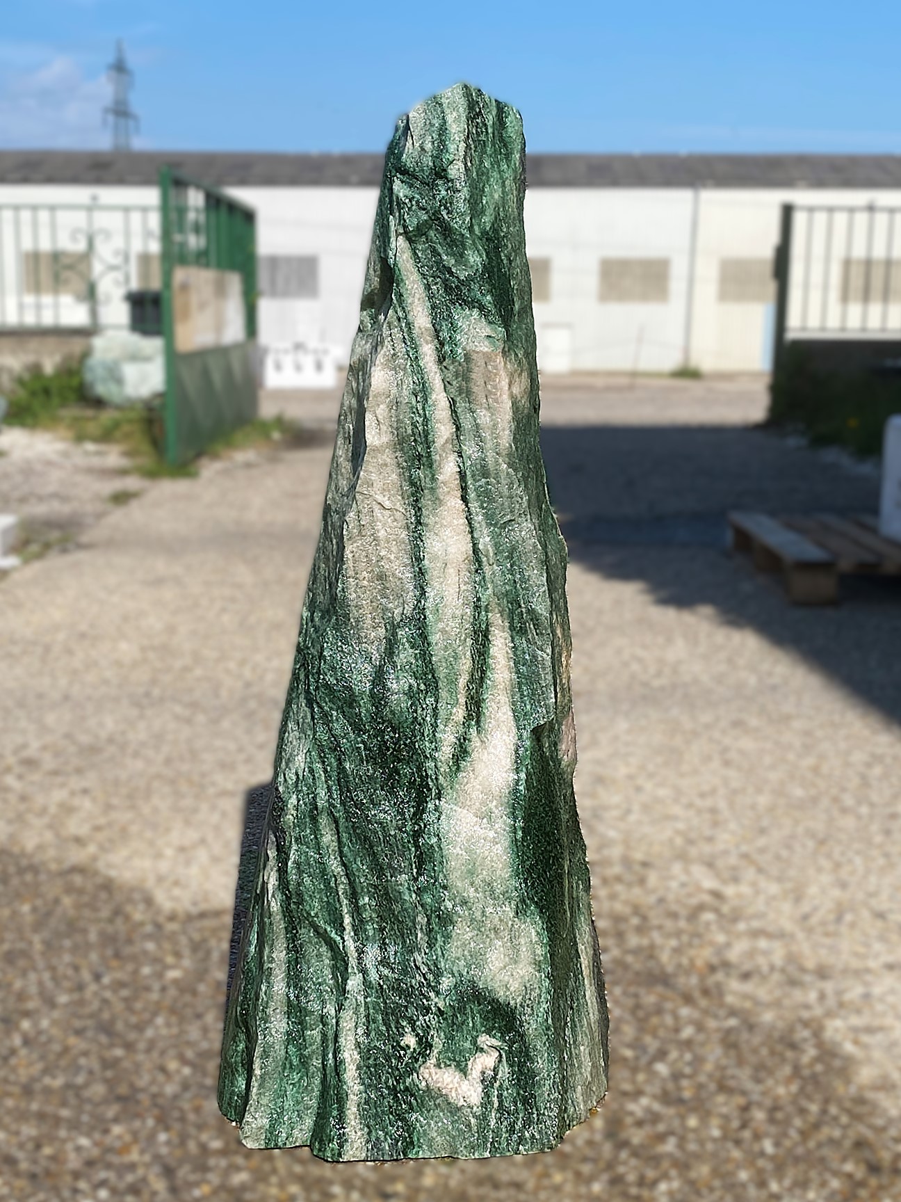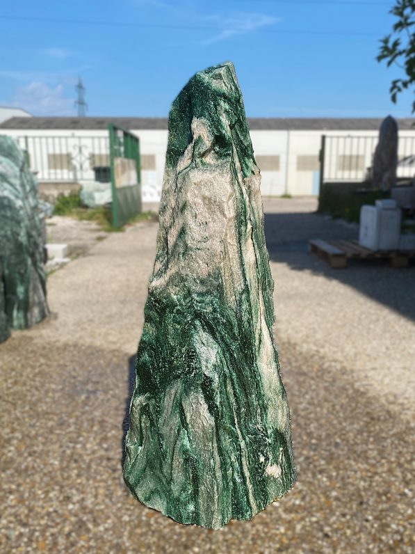 Atemberaubend ist dieser wundervoll gefärbte und geäderte Quarzit mit einem hohen Anteil an Fuchsit. Der Stein stammt aus dem hohen Norden Norwegens, oberhalb des Polarkreises. Er beeindruckt mit seinem satten, tiefen Grün.
