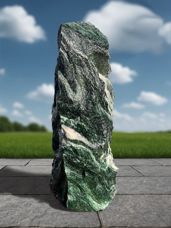 Atemberaubend ist dieser wundervoll gefärbte und geäderte Quarzit mit einem hohen Anteil an Fuchsit. Der Stein stammt aus dem hohen Norden Norwegens, oberhalb des Polarkreises. Er beeindruckt mit seinem satten, tiefen Grün.