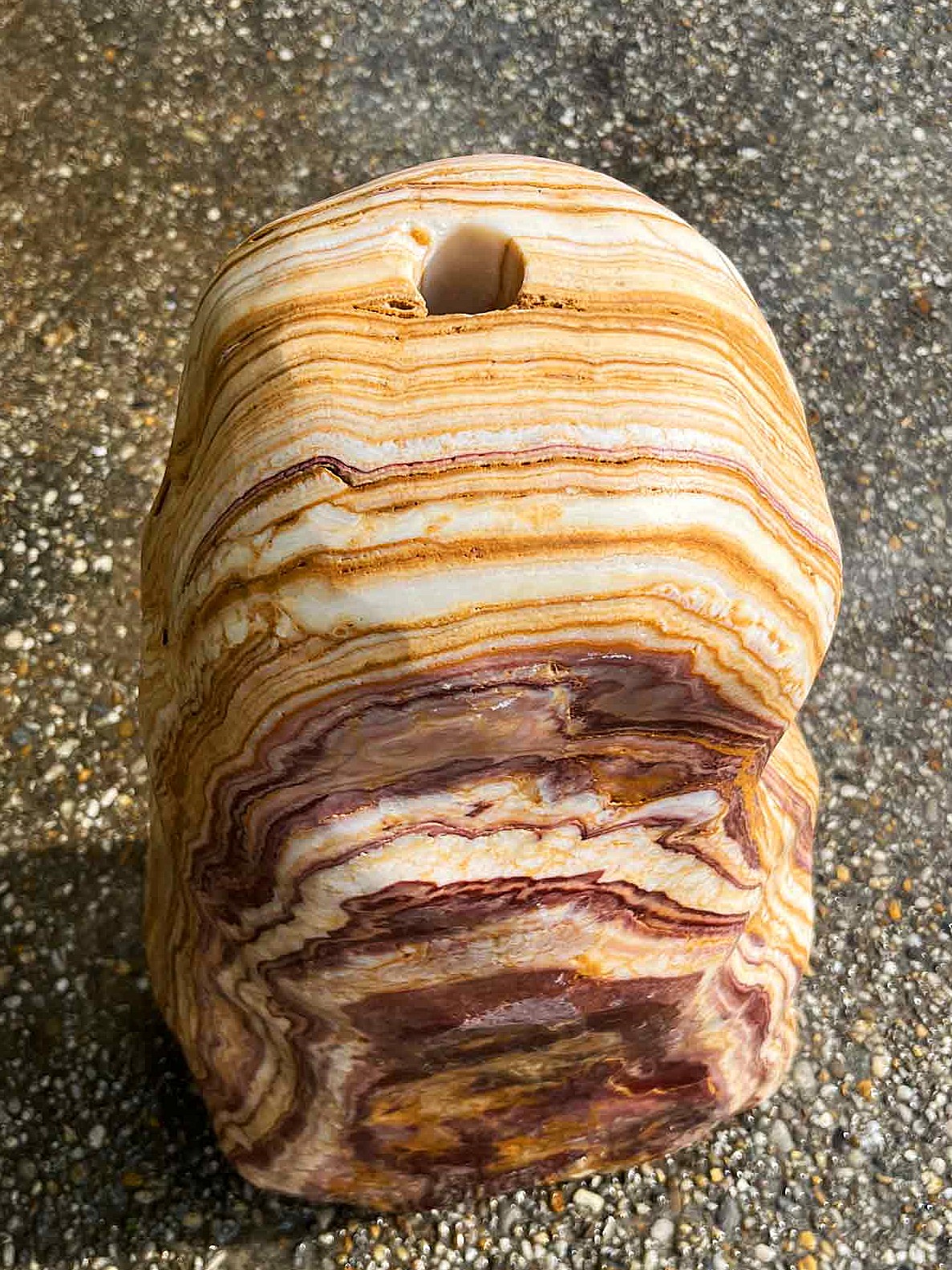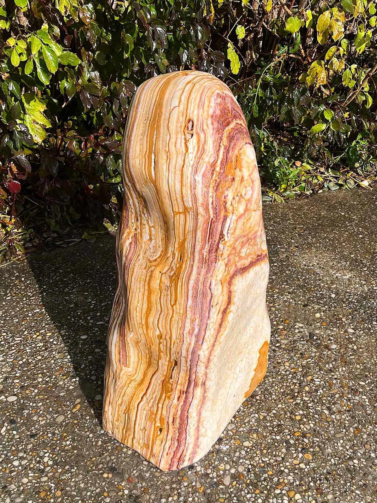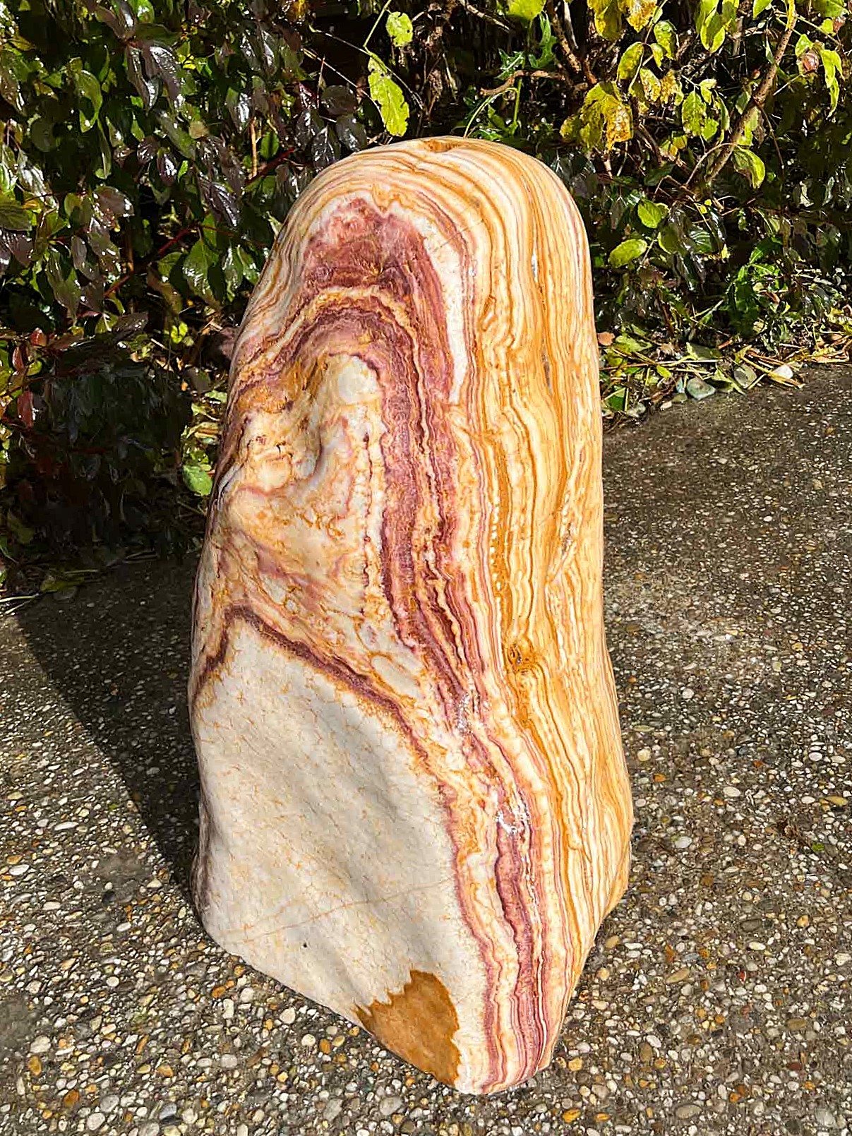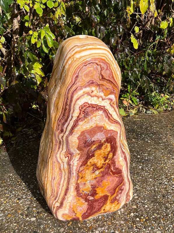 Dieser schön gestreifte Onyx aus dem Ägäis-Raum besticht durch seine feine Zeichnung und durch sein wunderbares Farbenspiel. Dieser Stein wird ein herrlicher Blickfang in Ihrem Garten sein.