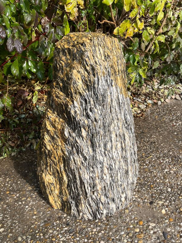 Die stabförmige Oberflächenstruktur des gestreiften Gneis erinnert an versteinertes Holz. Dieses außergewöhnliche Material stammt aus dem Ägäis-Raum.