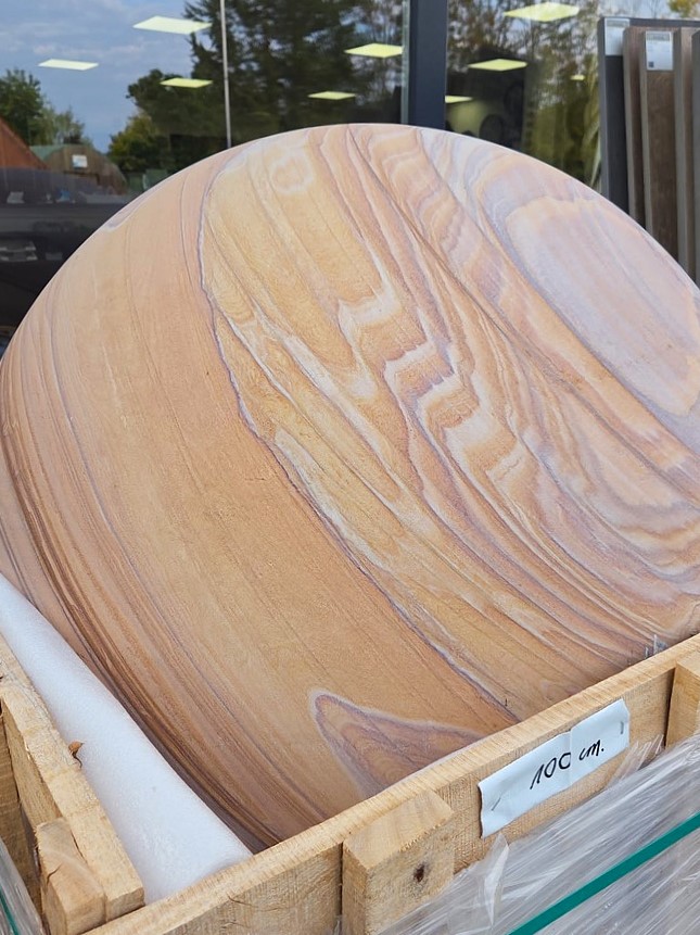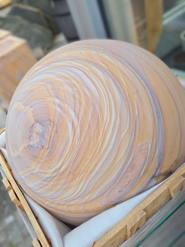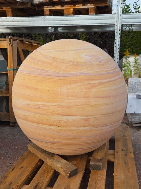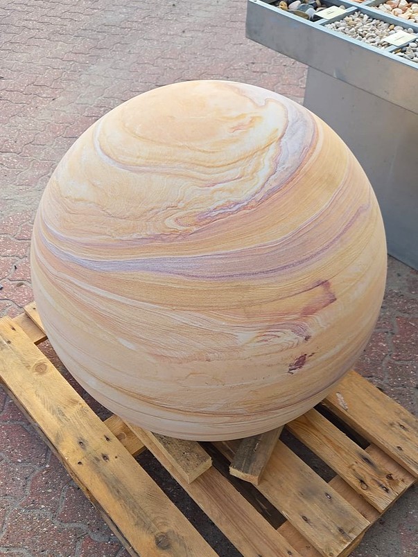 Aus massivem Regenbogen-Quarzsandstein hergestellte Kugel mit geschliffener Oberfläche. Dieses wunderschöne Sandsteinmaterial stammt aus Indien.