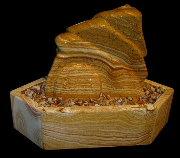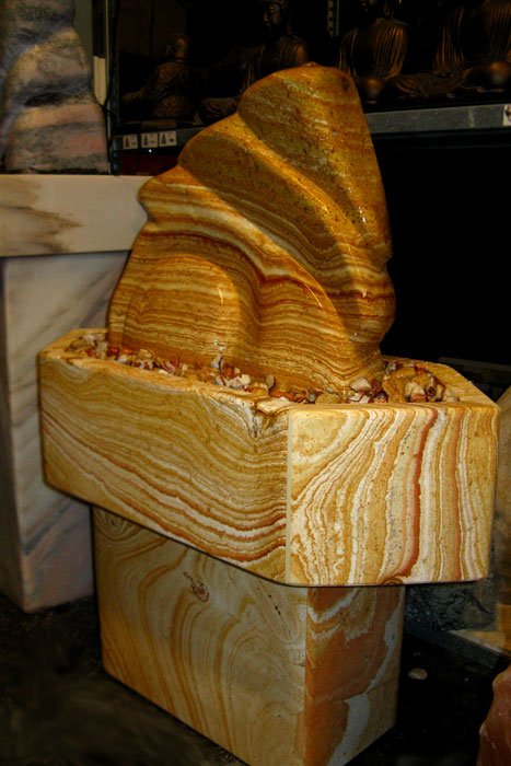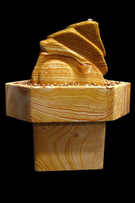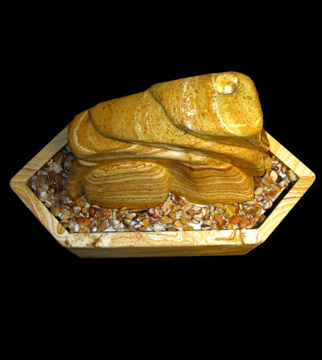 Sorgfältig und mit viel Gefühl gearbeitete Bildhauer-Arbeit aus dem schönen Regenbogen-Sandstein. Die speziell für diesen Stein angefertigte Sandsteinwanne mit Sockel runden das harmonische Gesamtbild ab. Ein absolutes Unikat.