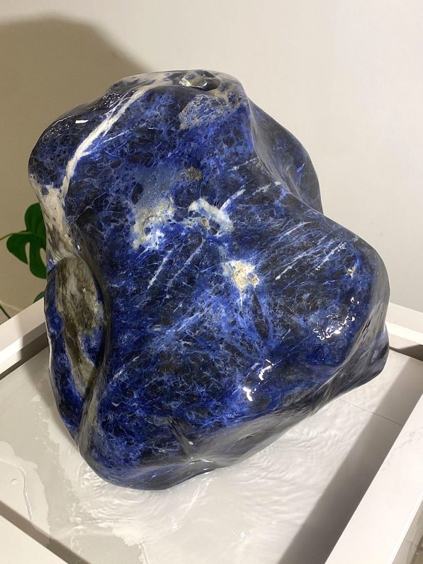 Mit meisterhafter Handwerkskunst wurde dieser hochwertige brasilianische Sodalith in unserer Werkstatt in eine elegante Wasserskulptur verwandelt. Sanft fließt das Wassers über die geschwungenen Formen des stattlichen Brunnensteins und schafft eine beruhigende Atmosphäre.