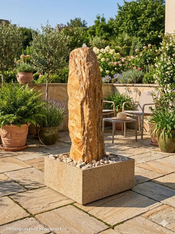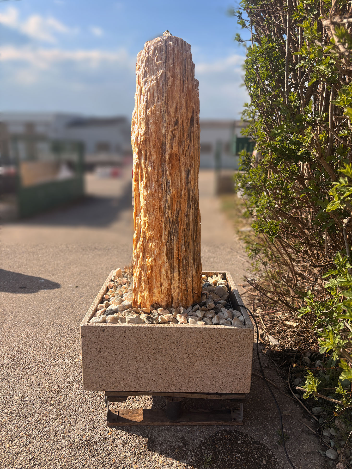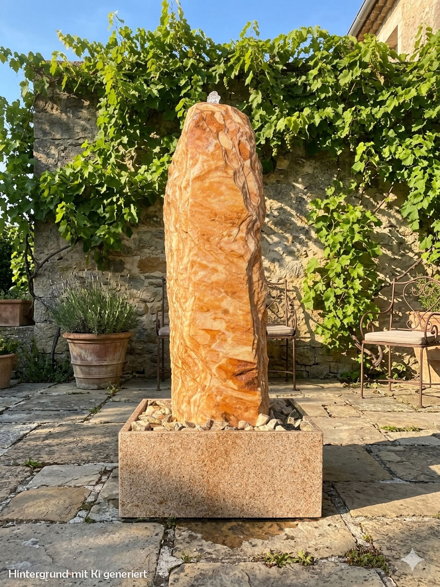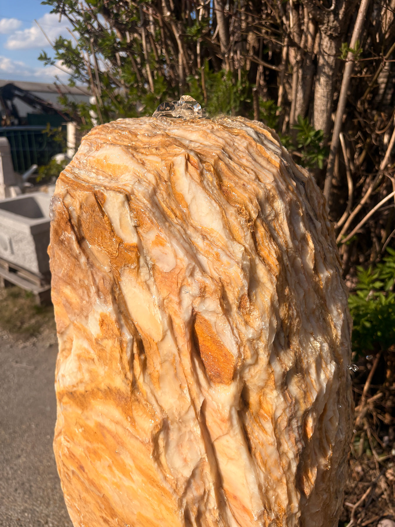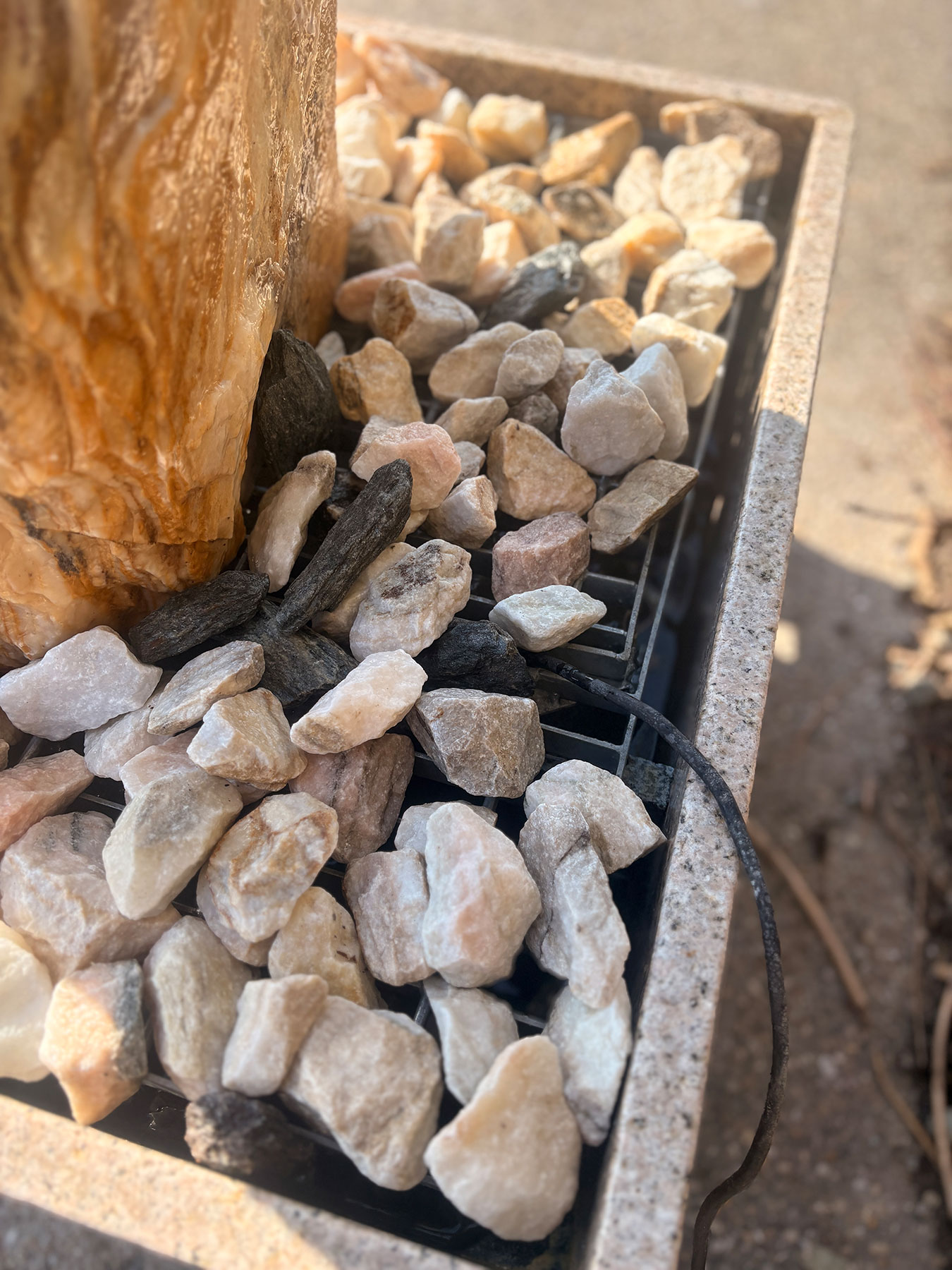 Der imposante, felsige Marmor-Quellstein aus dem Ägäis-Raum ruht auf einem stabilen, verzinkten Gitterrost, der mit hellem Marmor-Zierkiesel abgedeckt ist. Der Gitterrost ist mit praktischen Eingriffsöffnungen versehen, sodass die Pumpe jederzeit mühelos erreichbar ist – ganz ohne den Stein bewegen zu müssen.