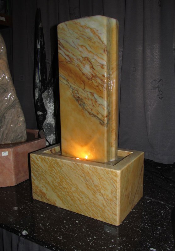 Bei diesem Brunnen handelt es sich um eine Tisch-Wasserwand aus dem hochwertigen und seltenen Material Macauba Giallo aus Brasilien.