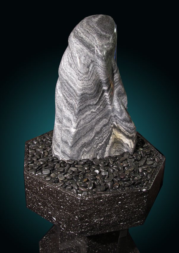 Der vornehme in graustufen geaderte Marmor wurde in aufwendiger Handarbeit geformt und geschliffen. Das Wasser fließt sanft über die runden Formen dieser Wasserskulptur.