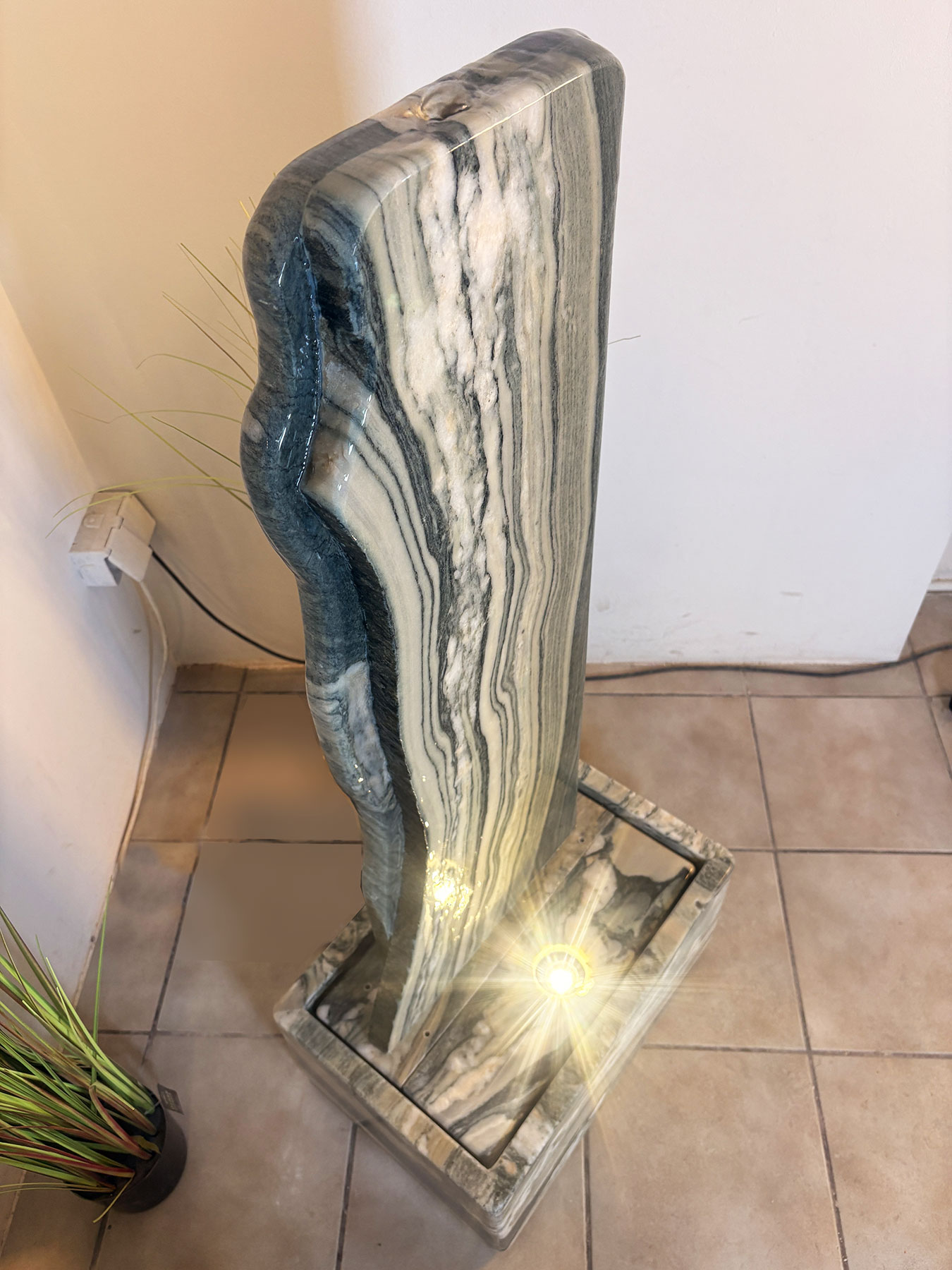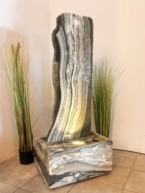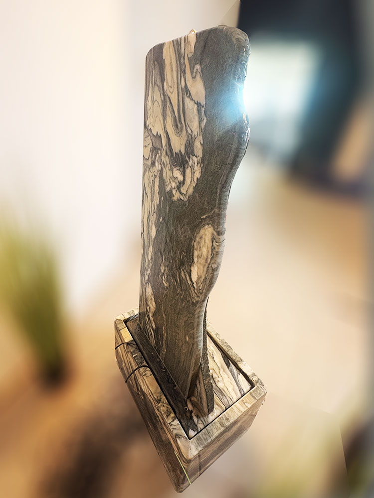 Der edle Marmor besticht durch seine charakteristische Maserung, die jedes Stück zu einem unverwechselbaren Unikat macht und den Brunnen zu einem besonderen Blickfang in jeder Wohnlandschaft erhebt. Bei diesem außergewöhnlichen Modell wurde die Form bewusst der natürlichen Maserung angepasst, sodass die asymmetrische Gestaltung eine ganz eigene, ausgewogene Harmonie entfaltet.
