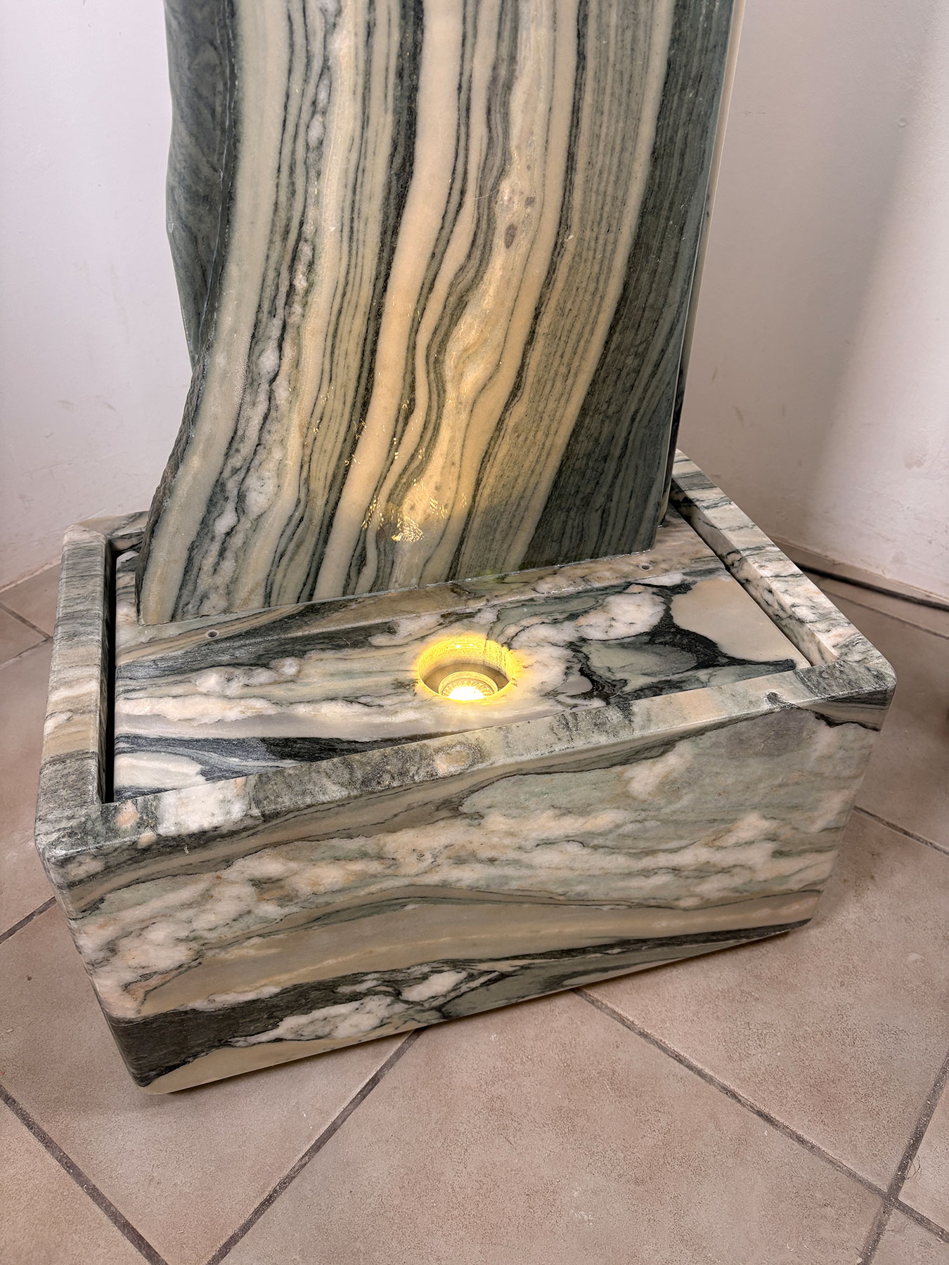 Der Brunnen besteht aus zwei harmonisch aufeinander abgestimmten Elementen. Einer senkrecht stehenden Wasserwand mit Standplatte sowie einer Wanne, die ebenfalls aus diesem exquisiten und seltenen Marmor gefertigt ist.