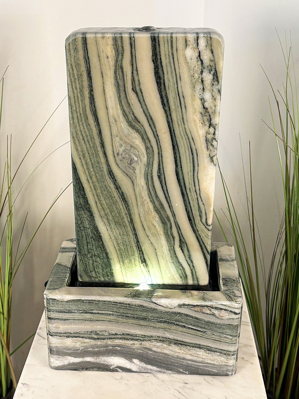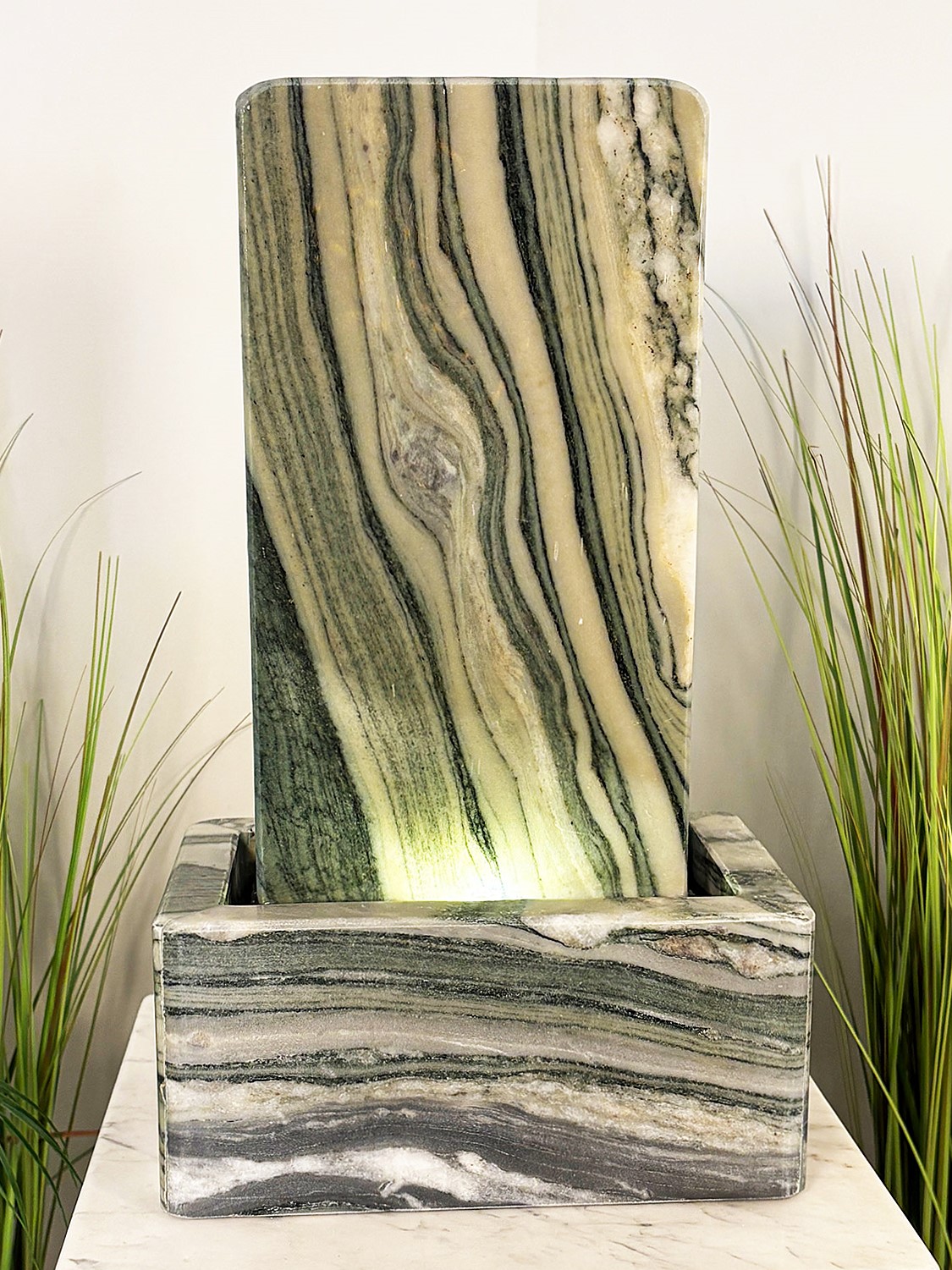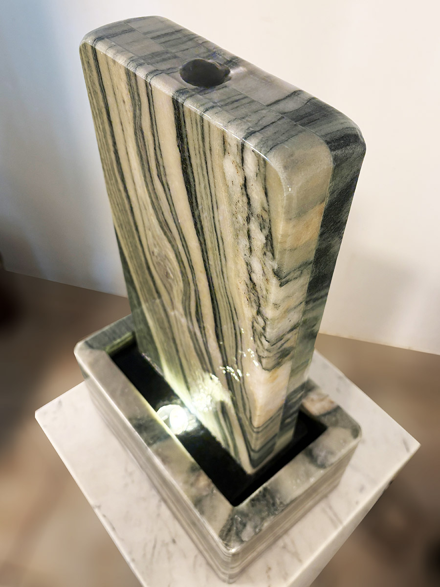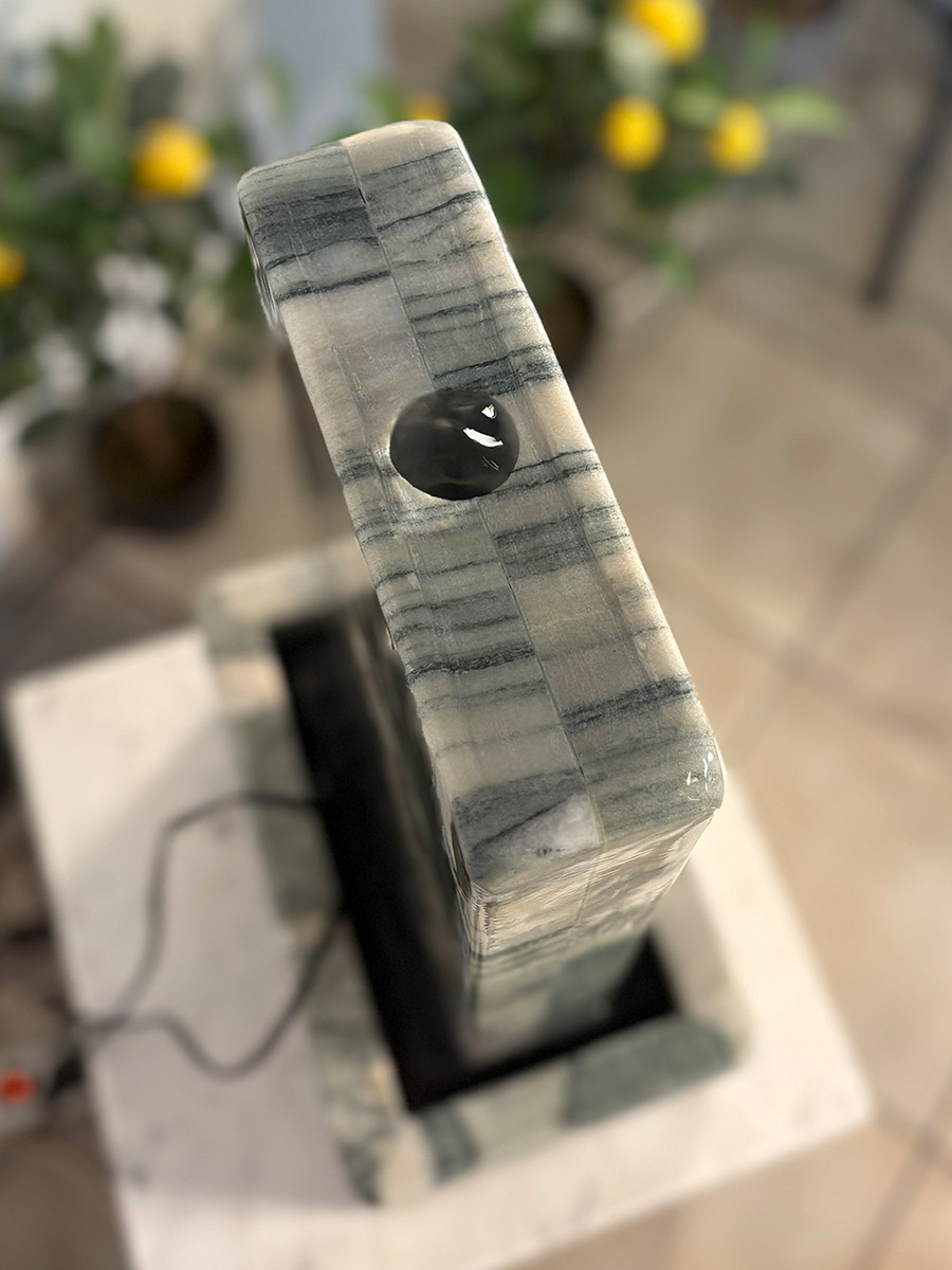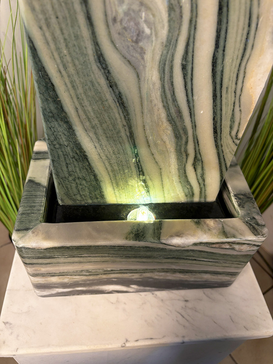 Der Designbrunnen besteht aus zwei perfekt aufeinander abgestimmten Elementen. Einer senkrechten Wasserwand mit Standplatte, über die das Wasser sanft herabfließt, sowie einer Brunnenwanne aus demselben Marmor, die als Wasserreservoir dient.