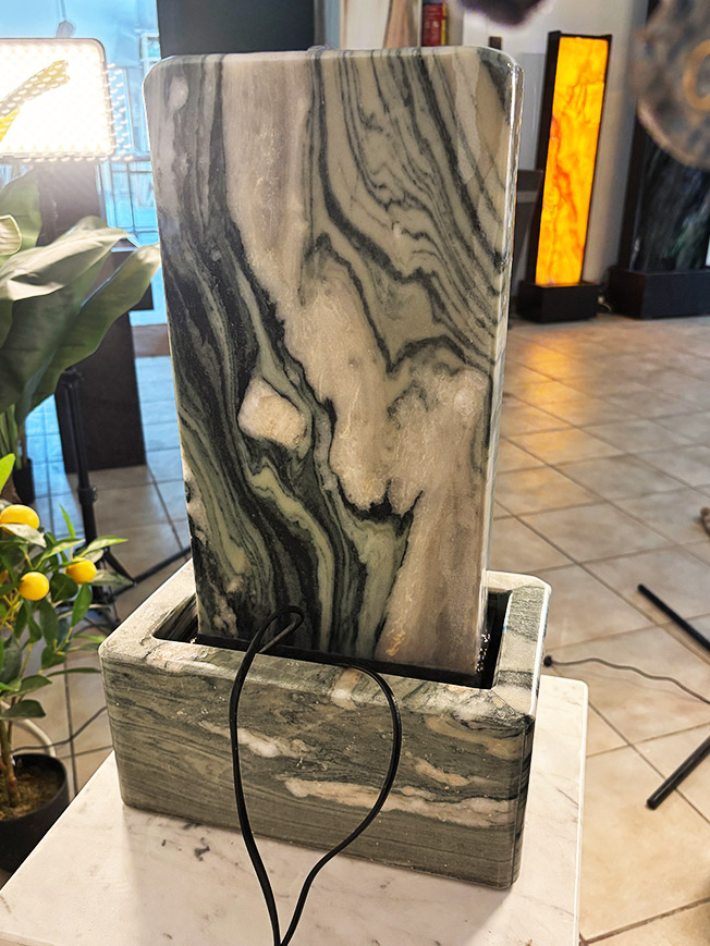 In der Wanne befinden sich die leise Qualitätspumpe und eine LED-Beleuchtung, die den Stein und den Wasserfluss stimmungsvoll in Szene setzen. Das Wasser wird kontinuierlich über das Oberteil gepumpt; bei trockener Raumluft sollte regelmäßig nachgefüllt werden, um den reibungslosen Betrieb zu gewährleisten.
