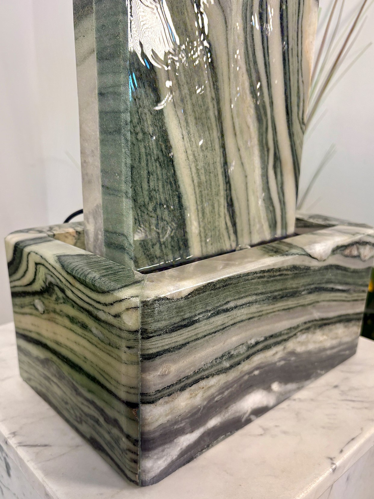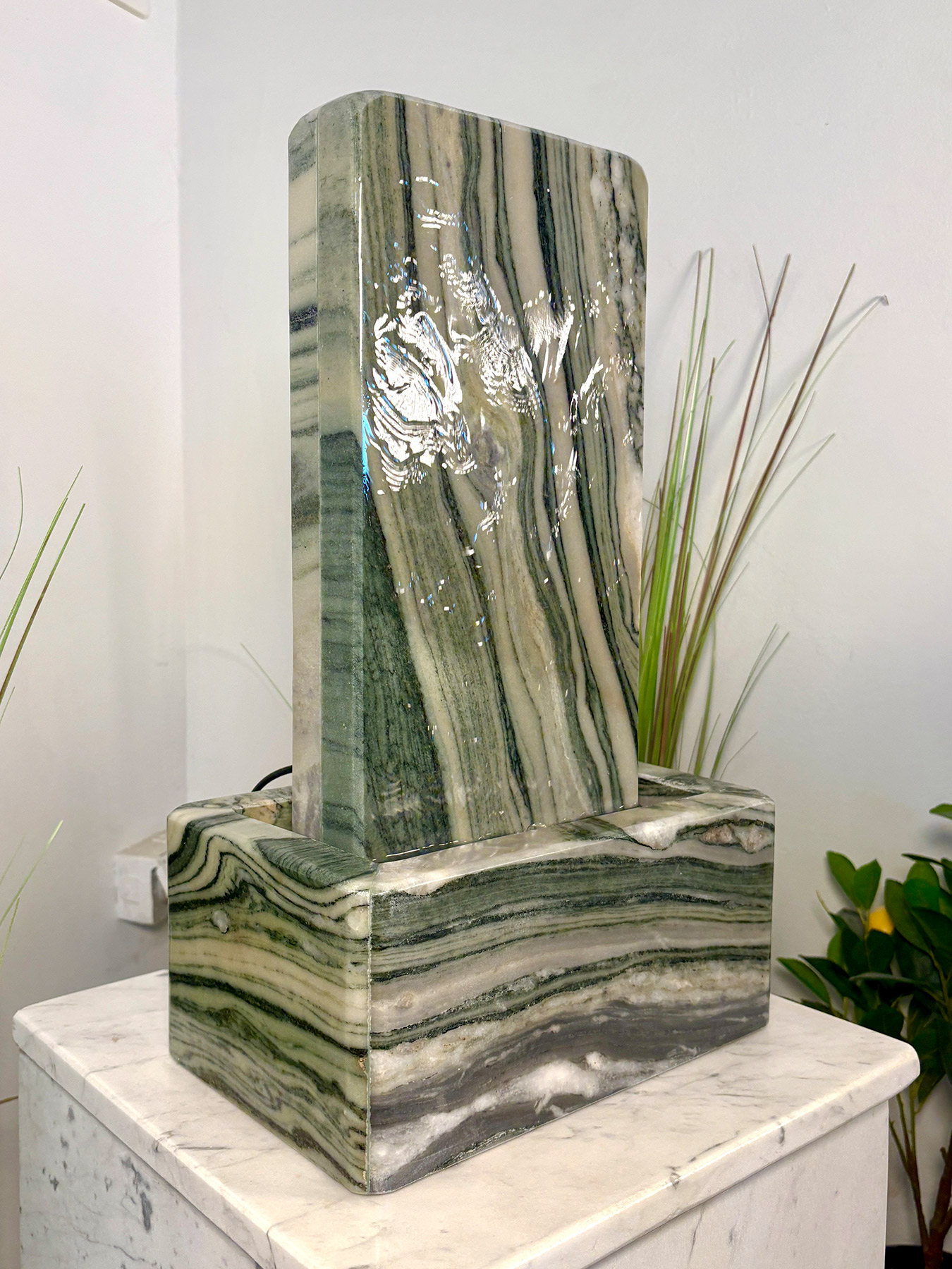 Diese edle Wasserwand aus griechischem Marmor „Cipollino“ vereint natürliche Eleganz mit feiner Handwerkskunst. Der außergewöhnliche Marmor besticht durch seine markante, wellenförmige Maserung, die jedes Stück zu einem einzigartigen Unikat macht und jedem Raum eine luxuriöse, natürliche Ausstrahlung verleiht.