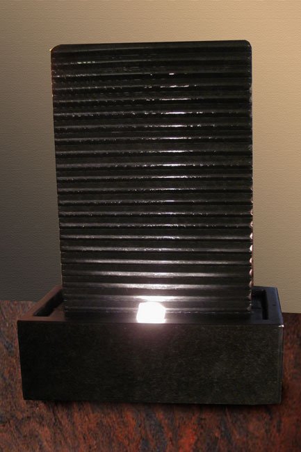 Die waschbrettartige Vorderfront wurde aus geklebten dreieckigen Steinprofilen hergestellt. in Kombination zu der Beleuchtung die von unten aus der Wanne kommt, ergibt sich ein sehr schönes, bewegtes Wasserbild.