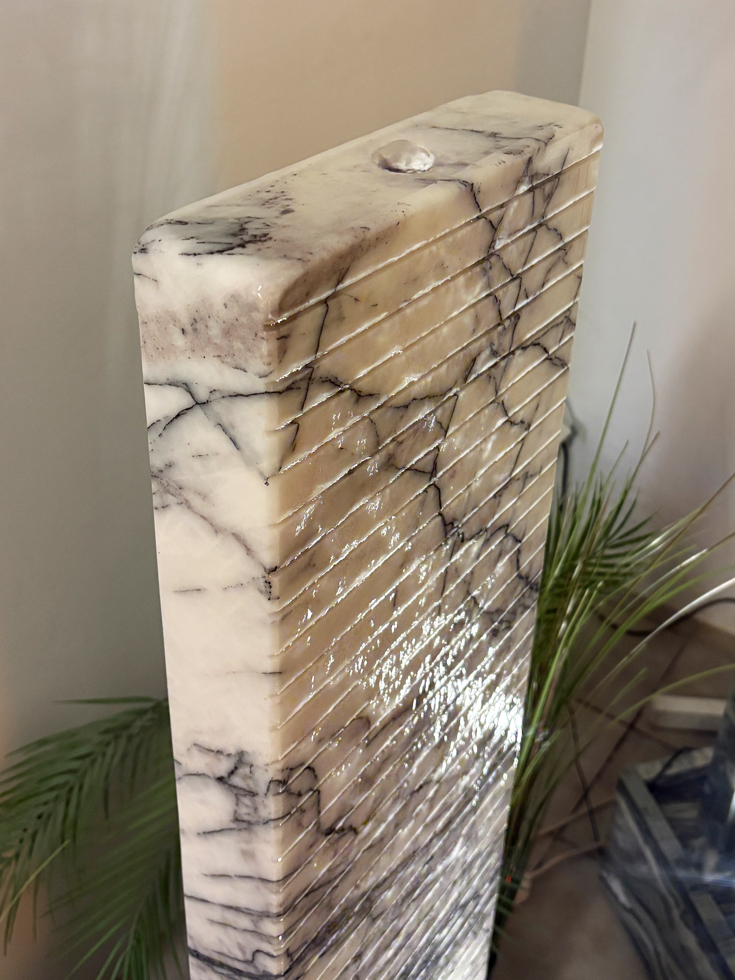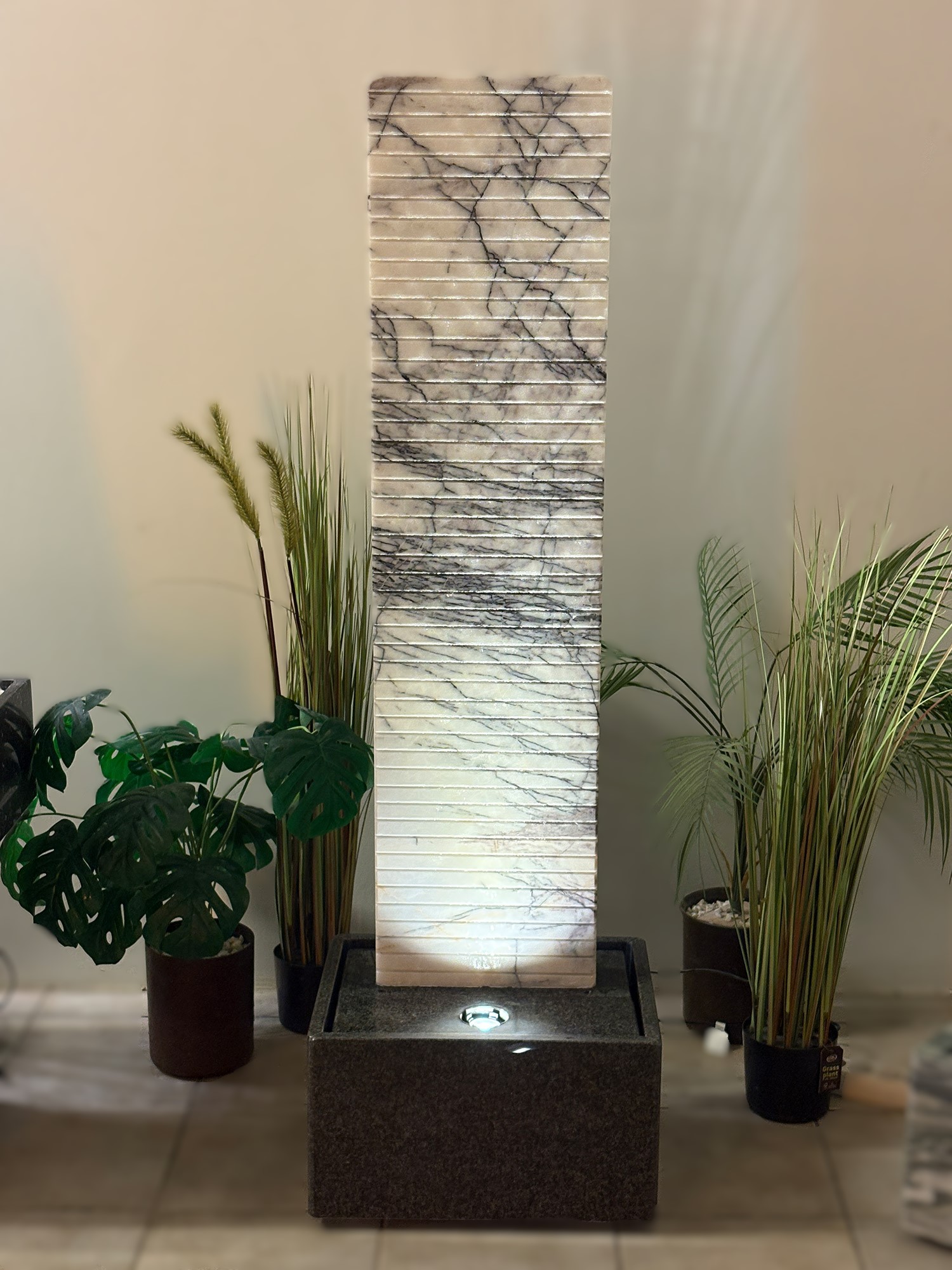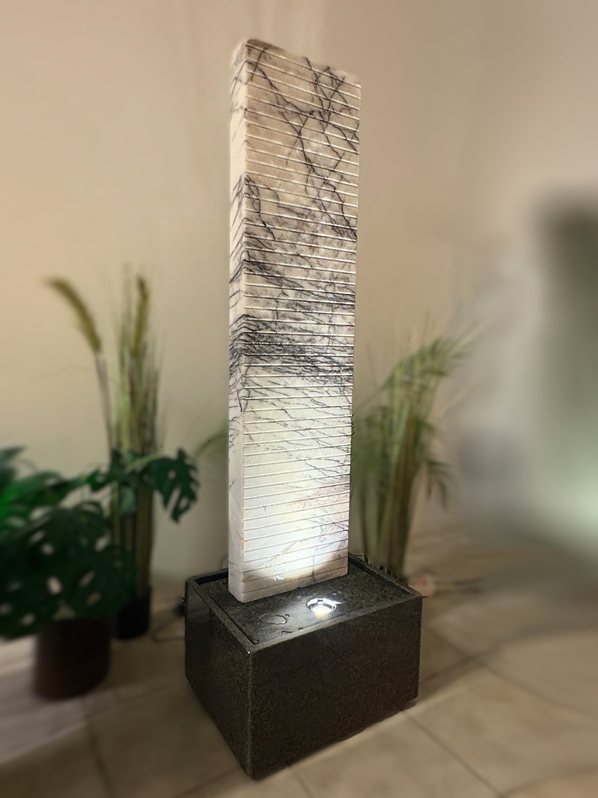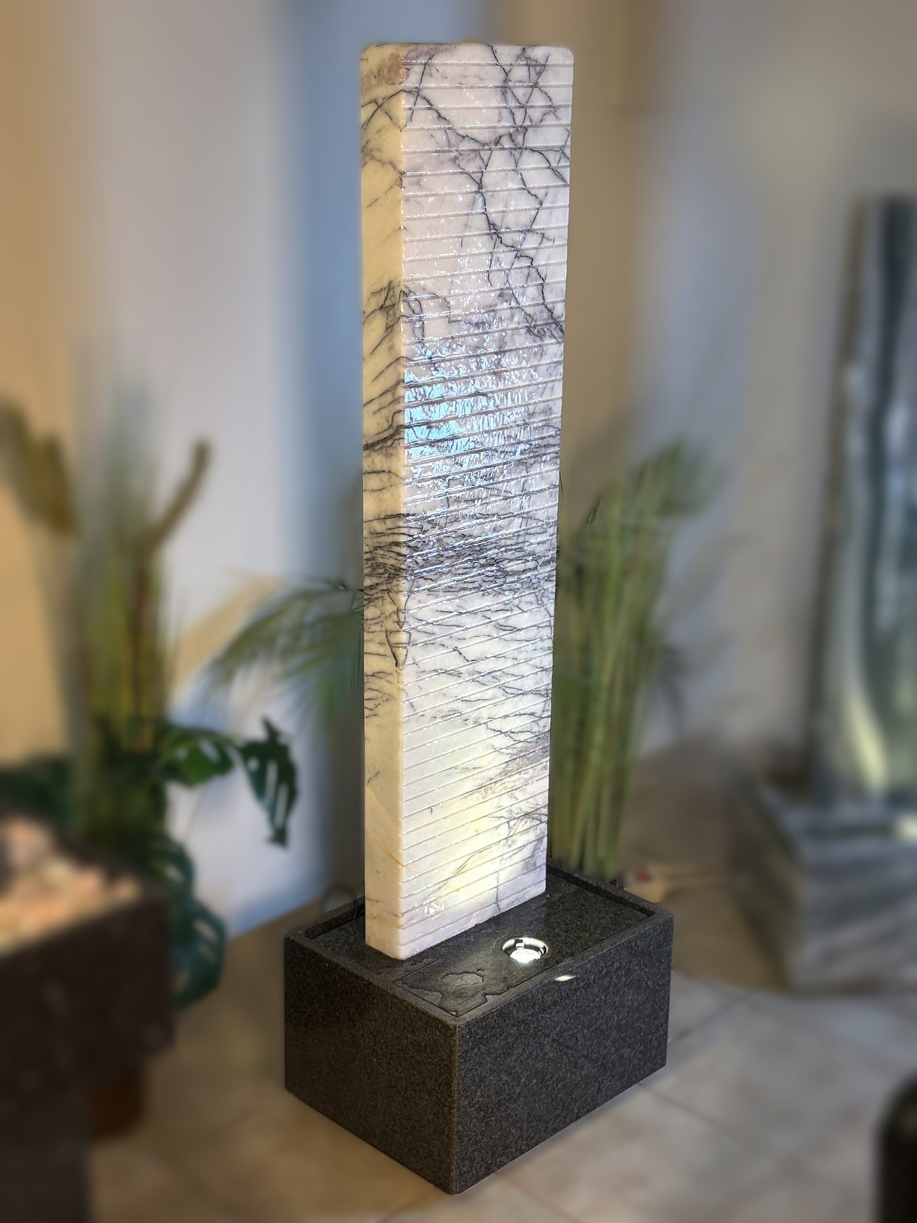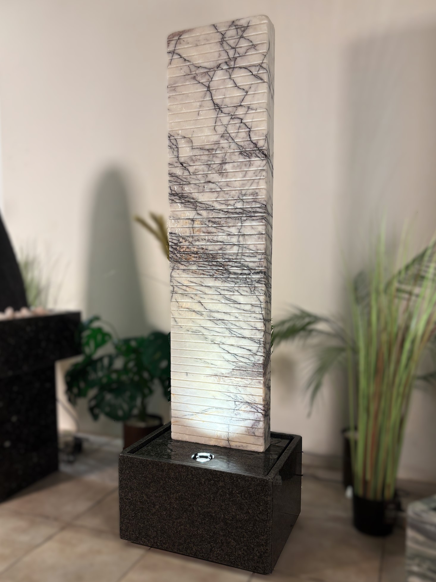 Dieser stilvolle Zimmerbrunnen ist weit mehr als ein Blickfang; er ist zugleich ein natürlicher Luftbefeuchter, der sich harmonisch in jedes Wohnambiente einfügt. Über die feinen Rillen der Marmor-Wasserwand fließt das Wasser sanft herab und entfaltet in Kombination mit dem LED-Scheinwerfer faszinierende Licht- und Bewegungseffekte, die Ihren Raum in eine Atmosphäre von Ruhe und Eleganz tauchen.